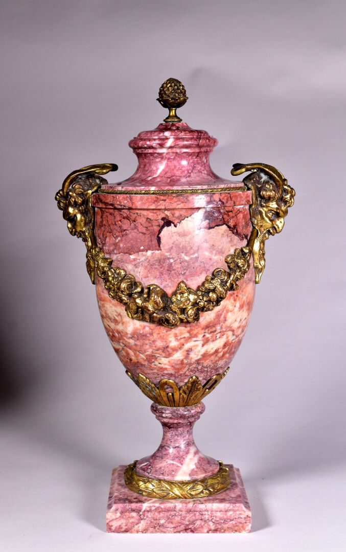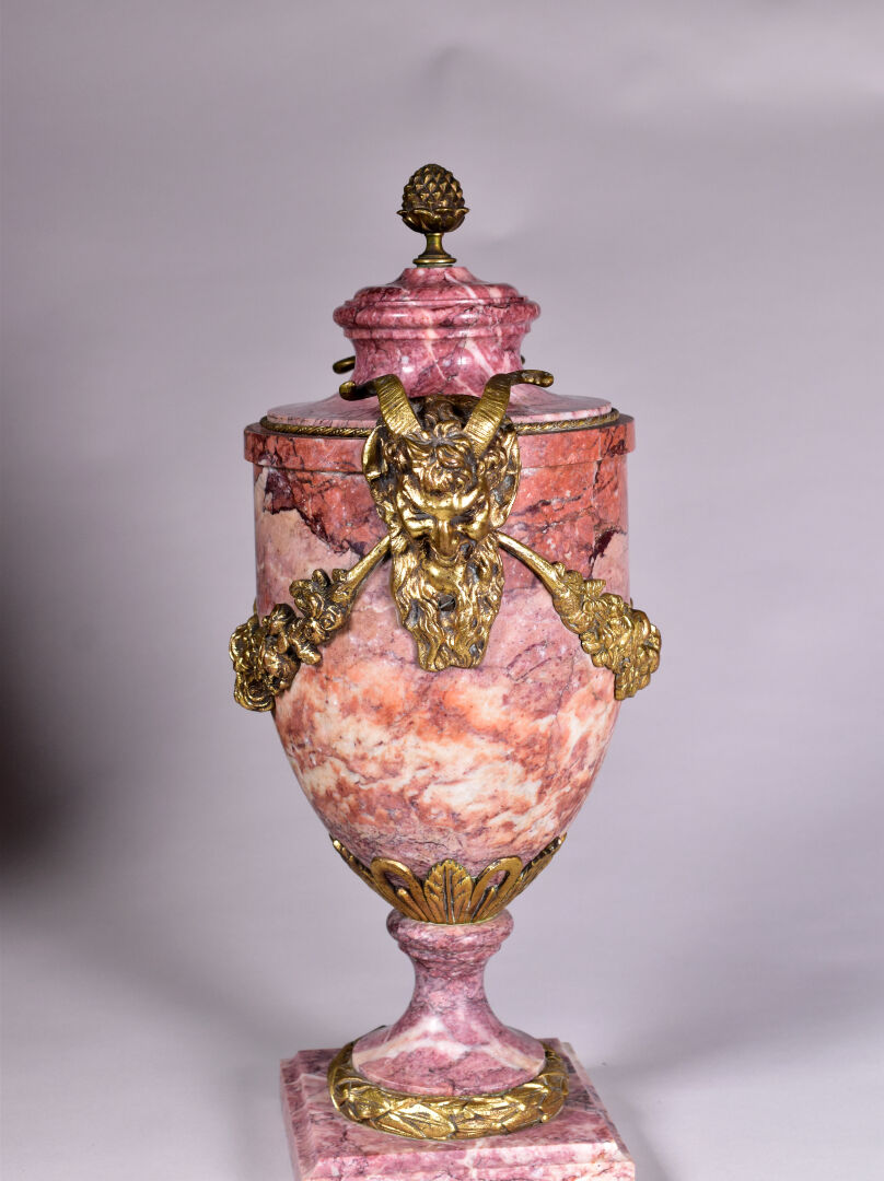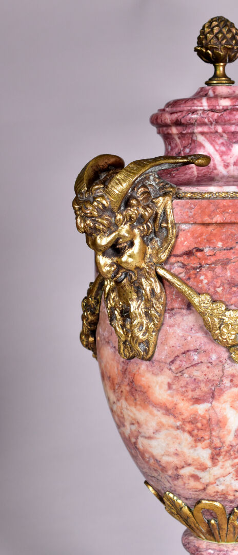 Paire de cassolettes en marbre rose et bronze ciselé doré. Les anses formées de mascarons de faunes, décor de guirlandes de fleurs et de laurier. Fin du XIXe siècle. Haut. : 47 cm.