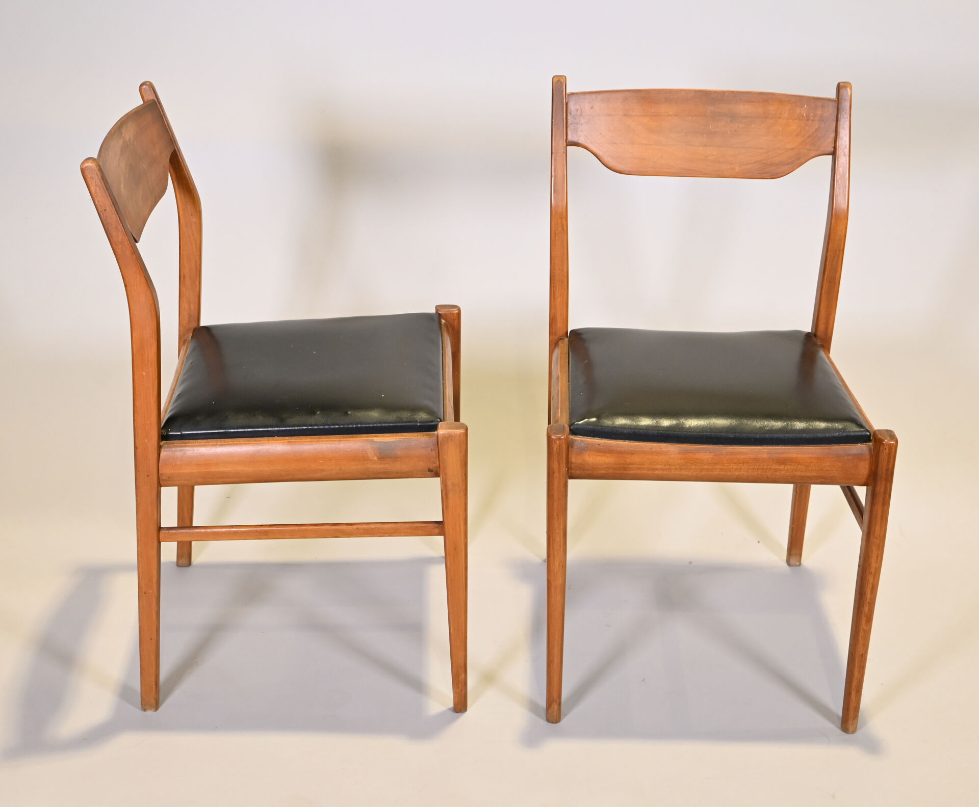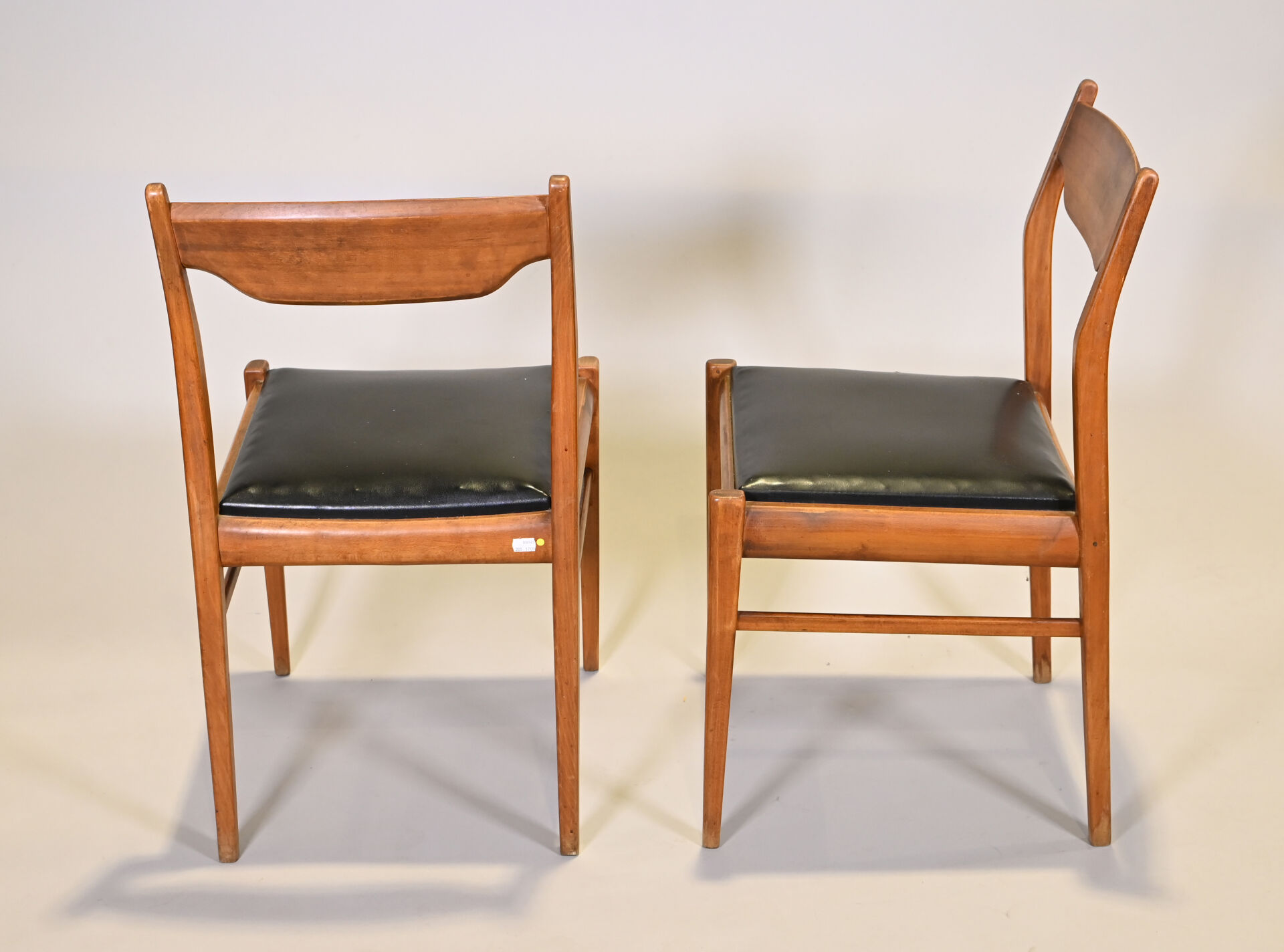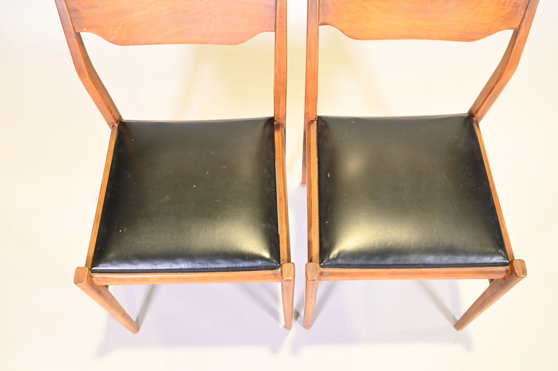 Paire de chaises en bois légèrement courbé à garniture de skaï noir (quelques usures). Travail probablement scandinave. Vers 1960. Haut. : 82 cm.