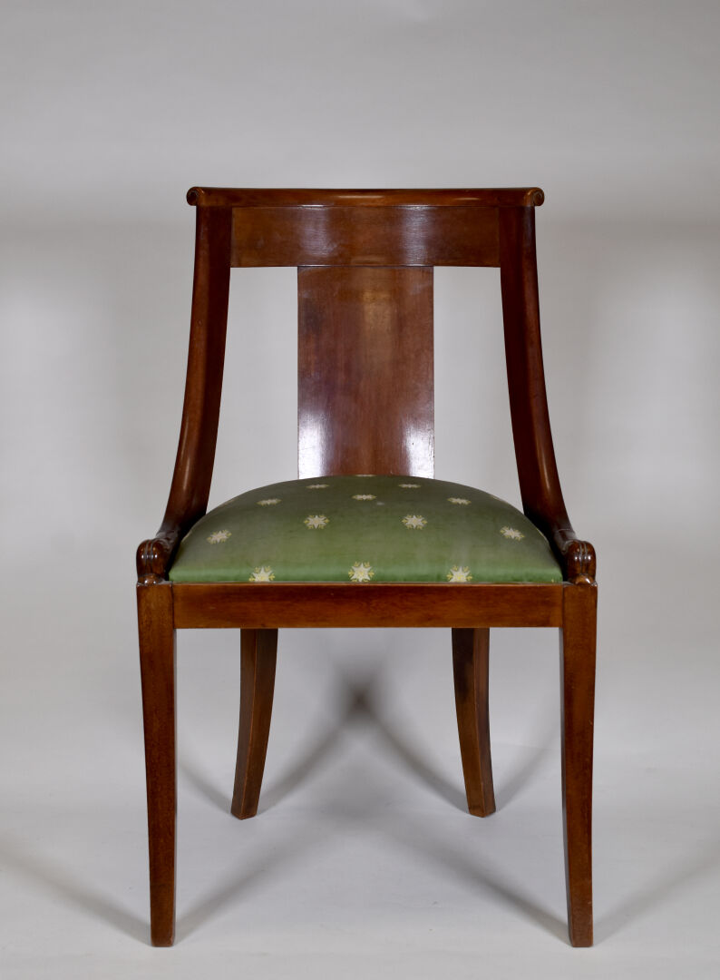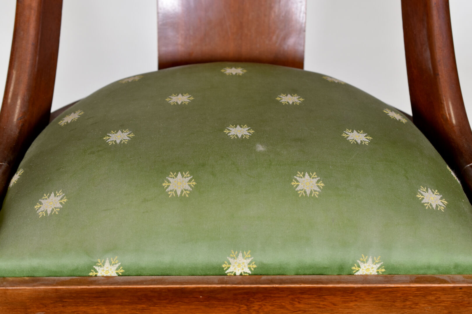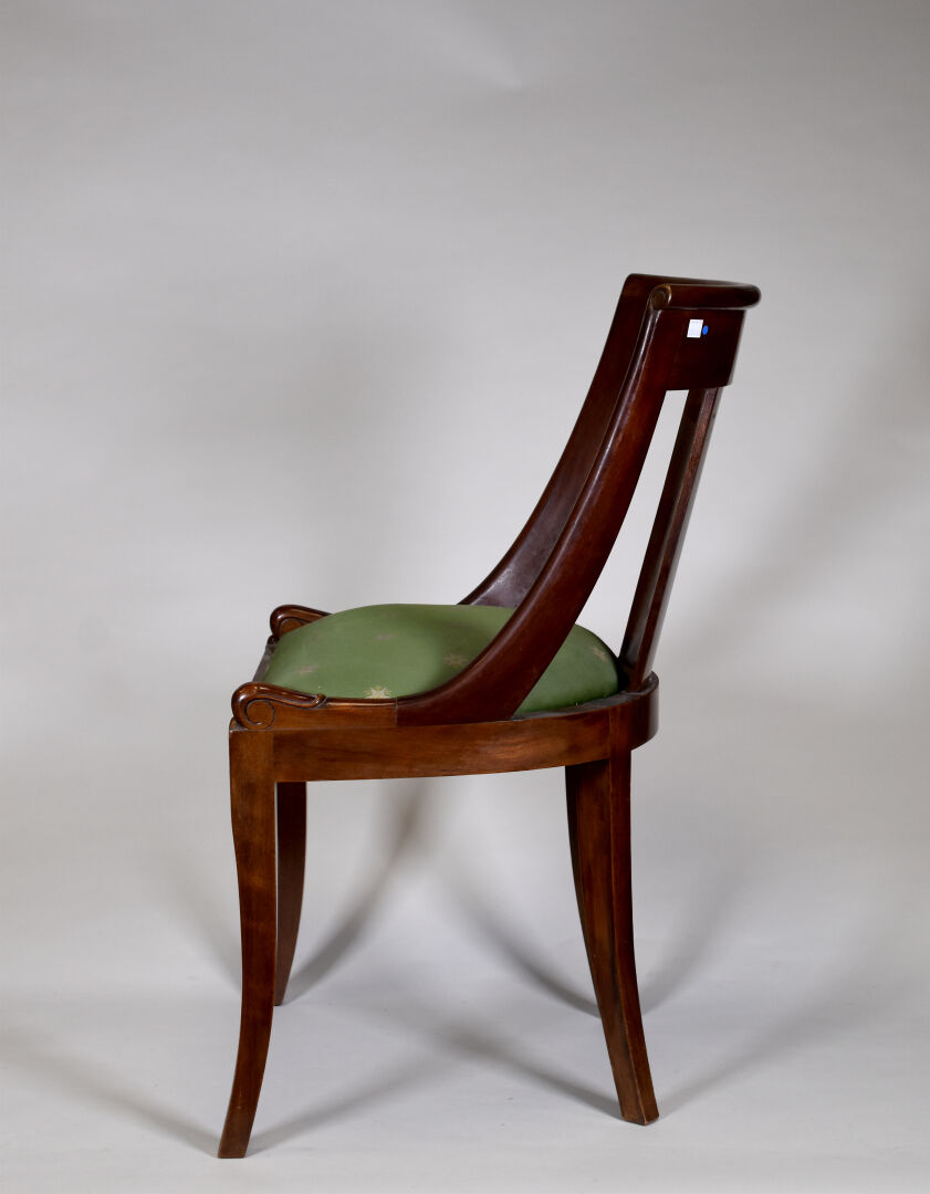 Paire de chaises gondole en acajou, les pieds sabre. XIXe siècle. Garniture de satin vert à semi d’étoile. Haut. : 79 cm.
