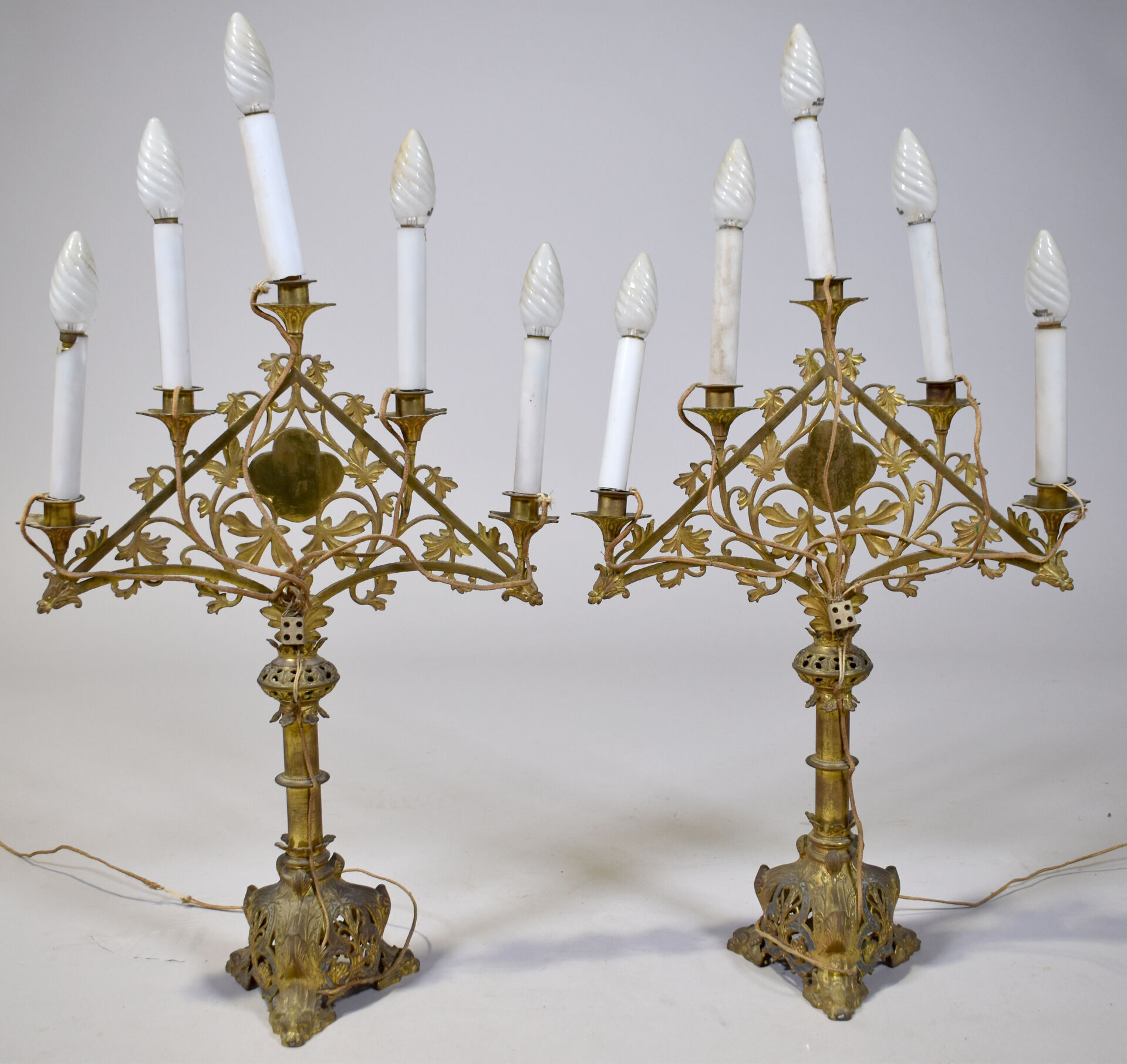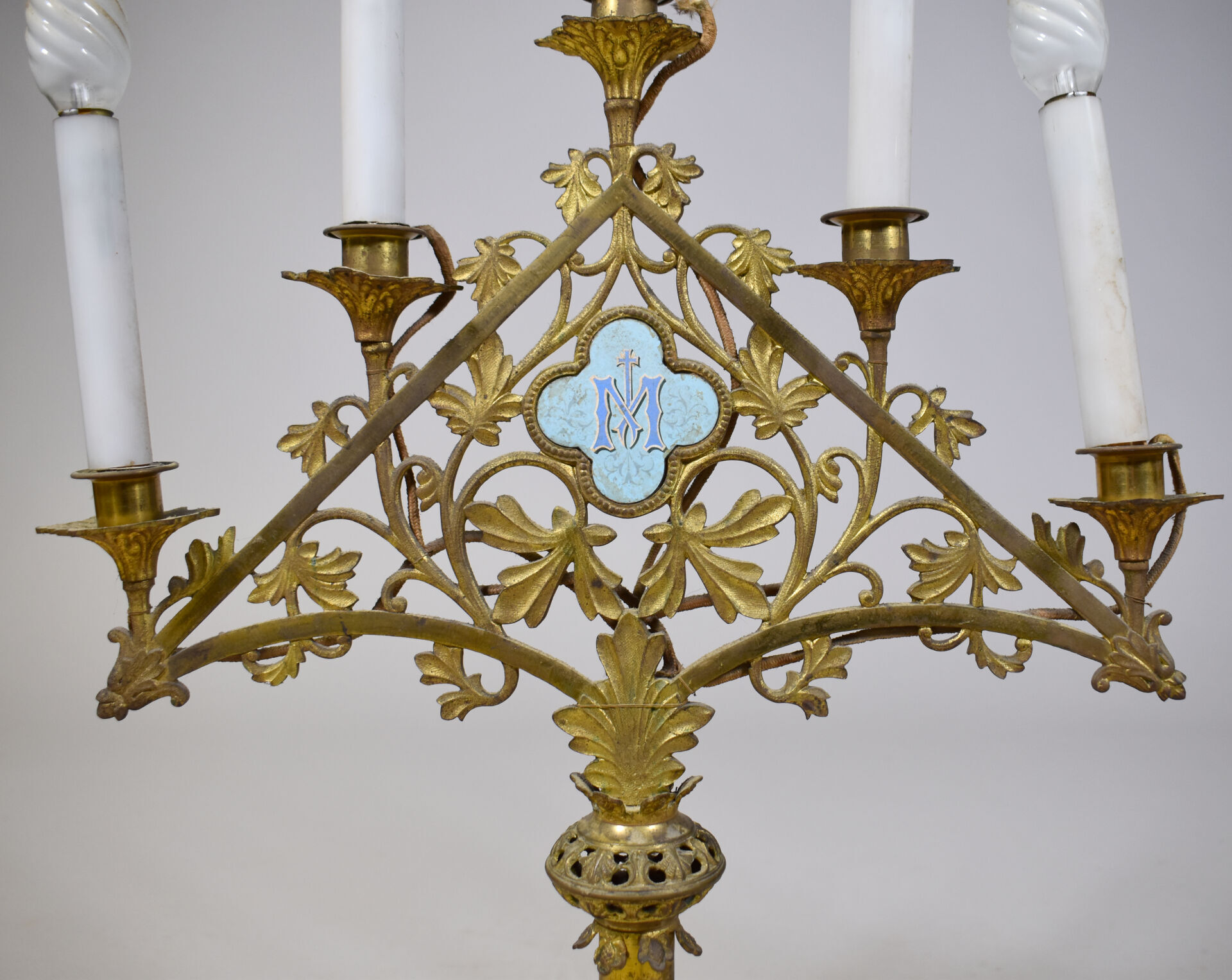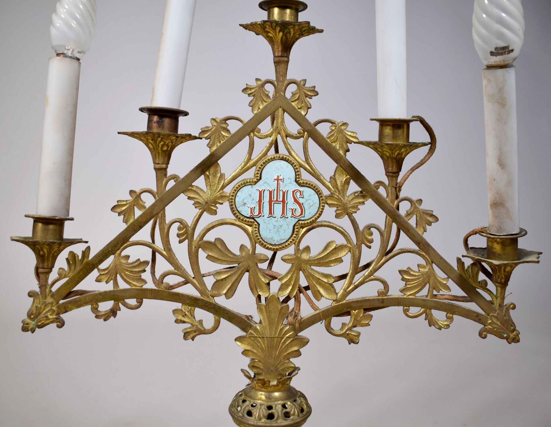 Paire de chandeliers d’église en bronze et métal doré à décor d’un triangle ajouré de végétaux, dans un quartefeuille en porcelaine les lettres JHS émaillées. L’ensemble surmonté de cinq lumières. Electrifiés Haut. : 57 cm (hors douilles et ampoules).