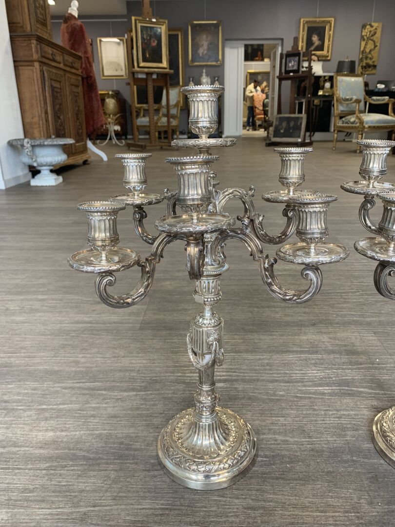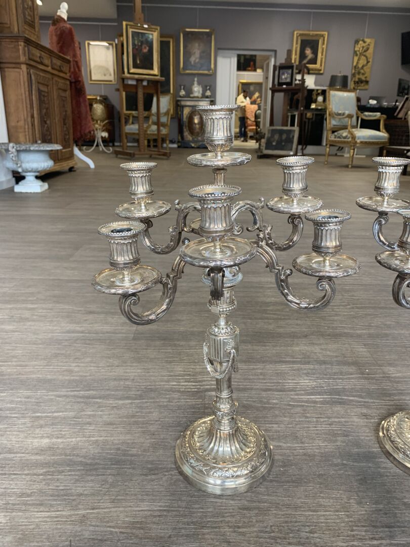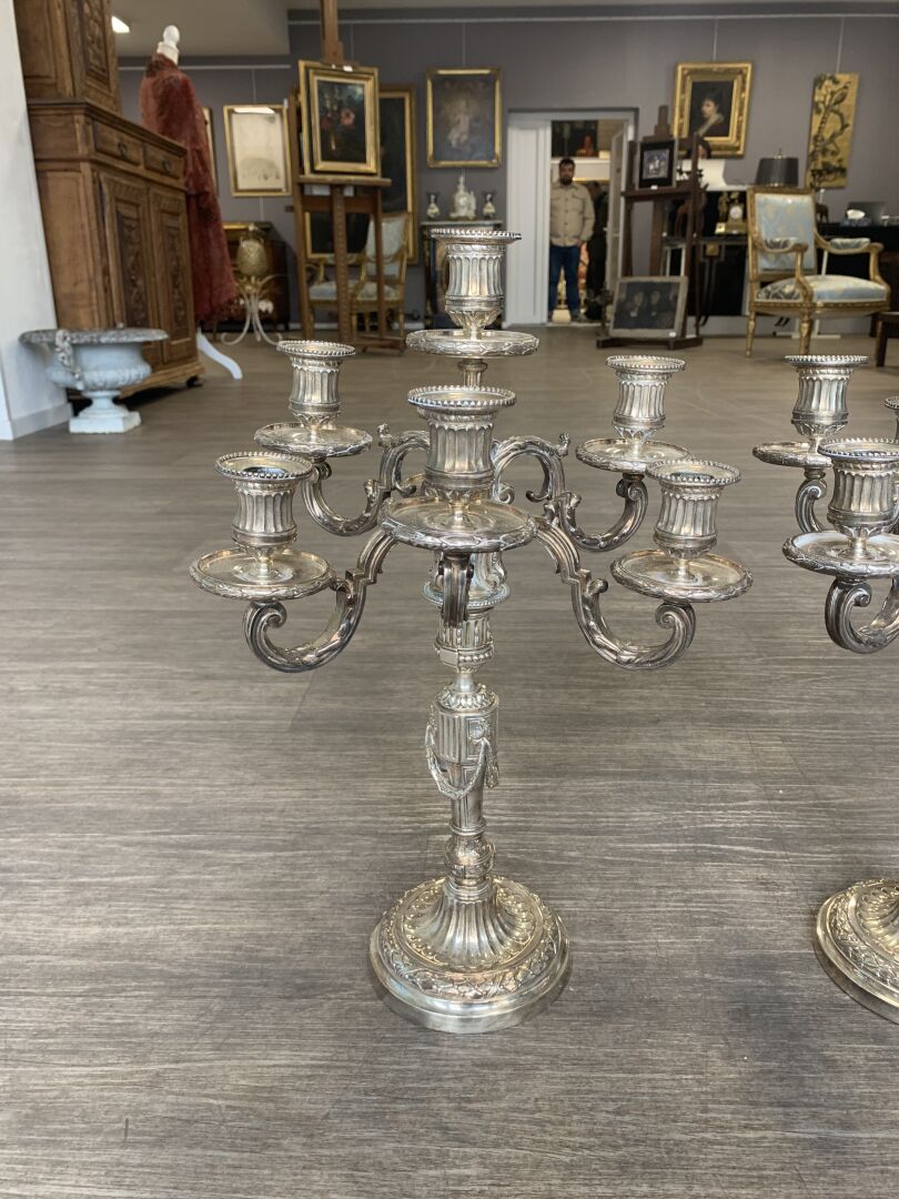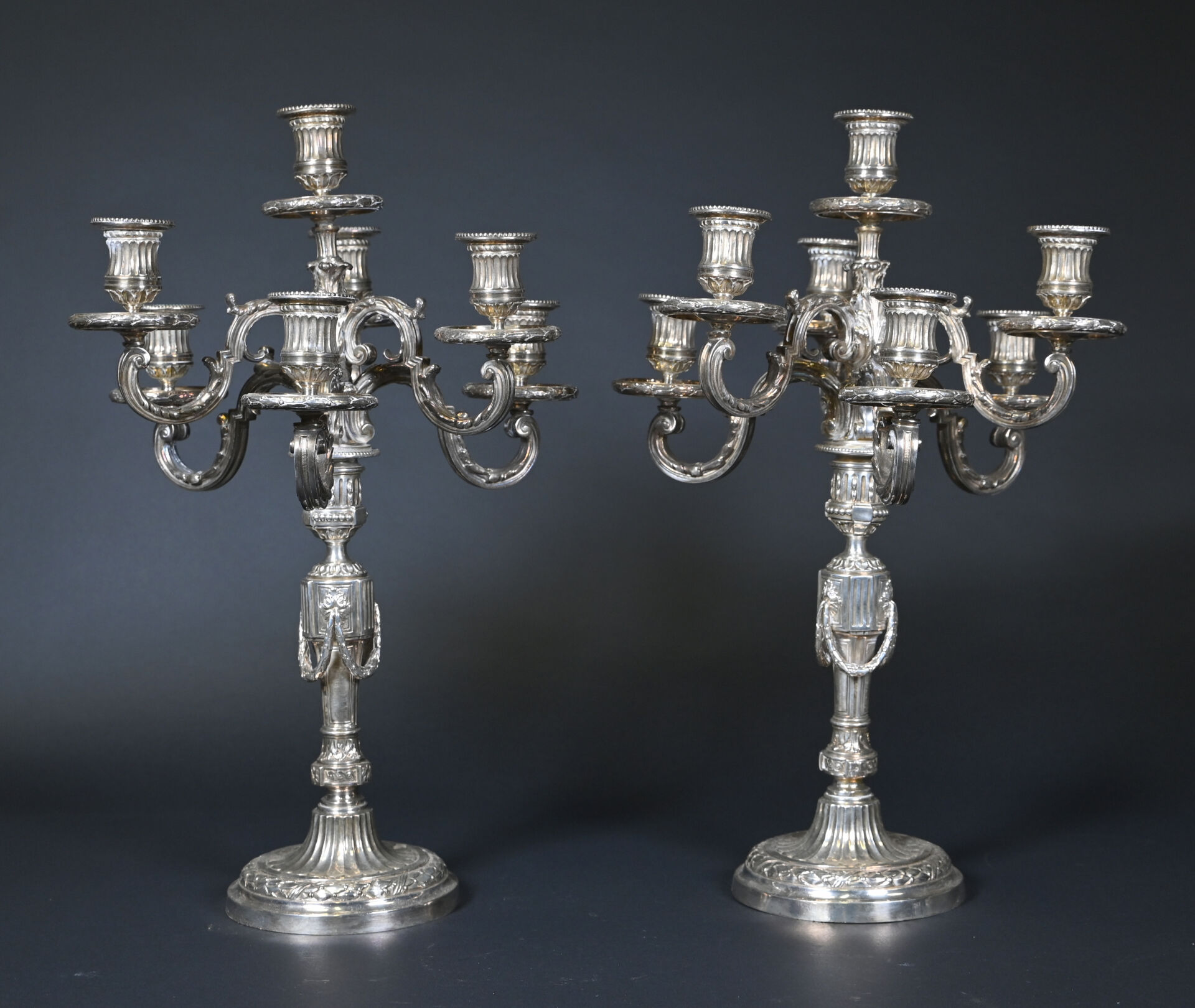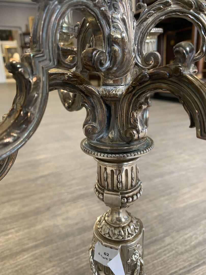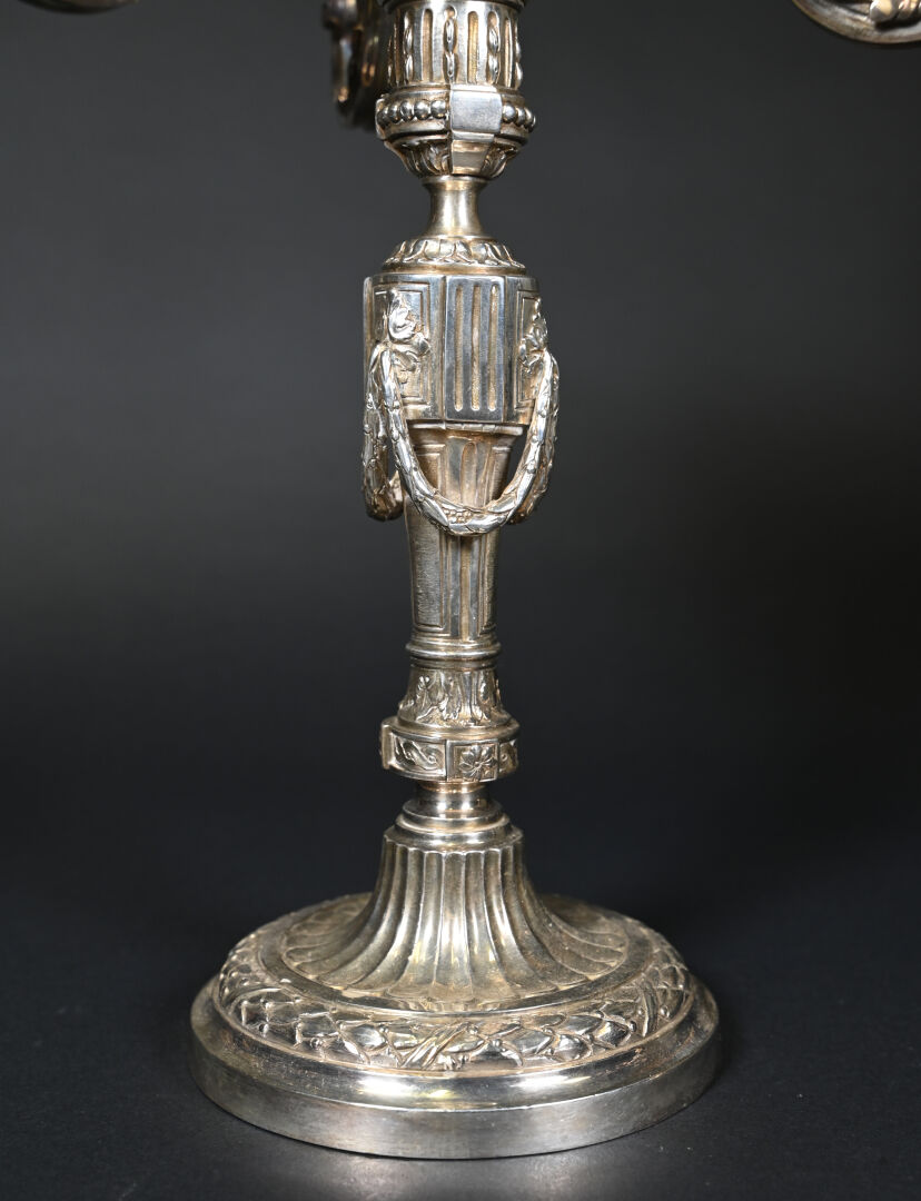 Paire de chandeliers en bronze argenté à 6 bras en console et 7 lumières (les parties supérieures des fûts supportant le feu central légèrement tordues, petite craquelure). Les fût cannelés, les bases circulaires à couronne de laurier. Style Louis XVI. Haut. : 50,5 cm.