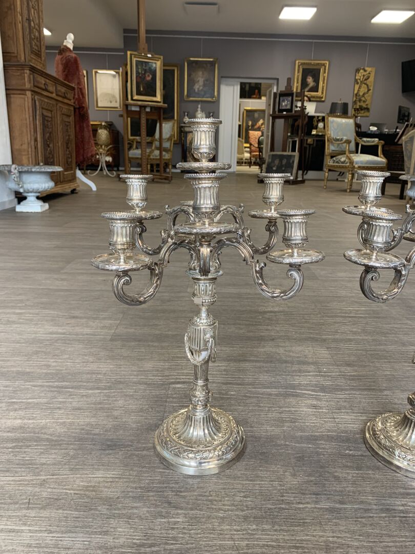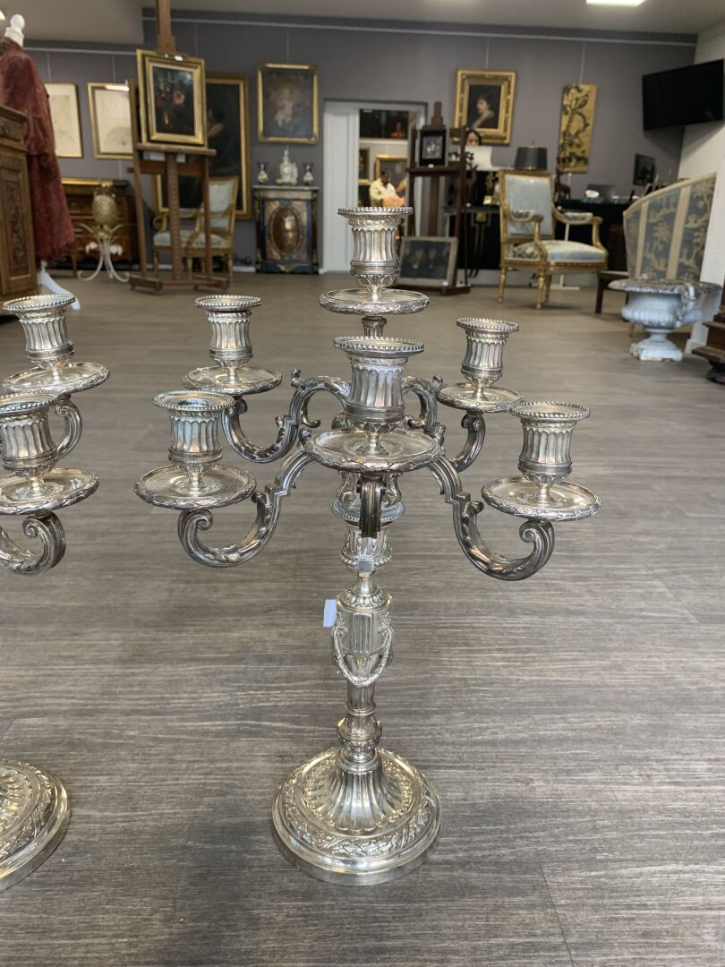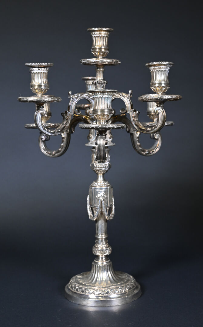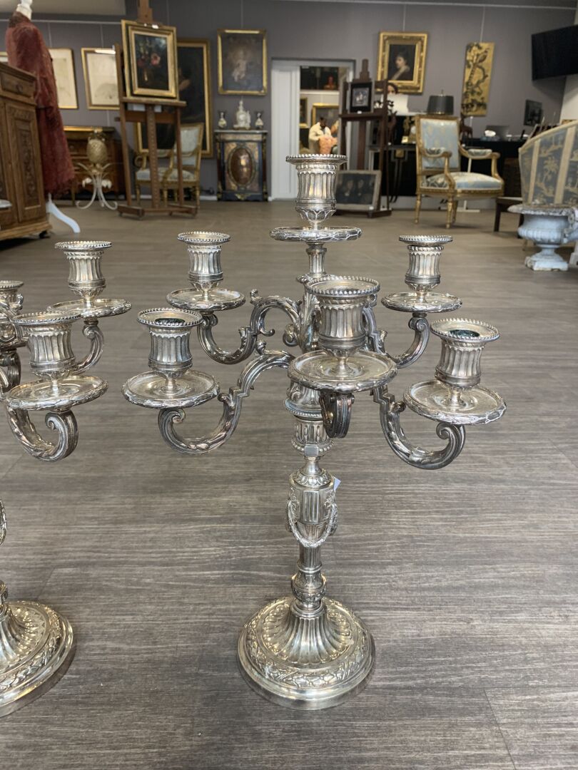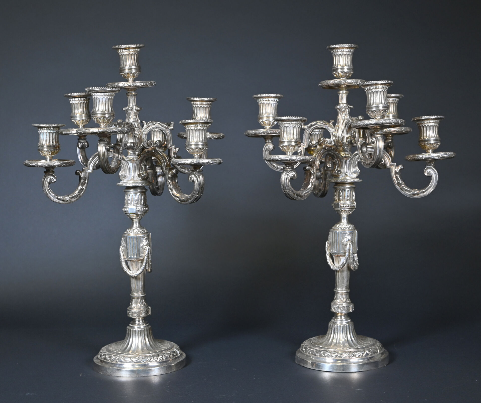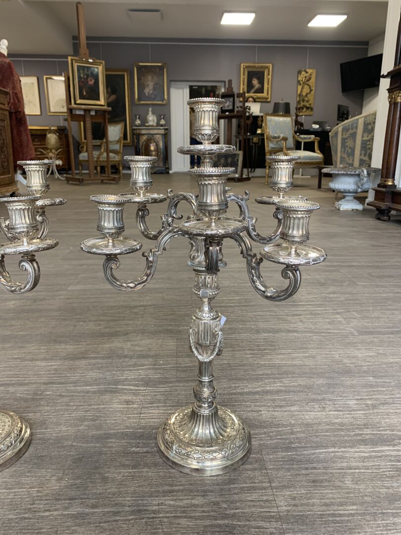 Paire de chandeliers en bronze argenté à 6 bras en console et 7 lumières (les parties supérieures des fûts supportant le feu central légèrement tordues, petite craquelure). Les fût cannelés, les bases circulaires à couronne de laurier. Style Louis XVI. Haut. : 50,5 cm.