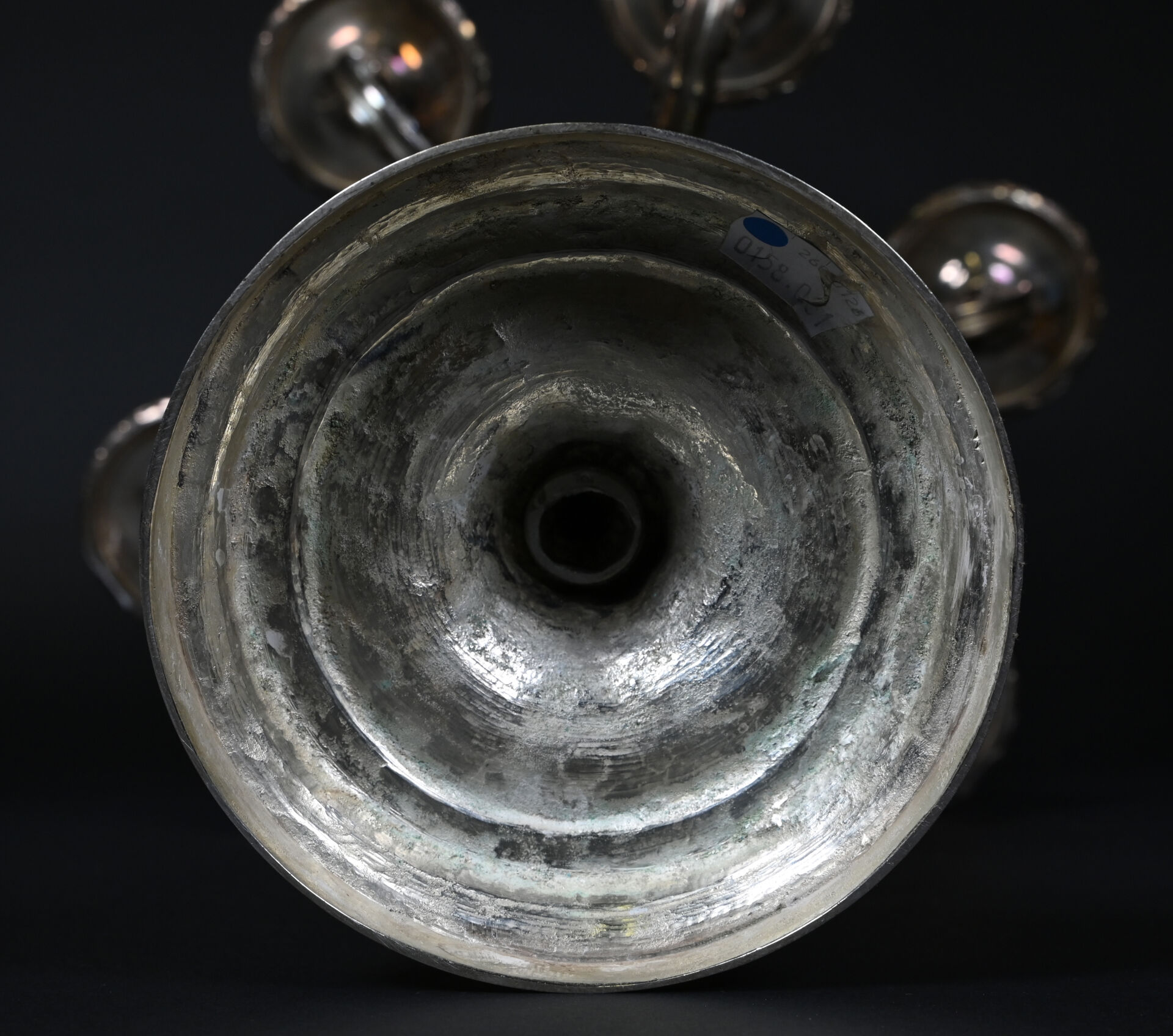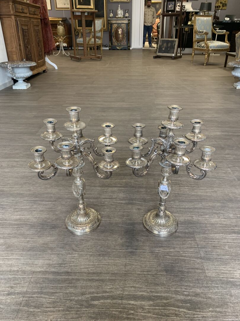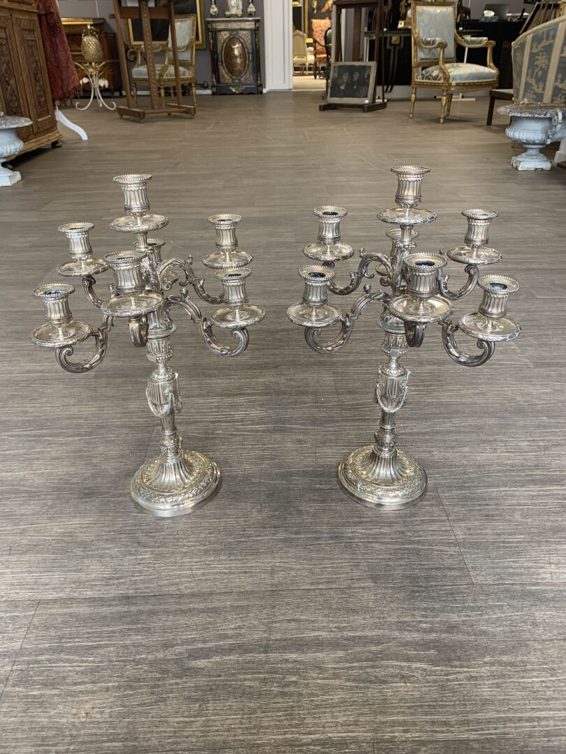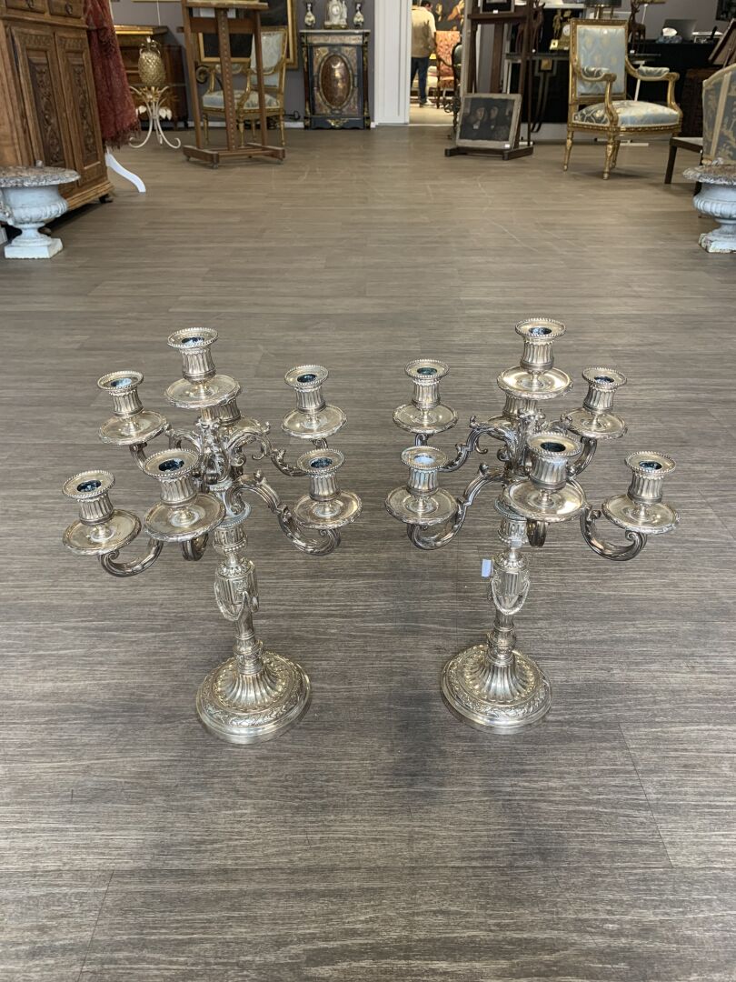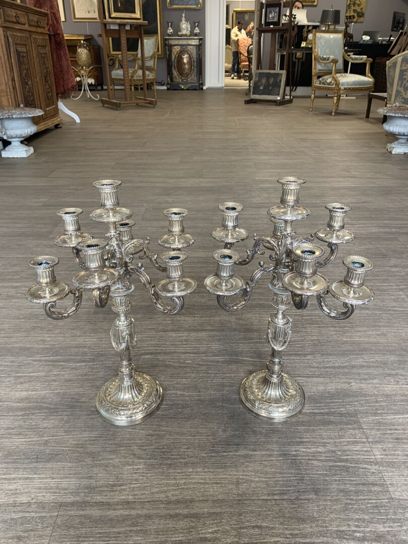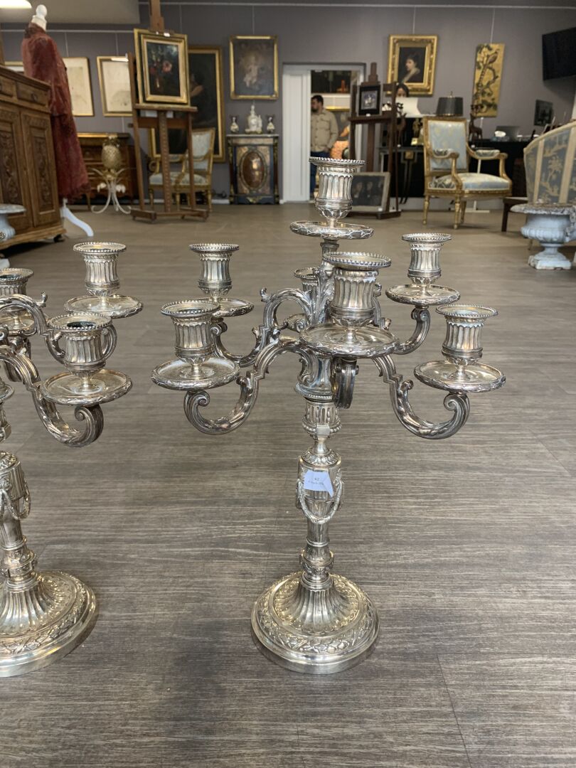Paire de chandeliers en bronze argenté à 6 bras en console et 7 lumières (les parties supérieures des fûts supportant le feu central légèrement tordues, petite craquelure). Les fût cannelés, les bases circulaires à couronne de laurier. Style Louis XVI. Haut. : 50,5 cm.