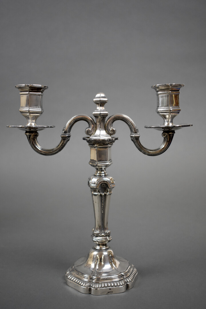 Paire de chandeliers en métal argenté à deux bras de lumière en console, le fût à décor de coquilles, la base polylobée. Style Régence, Fin du XIXe ou début du XXe siècle. Haut. : 26 cm.