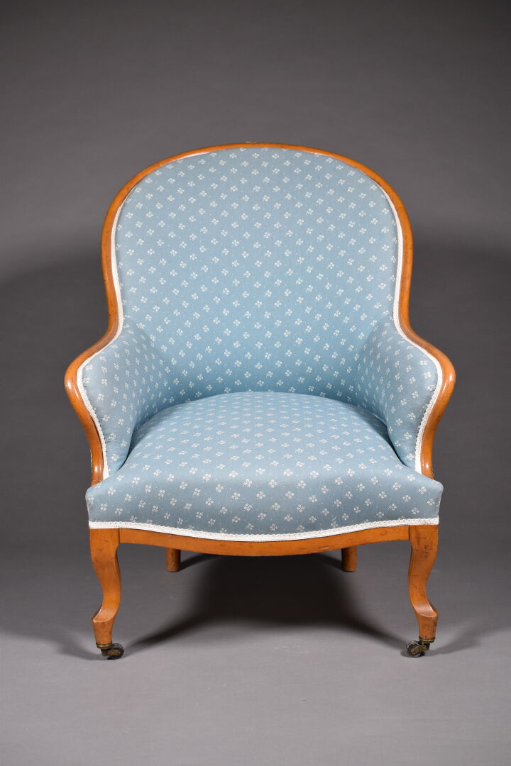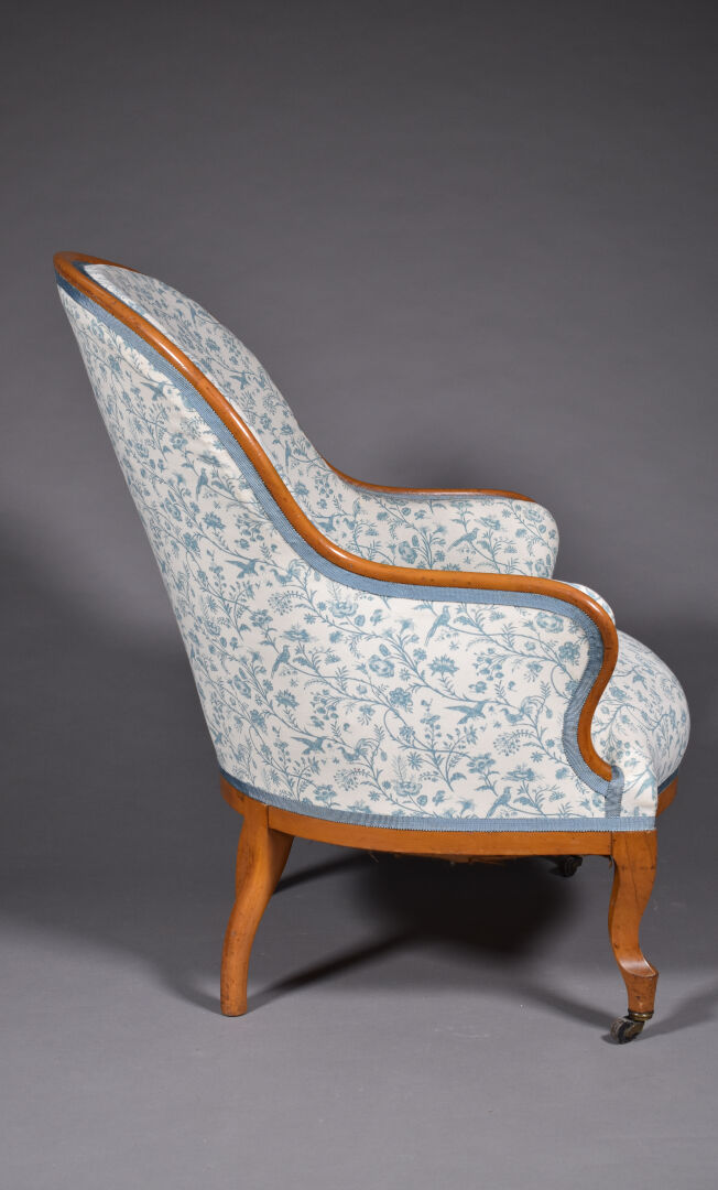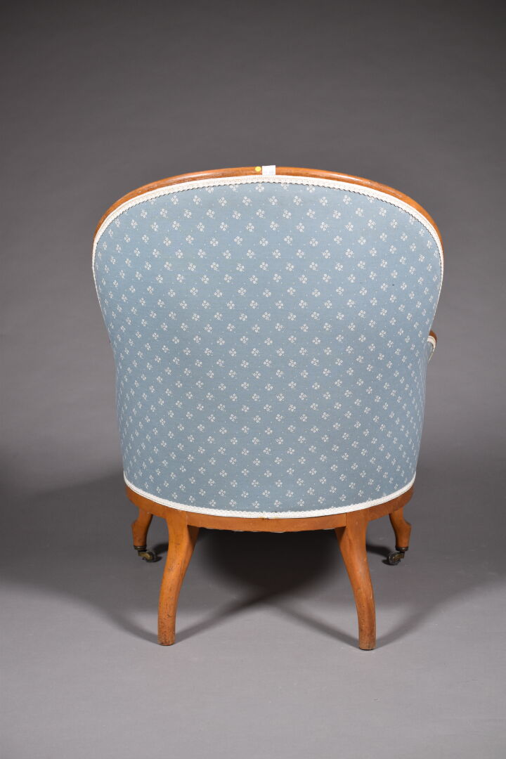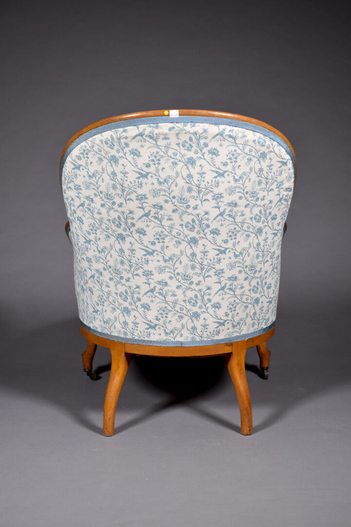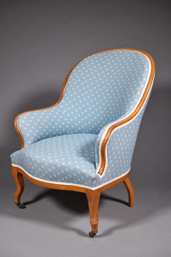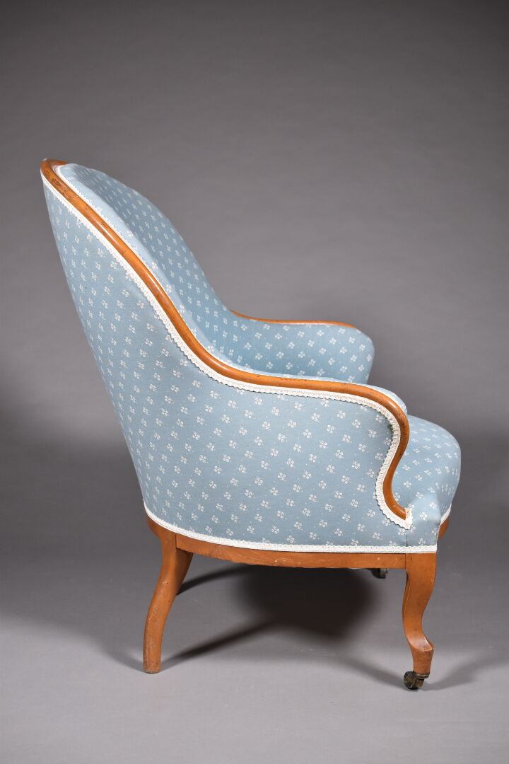 Paire de chauffeuses crapaud en bois blond regarnies de tissus bleu et crème. Pieds antérieurs à roulettes. Epoque Napoléon III. Haut. : 86 cm.