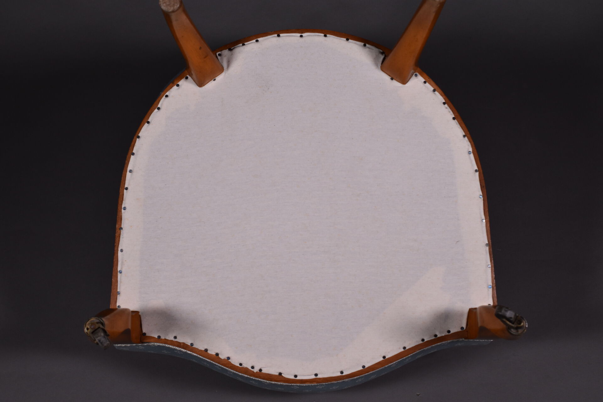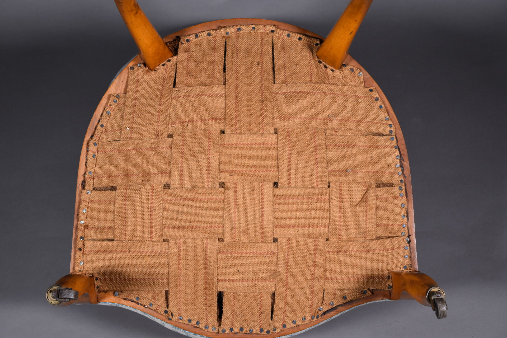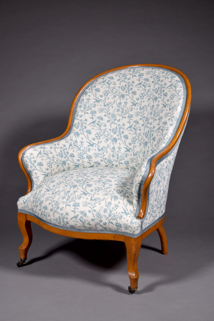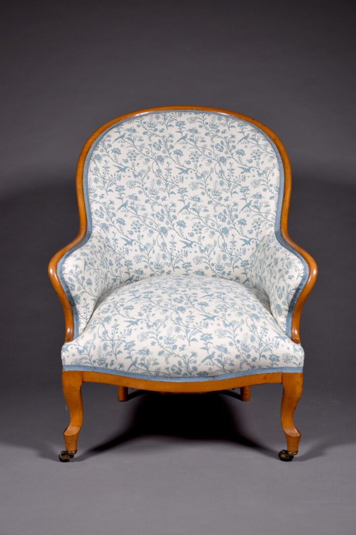 Paire de chauffeuses crapaud en bois blond regarnies de tissus bleu et crème. Pieds antérieurs à roulettes. Epoque Napoléon III. Haut. : 86 cm.