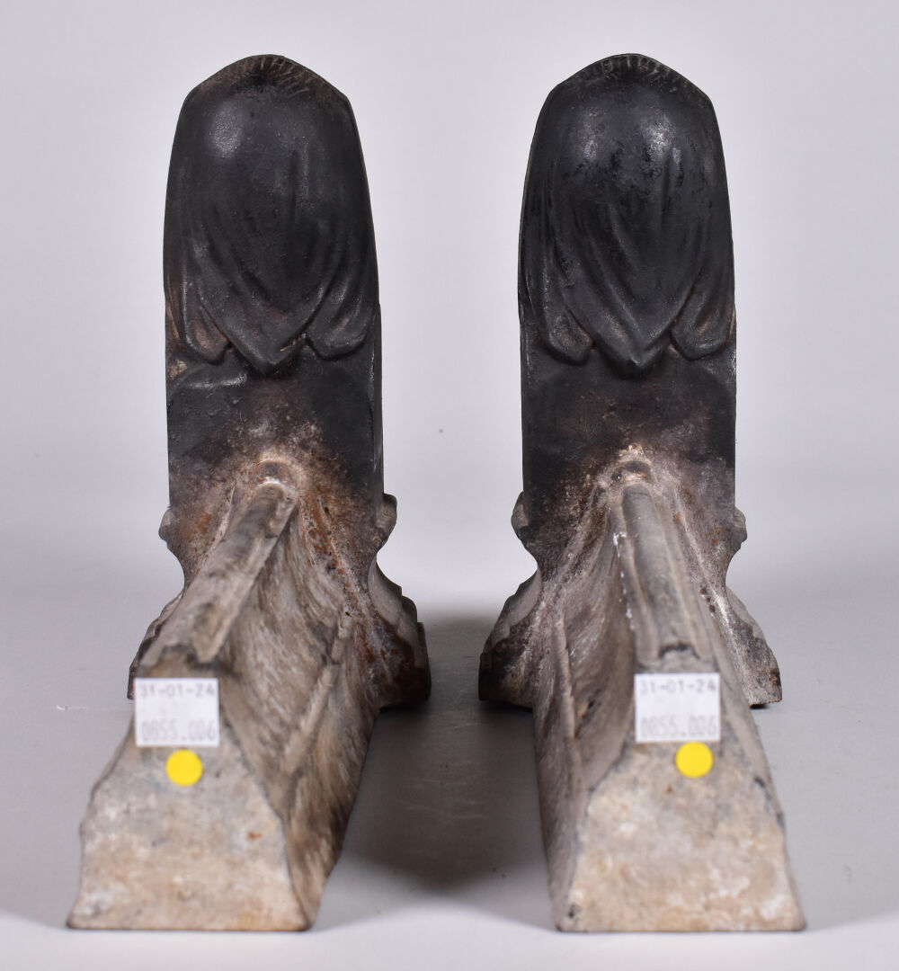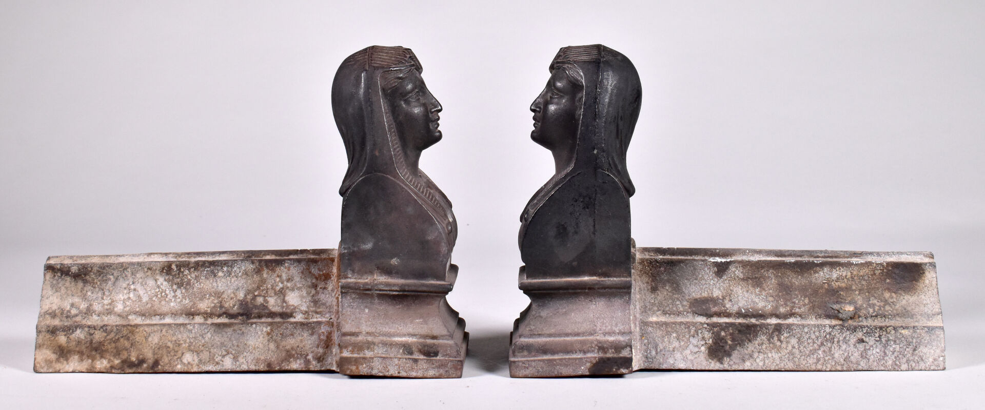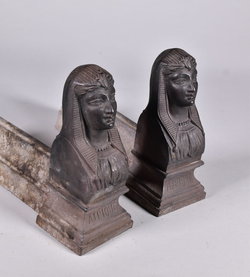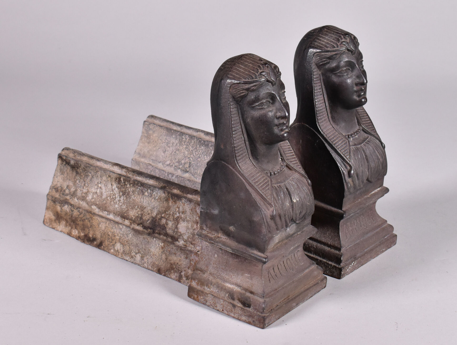 Paire de chenets en fonte ornés de sphynges titrés « Afrique ». XIXe siècle. Haut. : 21,5 cm.