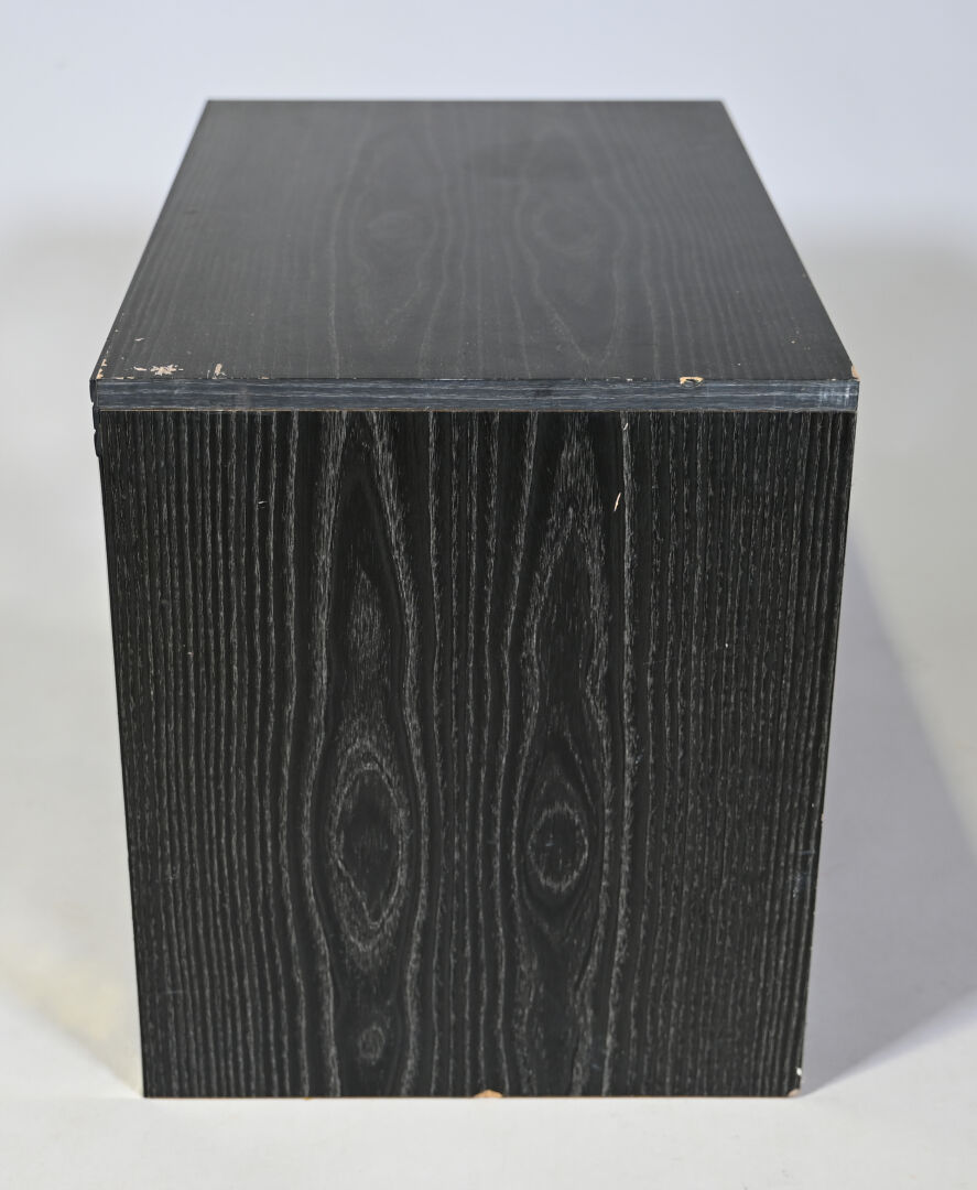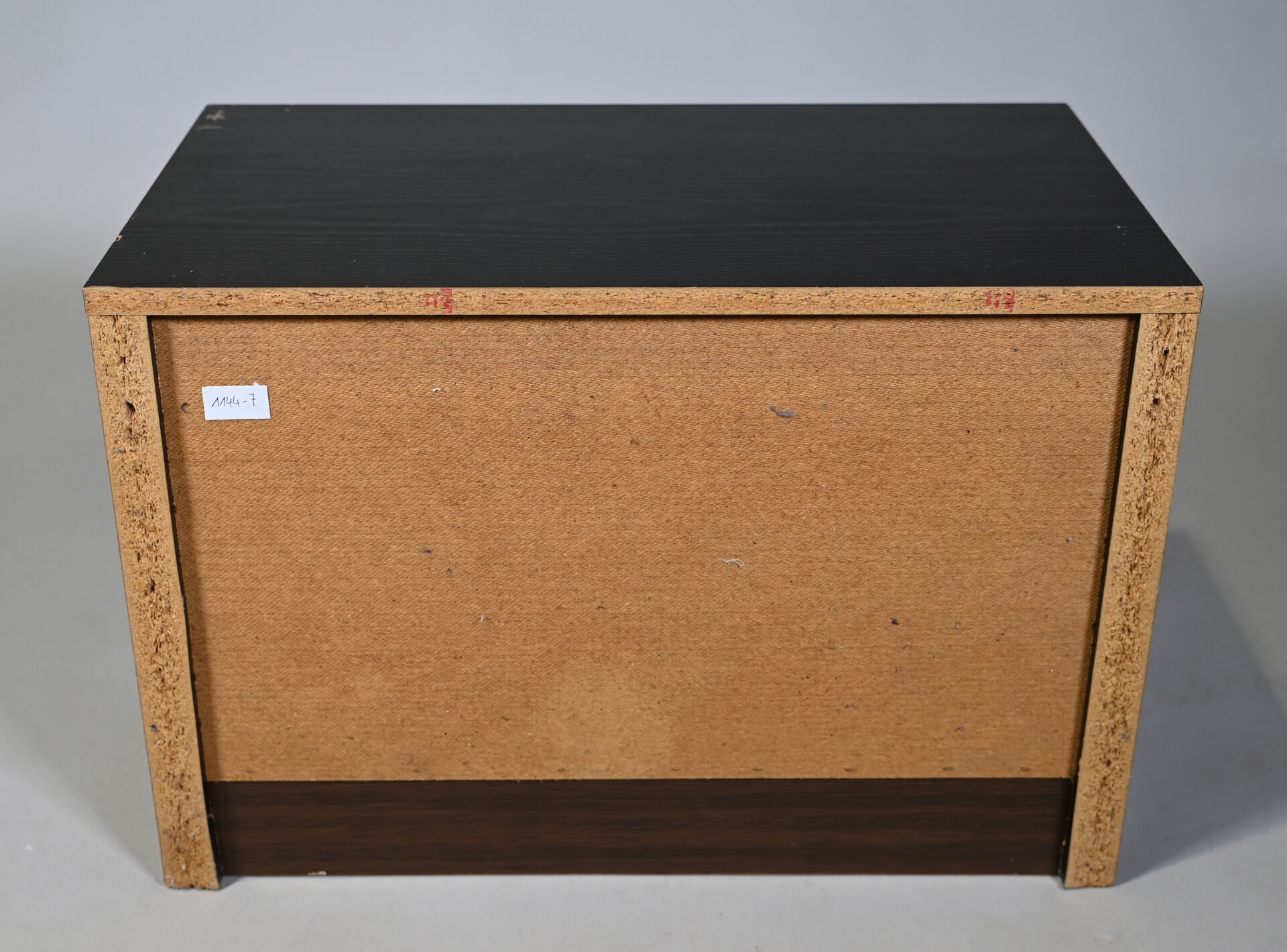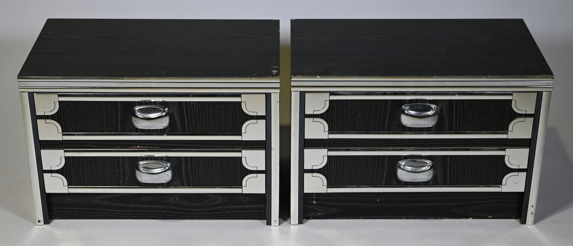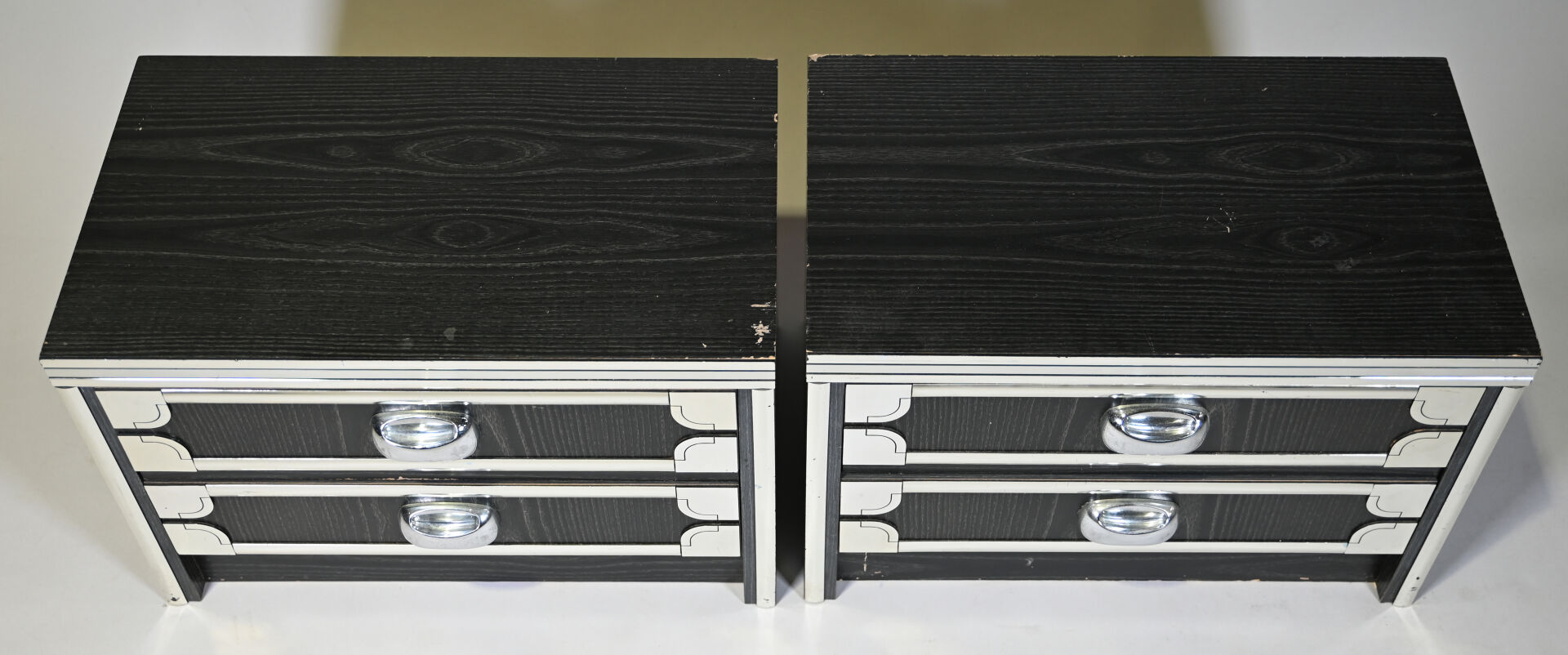 Paire de chevet en aggloméré laqué noir et plaques de métal ouvrant à deux tiroiors. Vers 1980. Haut. : 43 cm. Larg. 63 cm. Prof. : 37,5 cm.