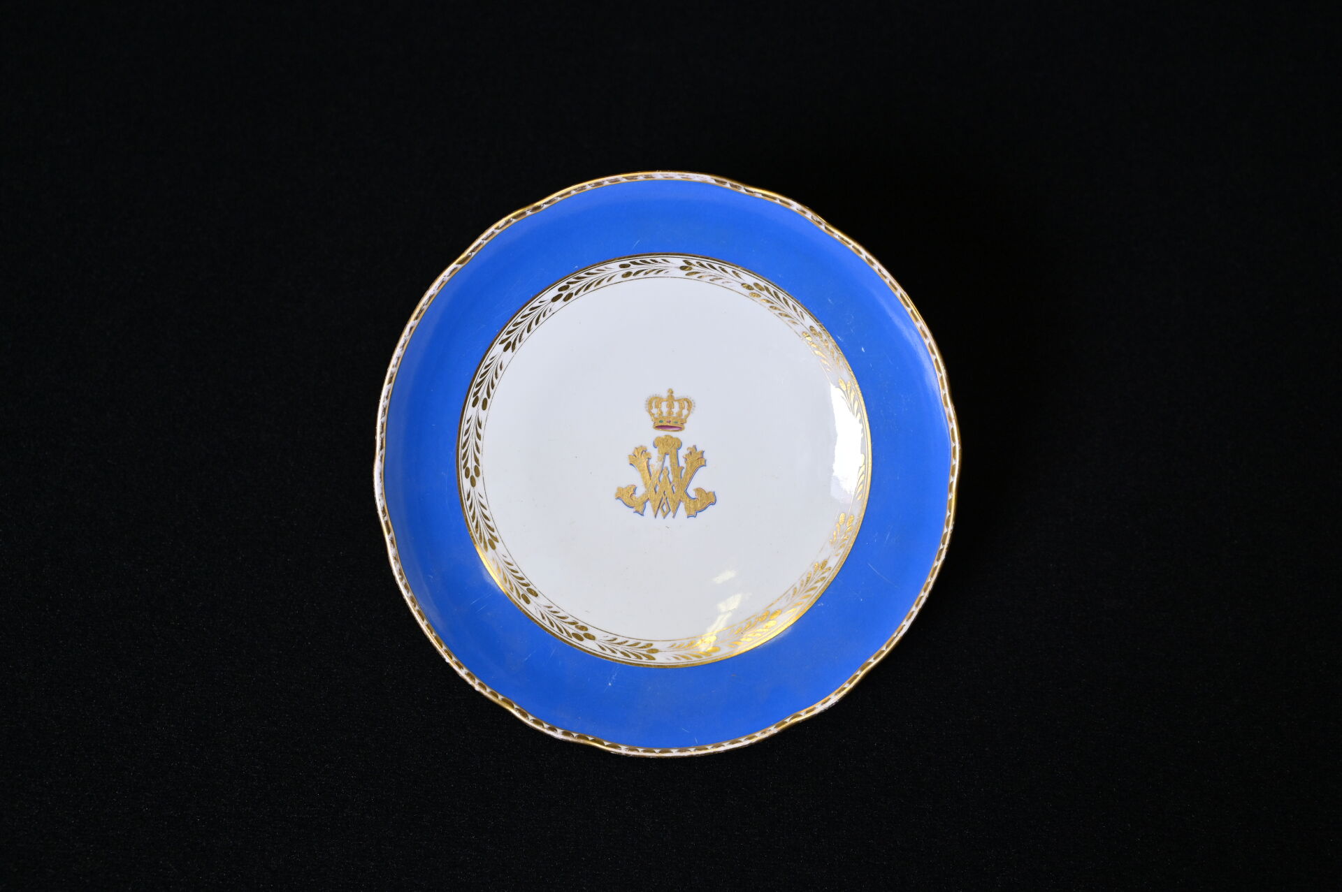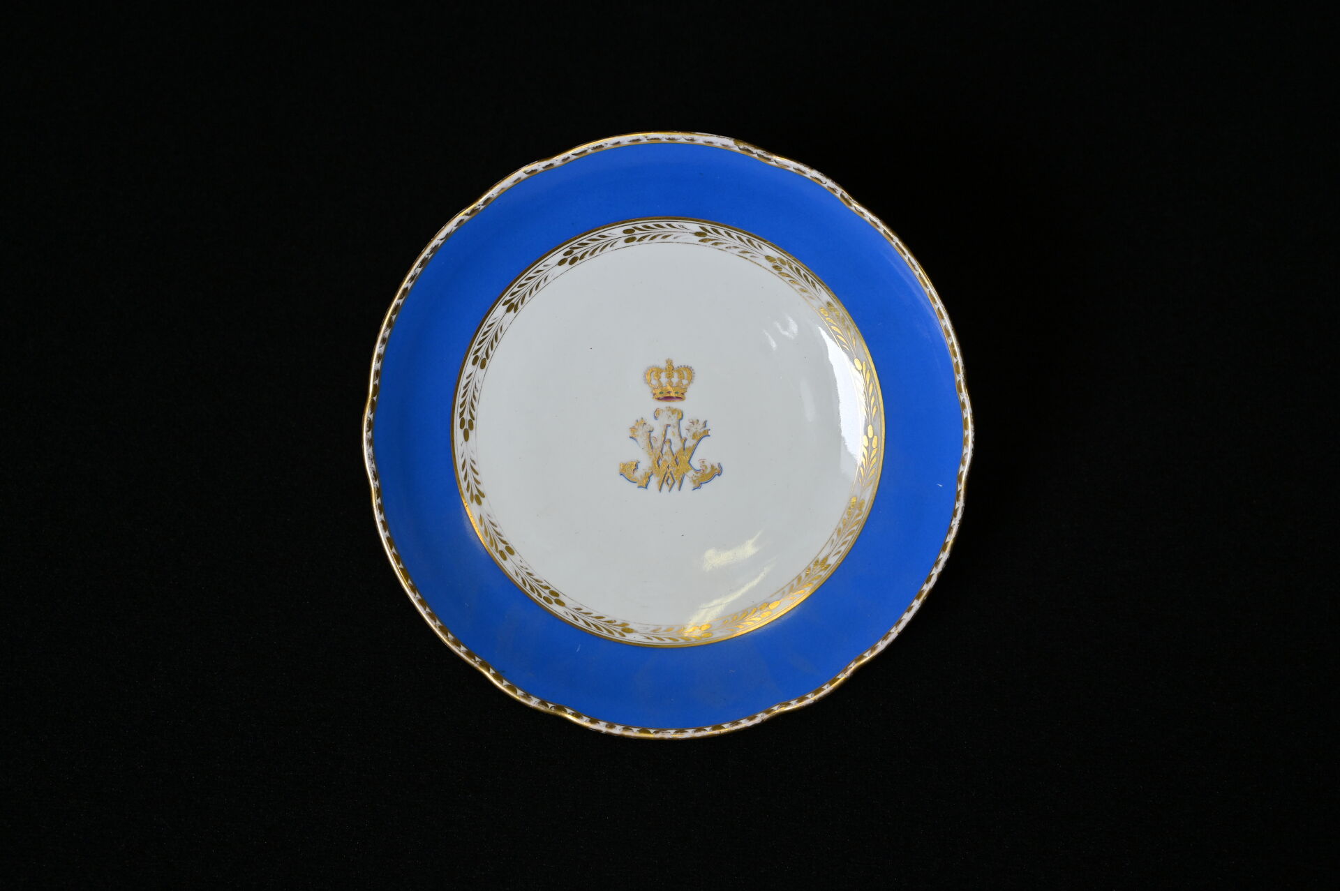 Paire de compotiers en porcelaine à bordure bleu roi, dorure, le bassin orné du chiffre AW sous une couronne fermée (usures). XIXe siècle. Haut. : 6,5 cm – Diam. : 25 cm.