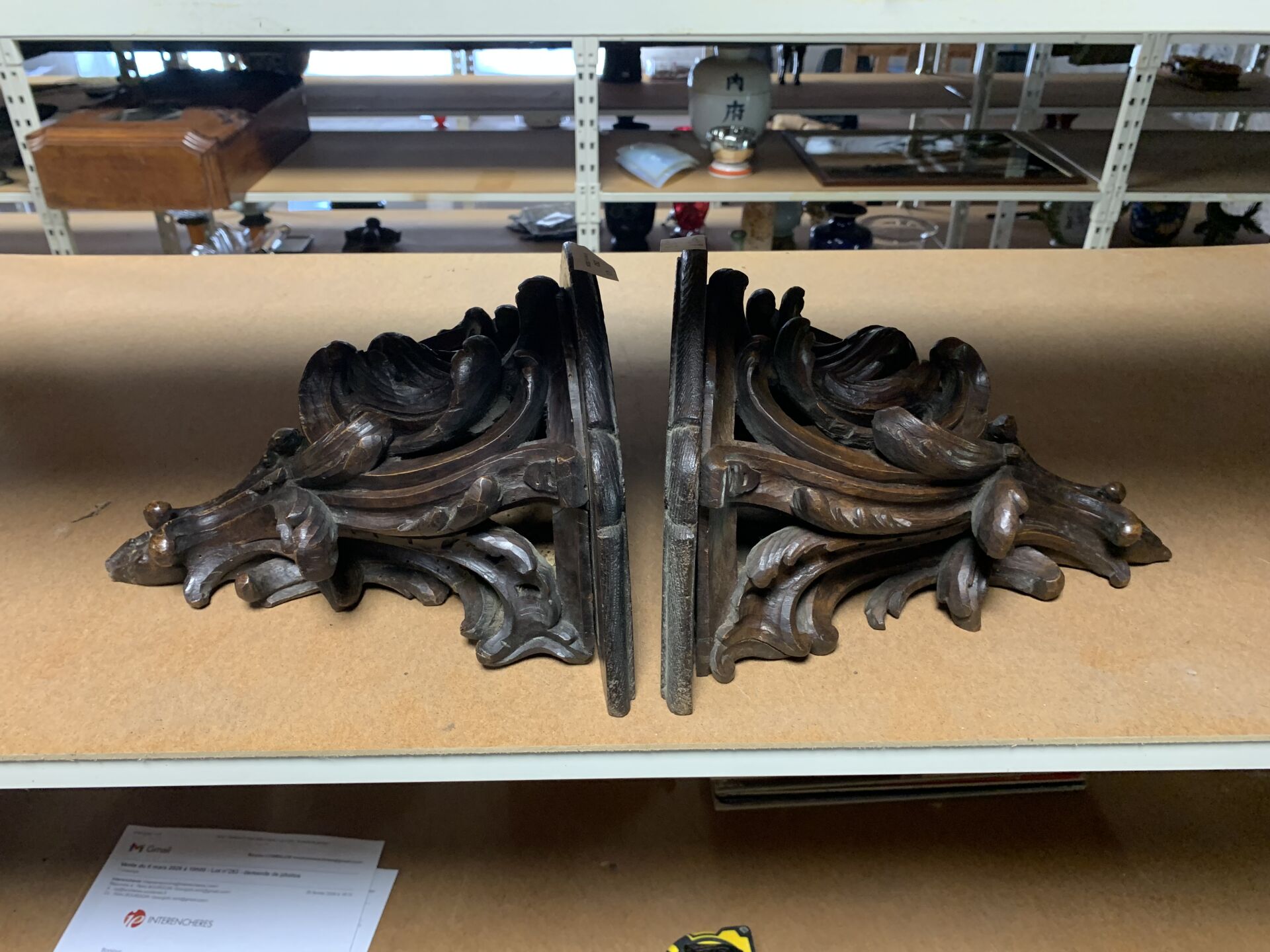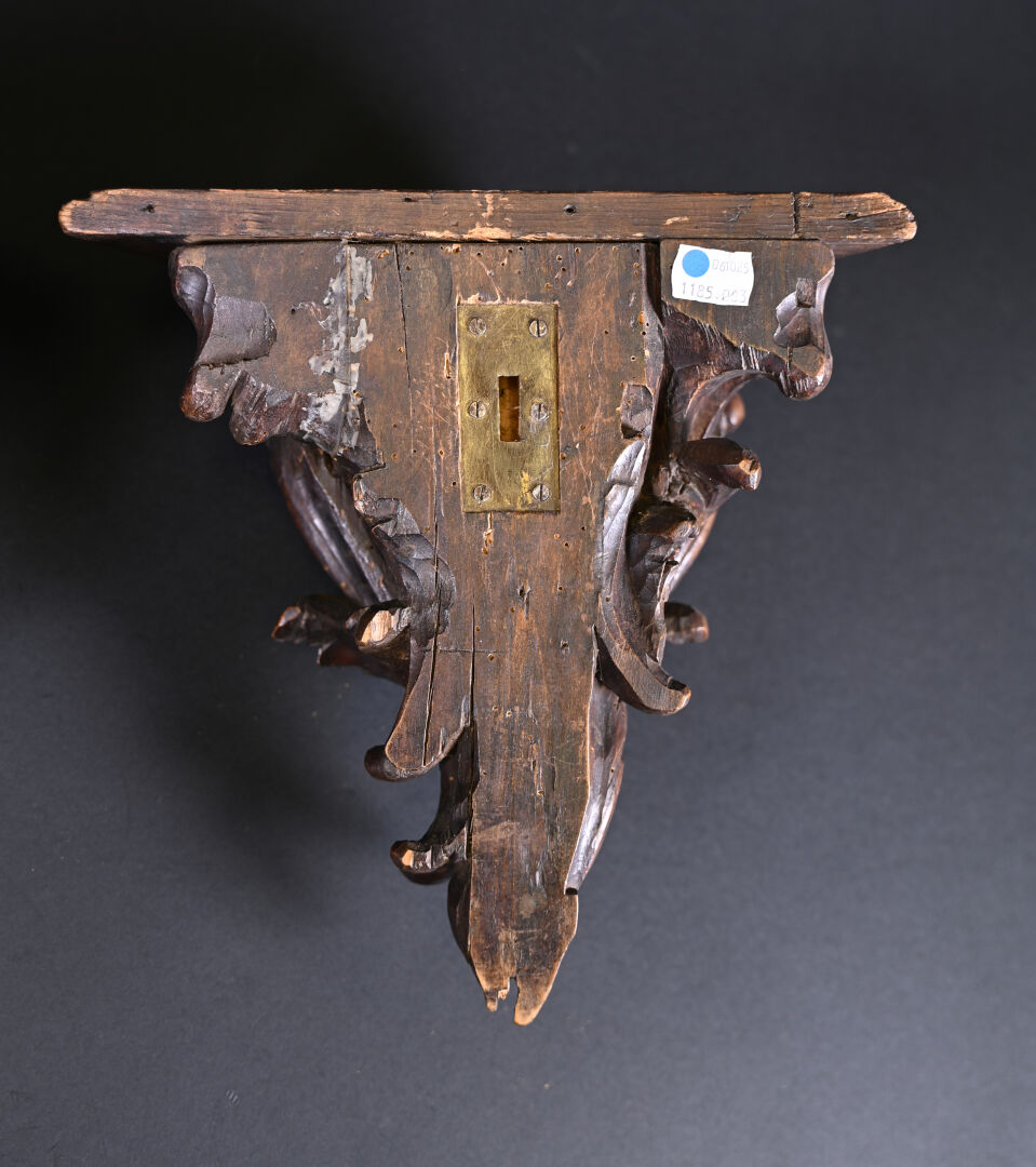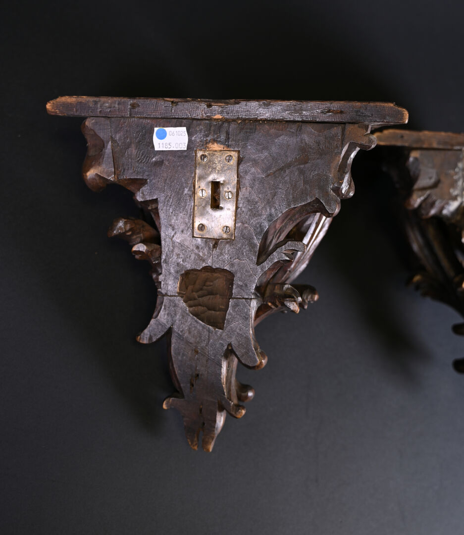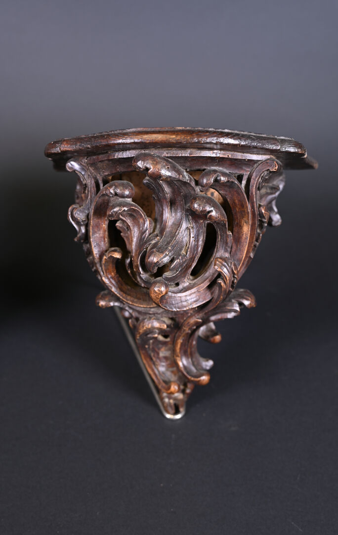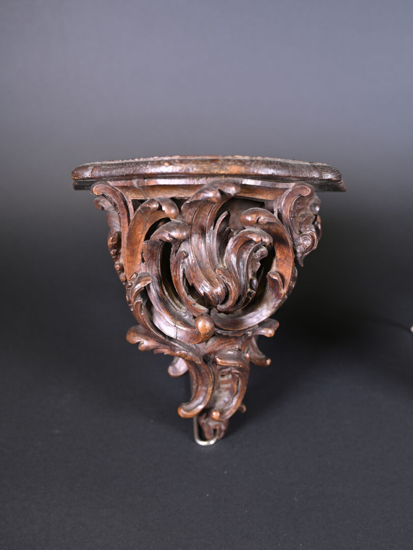 Paire de consoles d’applique en bois ajouré sculpté d’acanthes (quelques restaurations, fentes usures). Style Louis XV, fin du XIe siècle. Haut. : 26 cm.
