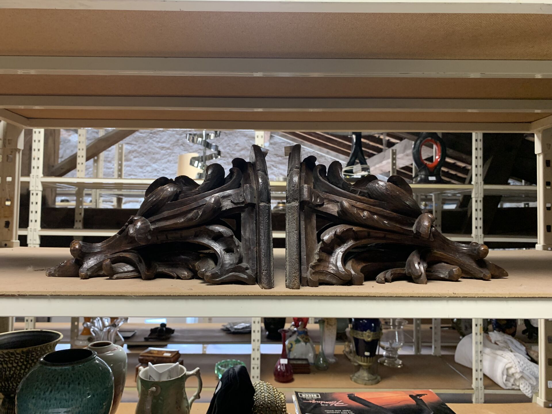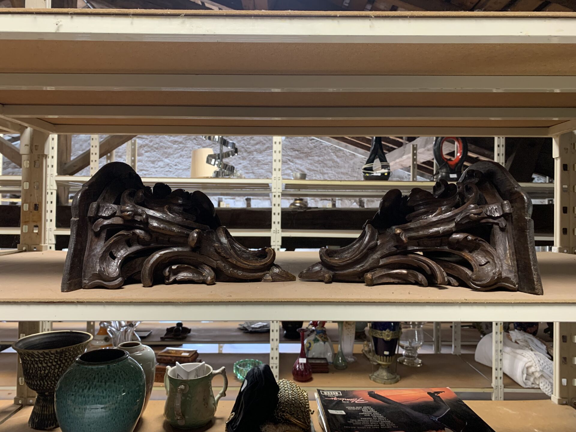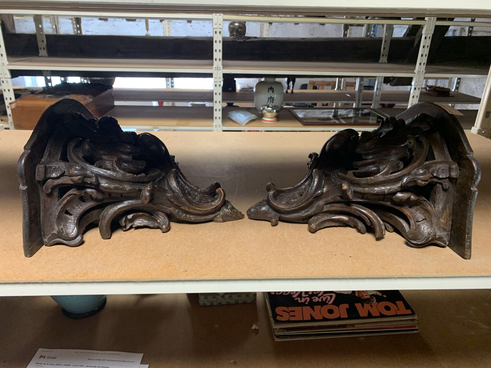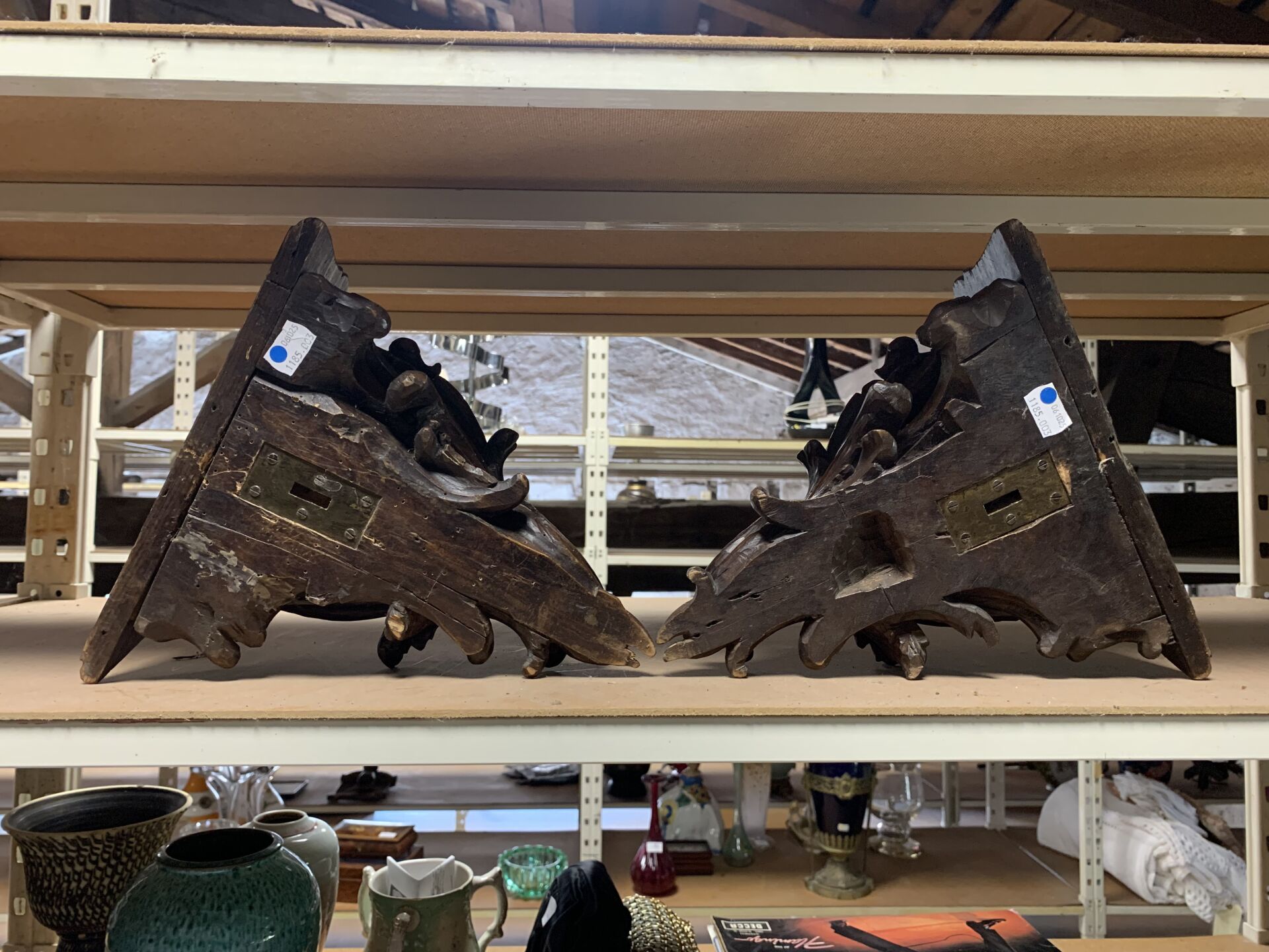 Paire de consoles d’applique en bois ajouré sculpté d’acanthes (quelques restaurations, fentes usures). Style Louis XV, fin du XIe siècle. Haut. : 26 cm.