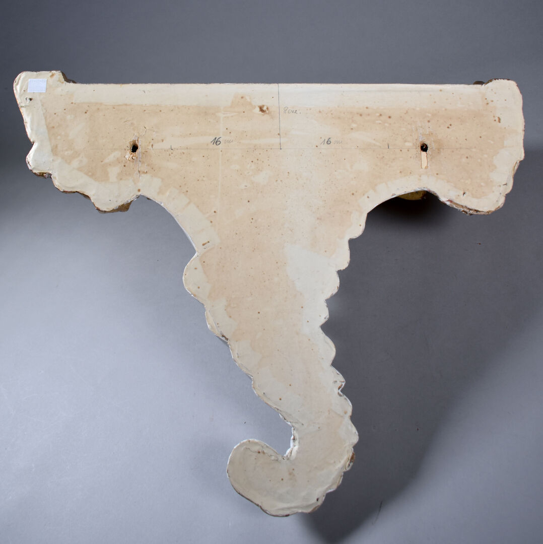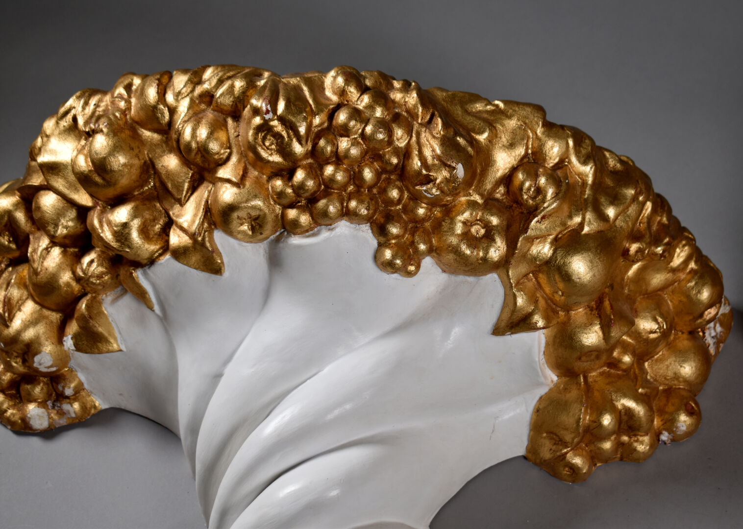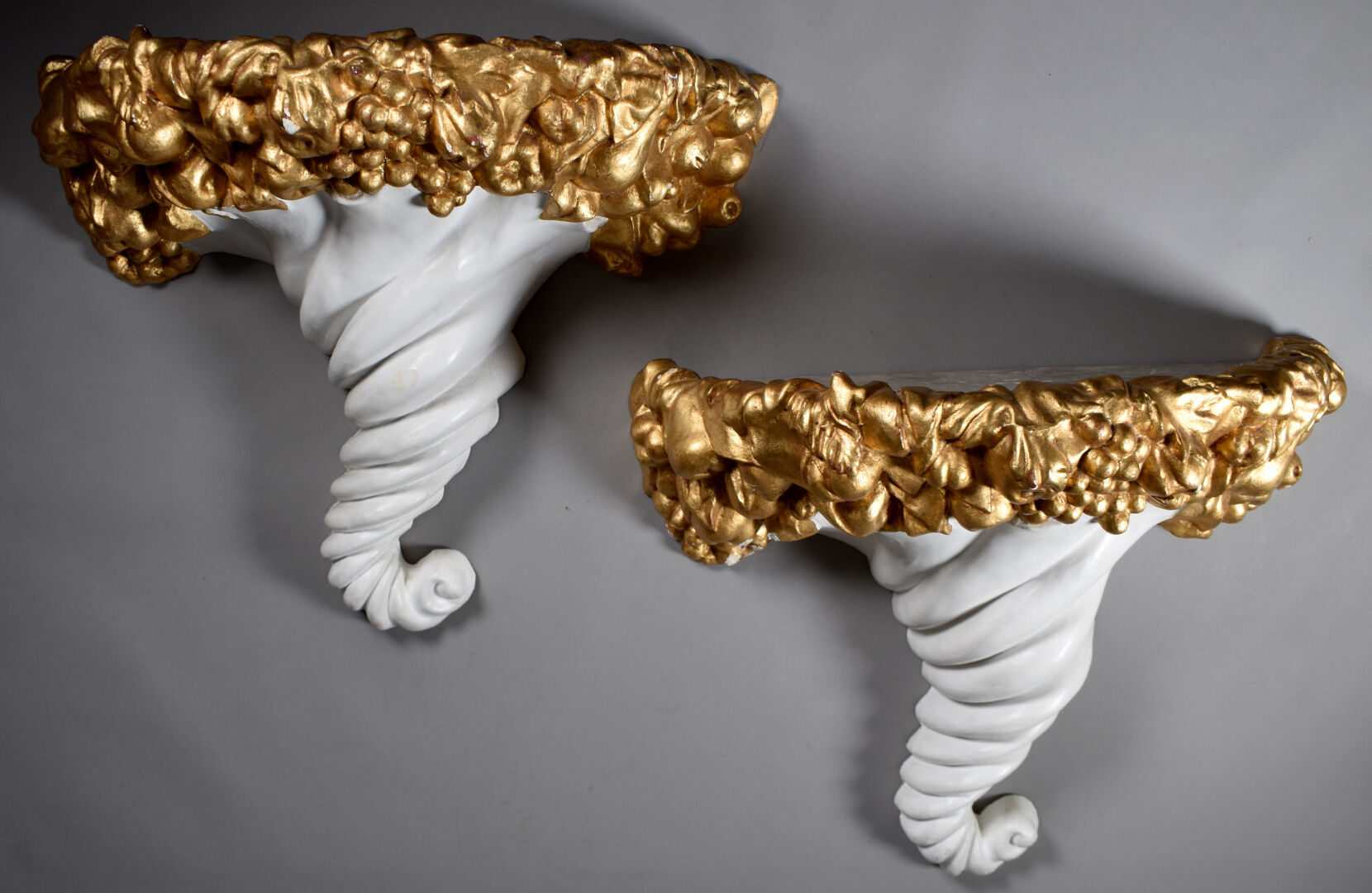 Paire de consoles d’applique en papier mâché à l’imitation du marbre représentant des cornes d’abondance (accidents et manques). Haut. : 52 cm.
