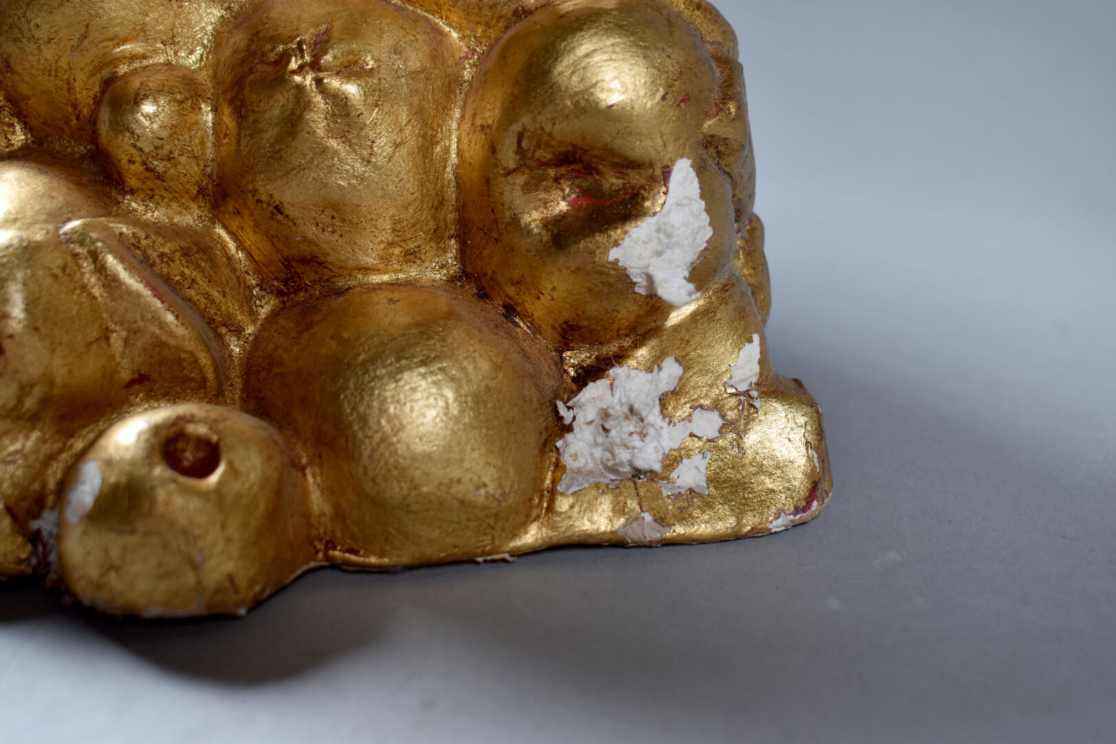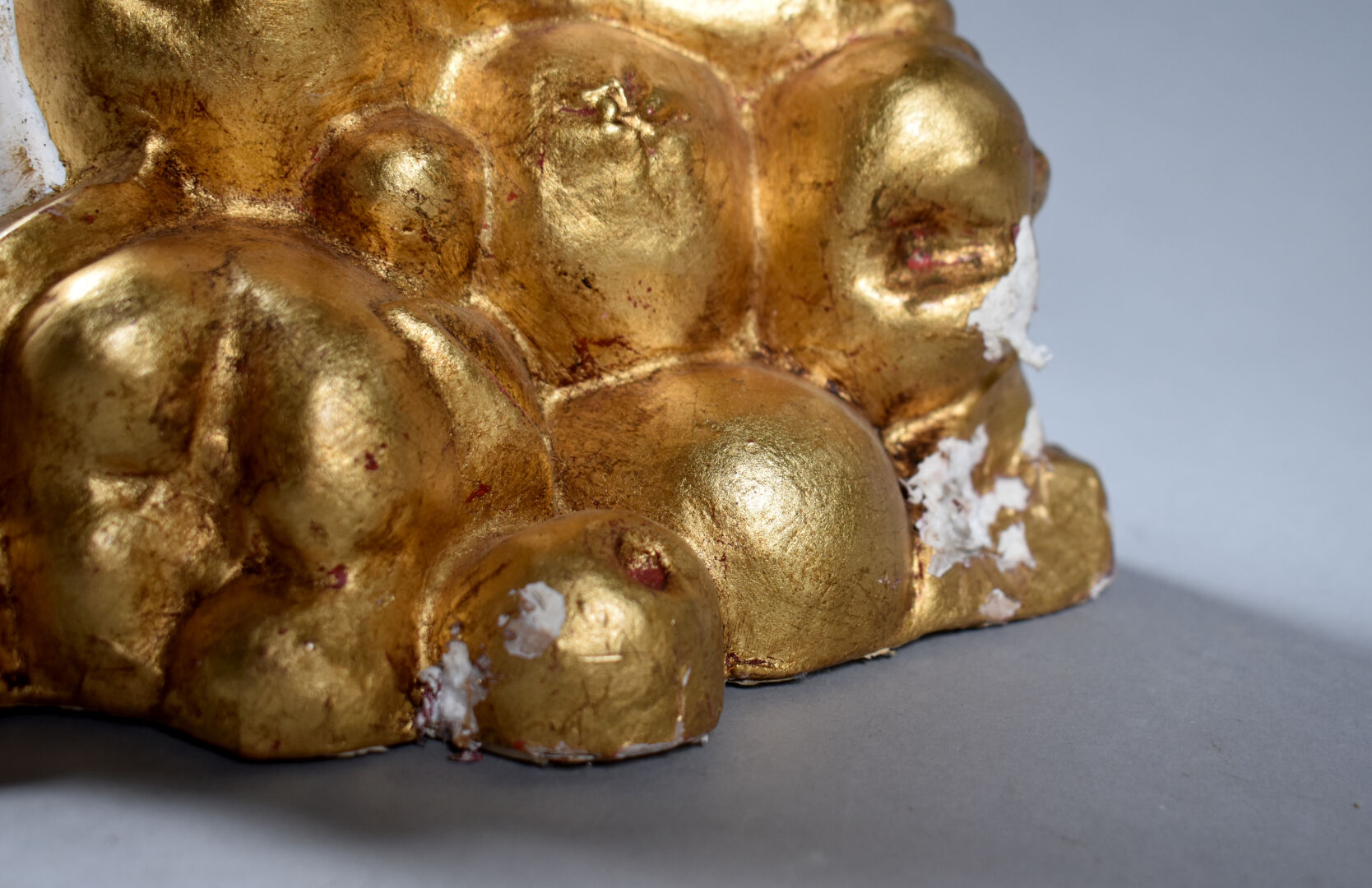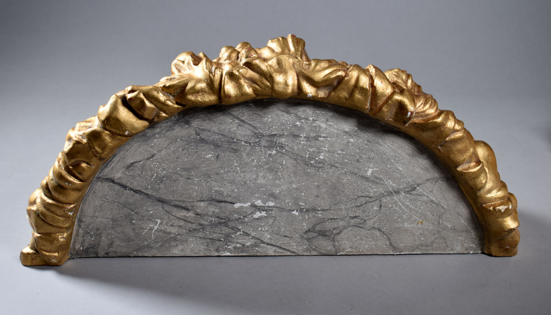 Paire de consoles d’applique en papier mâché à l’imitation du marbre représentant des cornes d’abondance (accidents et manques). Haut. : 52 cm.