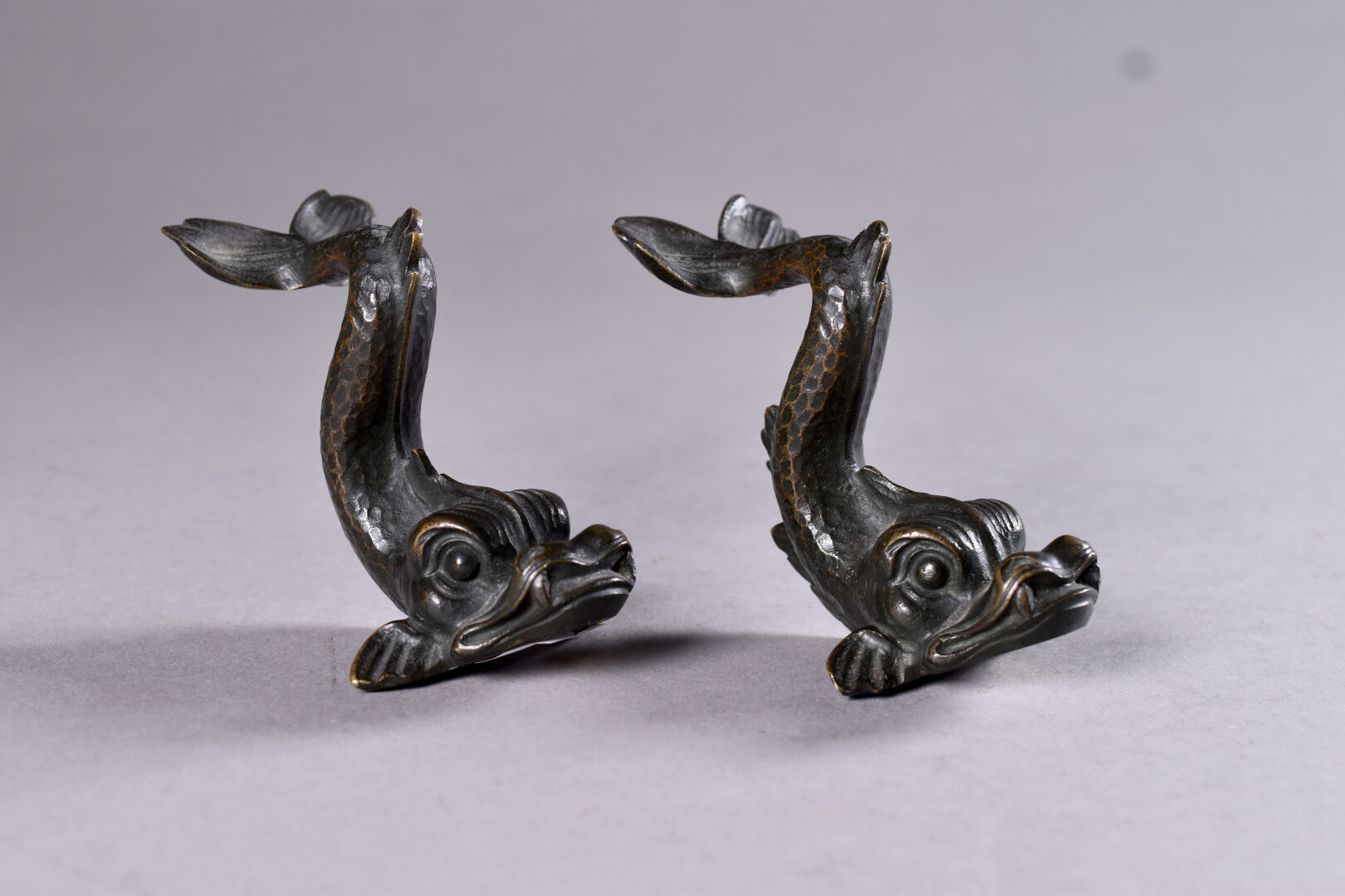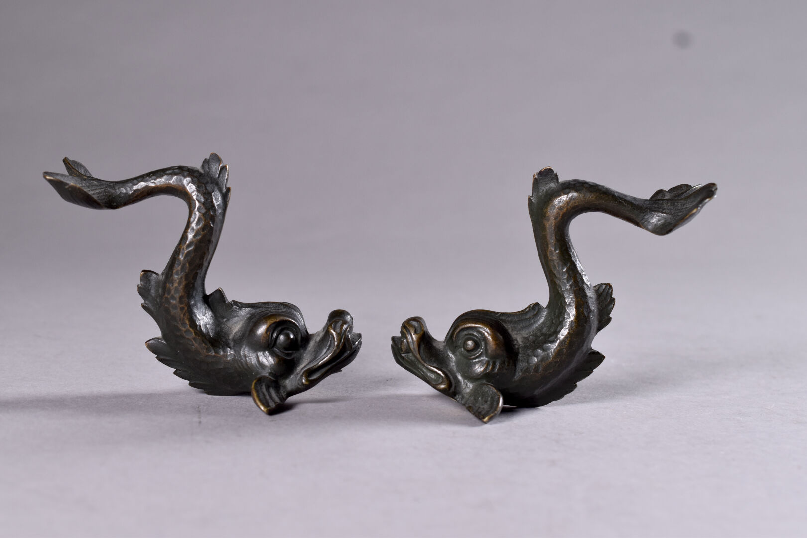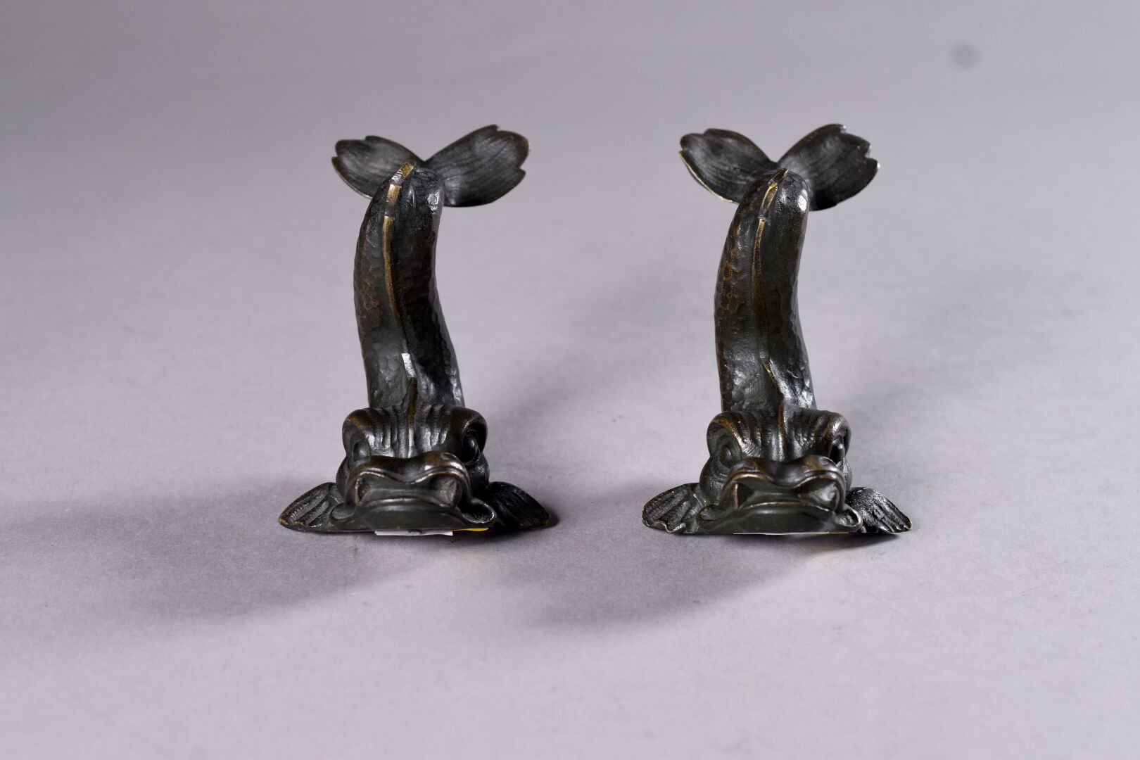 Paire de dauphins en bronze à patine brun vert. Haut. : 70 cm.