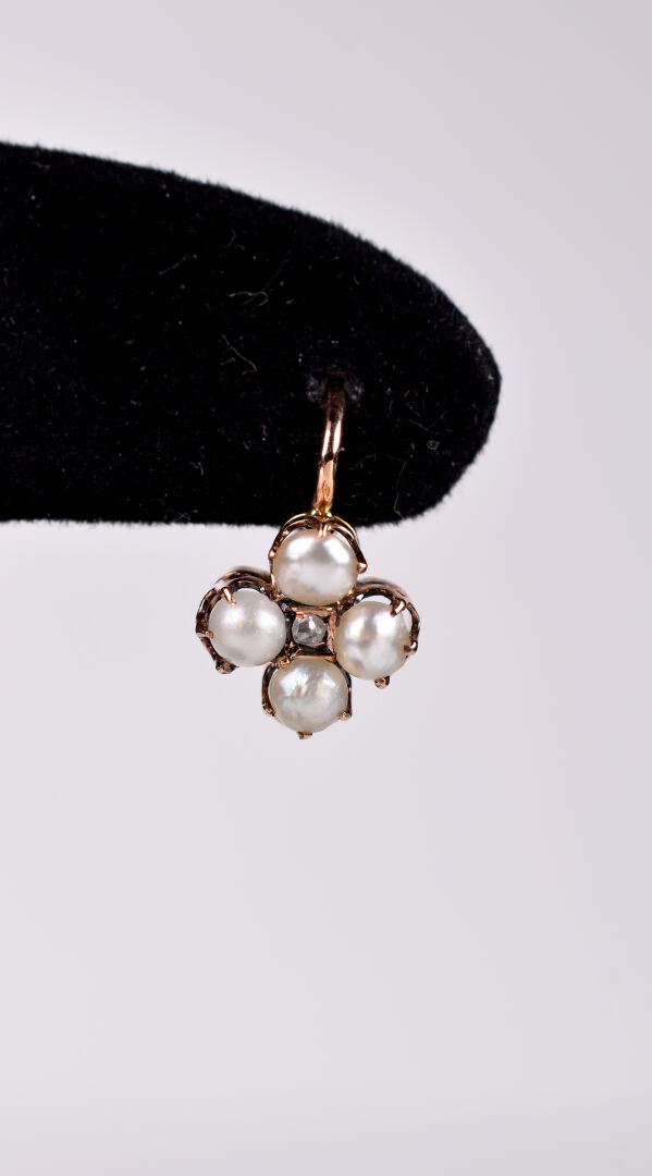 Paire de dormeuses en or jaune 18K 750/1000e à décor de quatre semences de perles centrée d’un petit diamant taille rose. Poids brut. : 2,9 g.