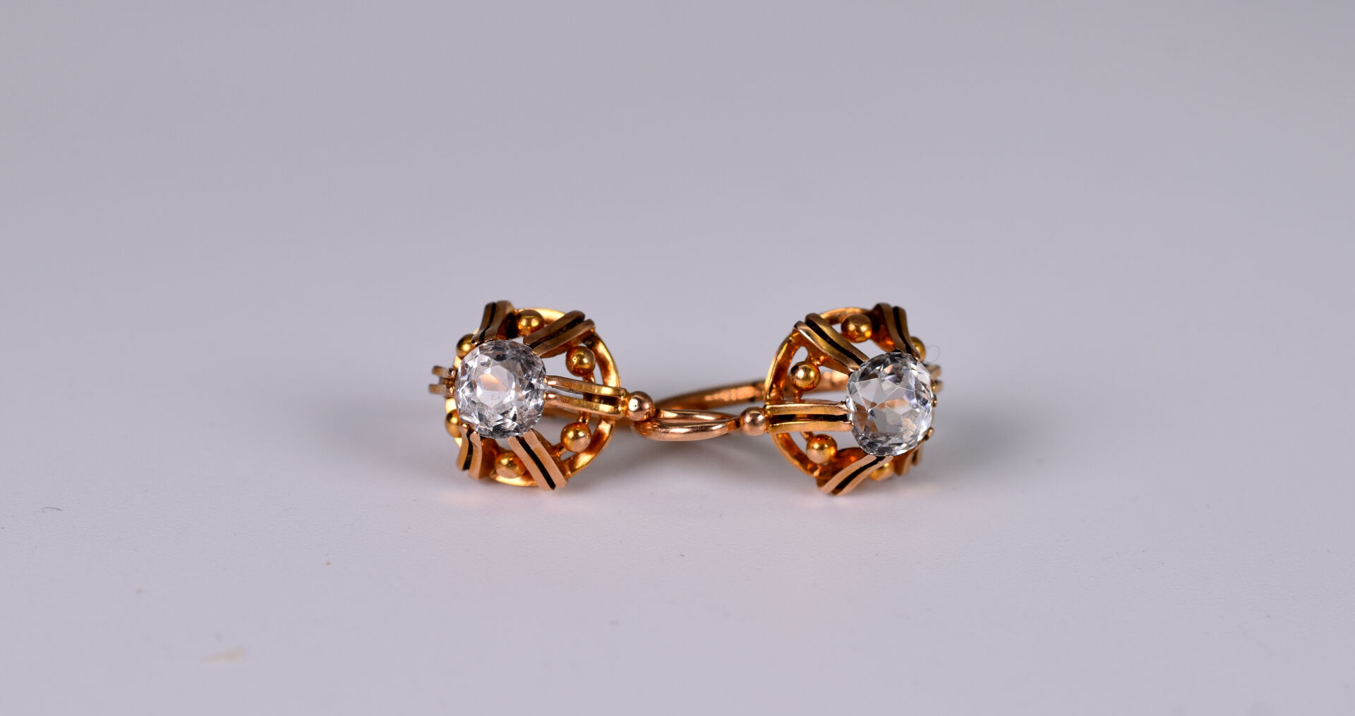 Paire de dormeuses en or jaune 18K 750/1000e serties de verroterie. Poids brut. : 3,55 g. On joint un chaîne en métal doré.