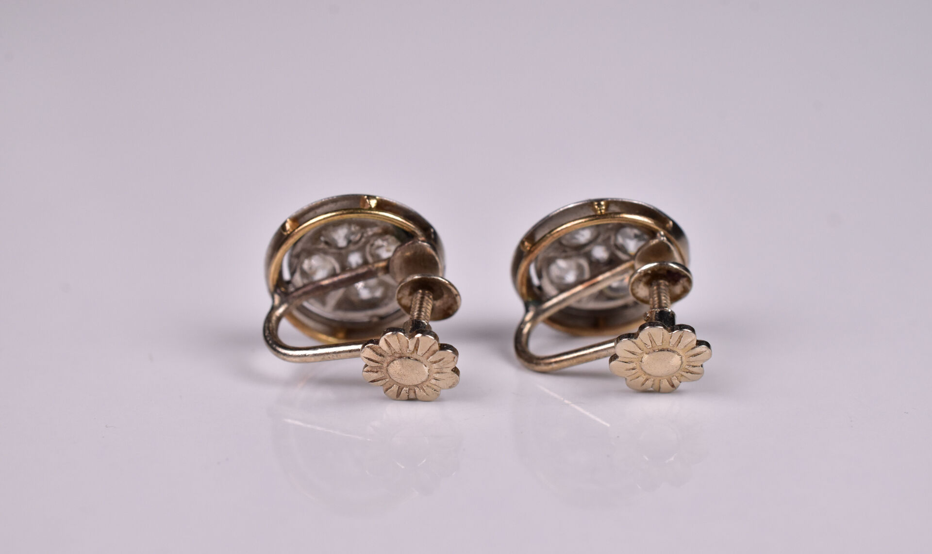 Paire de dormeuses rondes clip en deux or 18K 750/1000e et petits diamants taille ancienne. Diam. : 1,2 cm. Poids brut total. : 4 g.