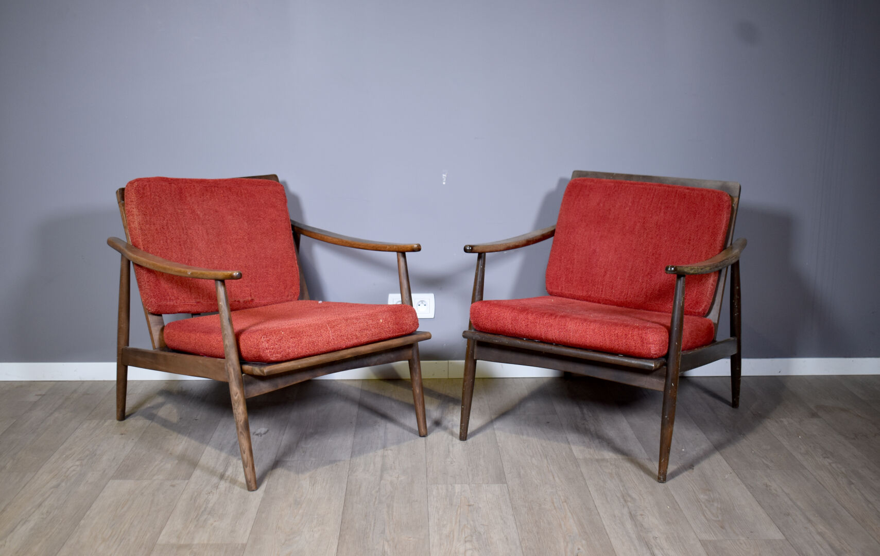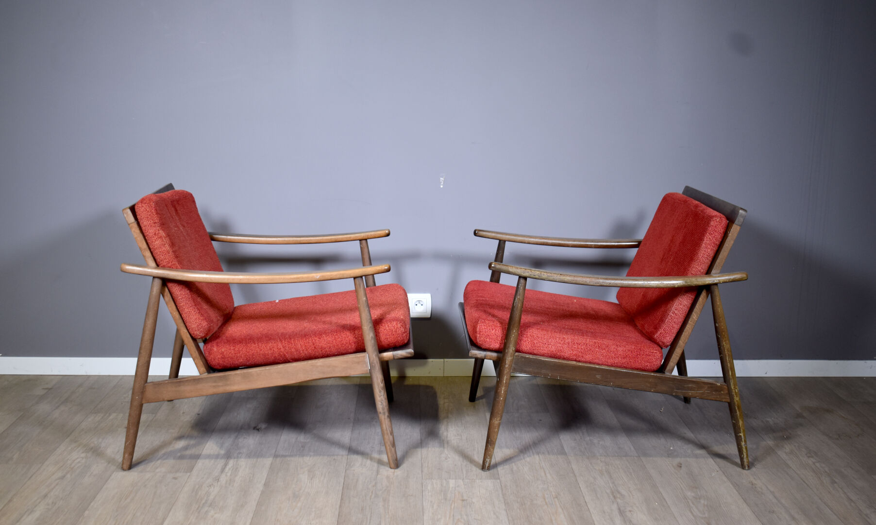 Paire de fauteuil sur sanglage. Dossier et assise en tissu rouge (usures d’usage, traces d’humidité, traces d’insectes xylophages). Travail scandinave des années 1960. Haut. : 69 cm – Larg. : 64 cm – Prof. : 74 cm.
