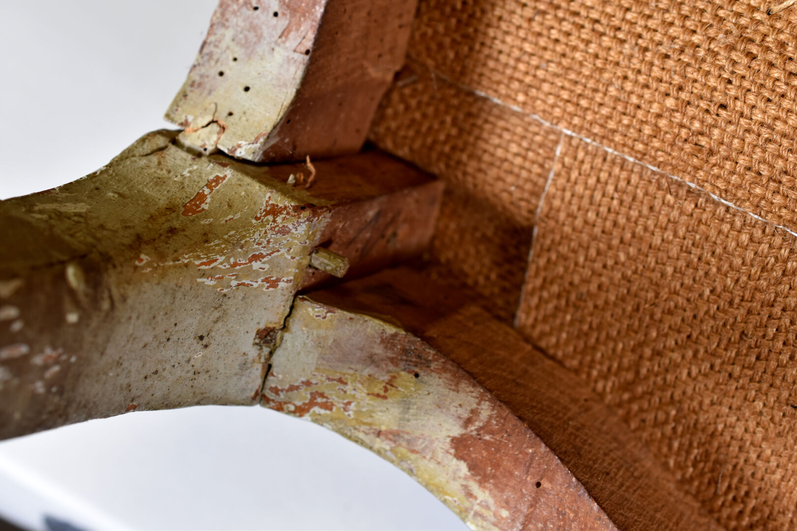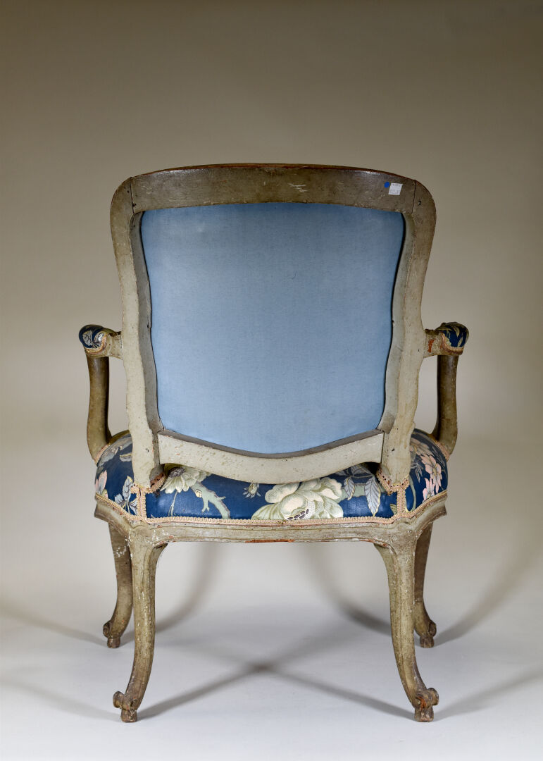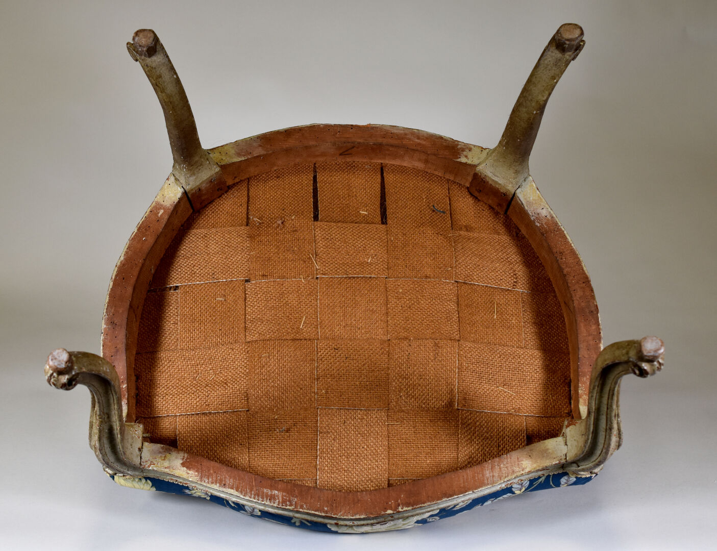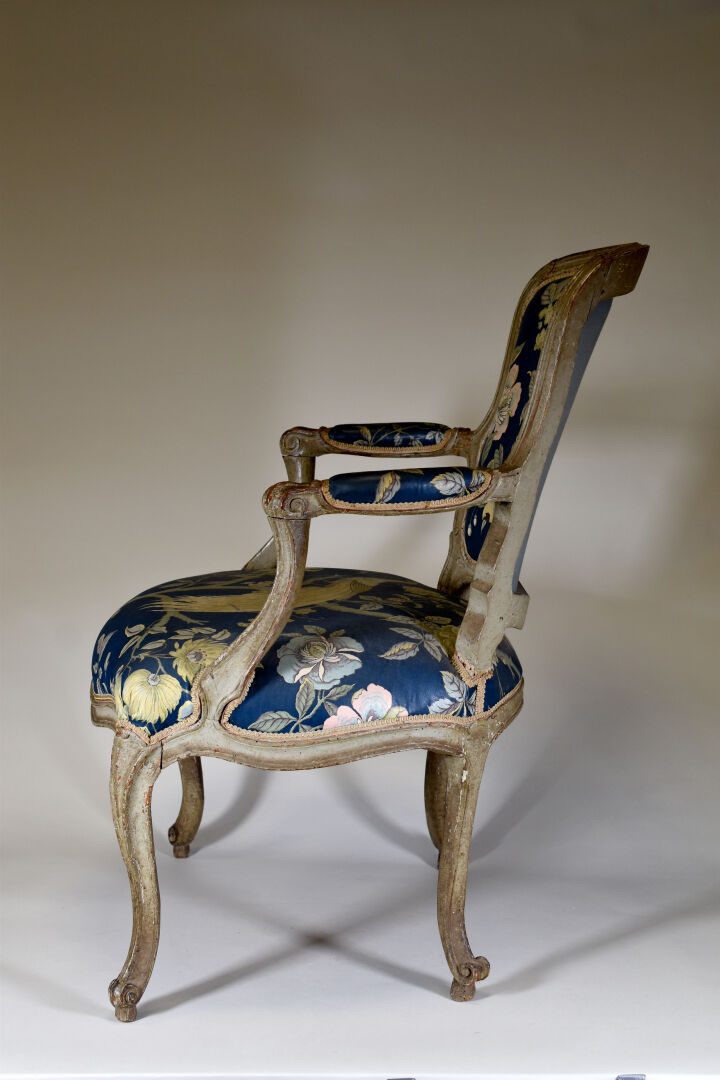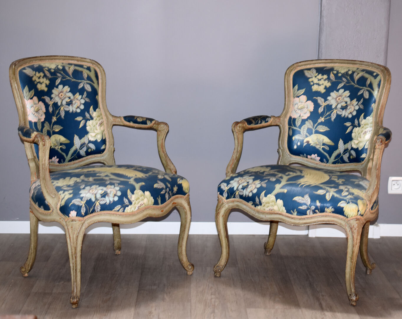 Paire de fauteuils cabriolet en bois sculpté mouluré relaqué vert. Les dossiers en coup de fouet, les pieds cambrés. Époque Louis XV. Estampillés Étienne MEUNIER. Garniture de satin bleu à décor floral. Haut. : 86 cm.