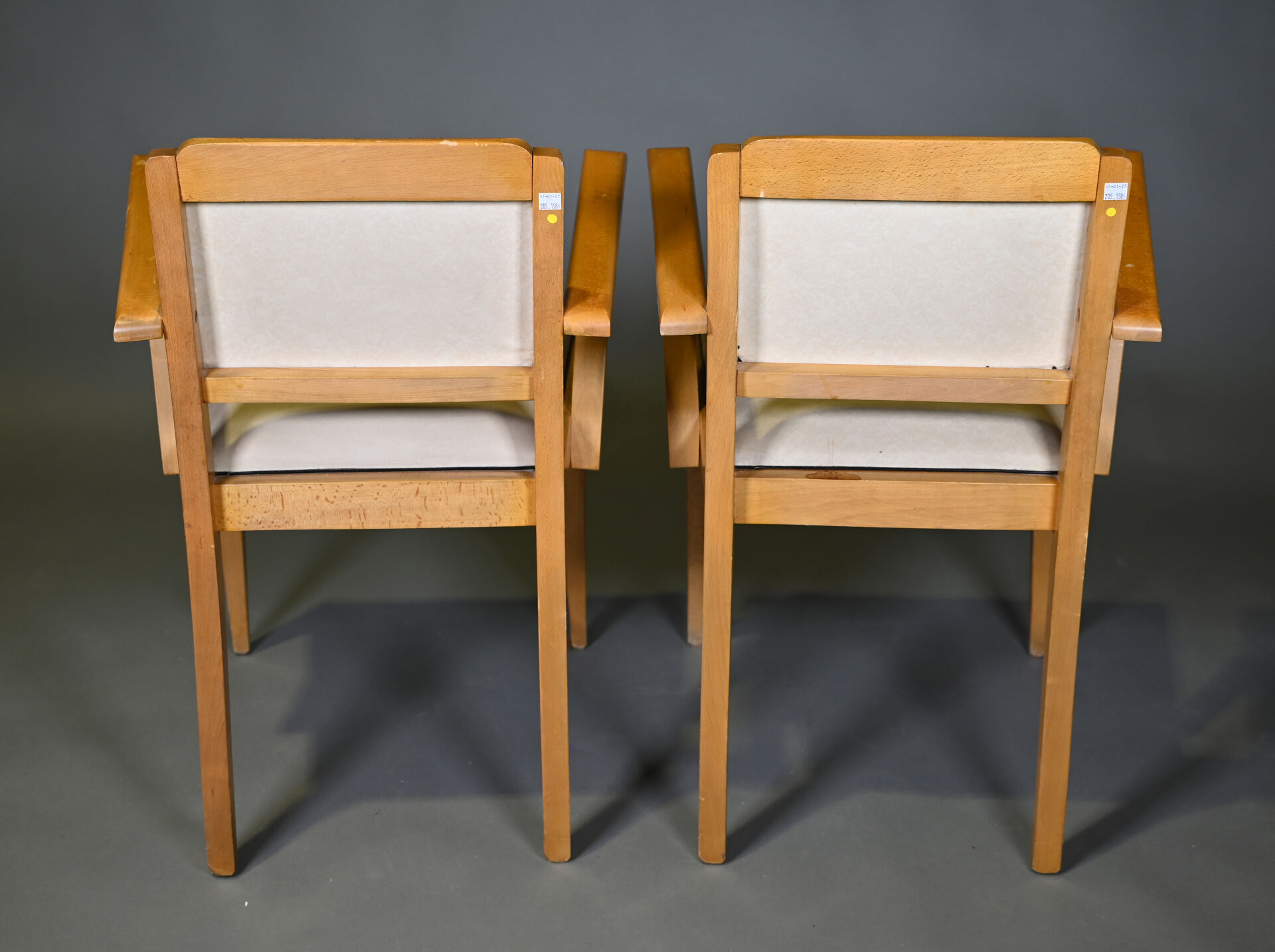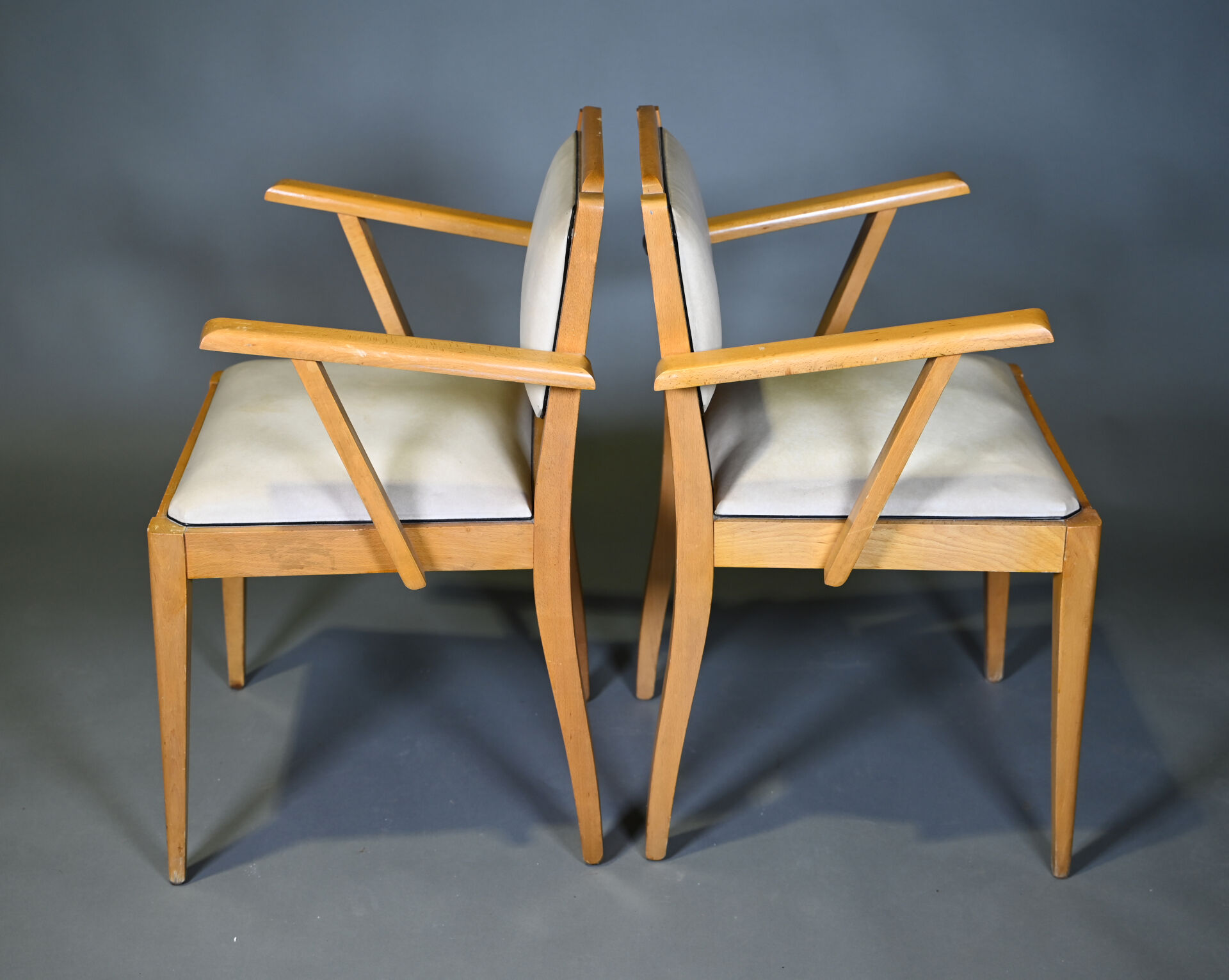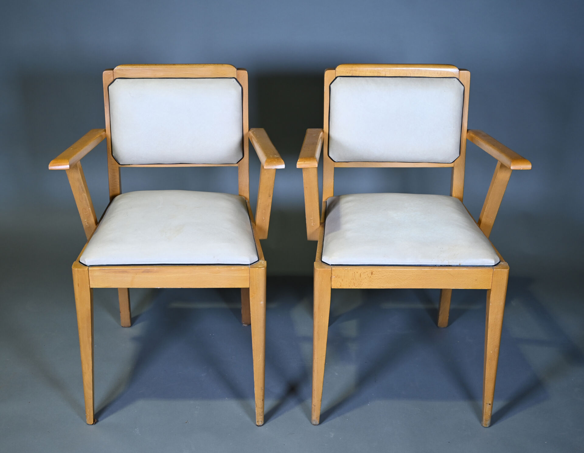 Paire de fauteuils en hêtre à dossiers et assises garnis de skaï beige. Haut. : 79 cm.