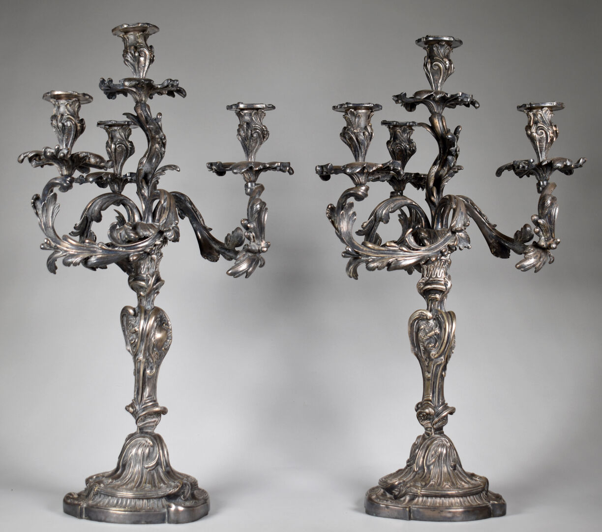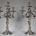 Paire de flambeaux à 3 bras et 4 lumières en bronze argenté à décor d’acanthes et rocailles (quelques usures à l’argenture). Style Louis XV, XIXe siècle. Haut. : 64,5 cm.