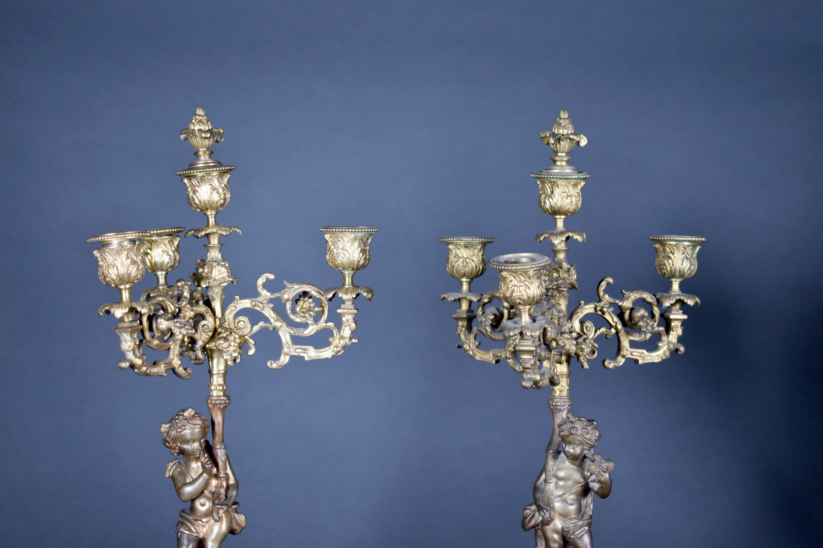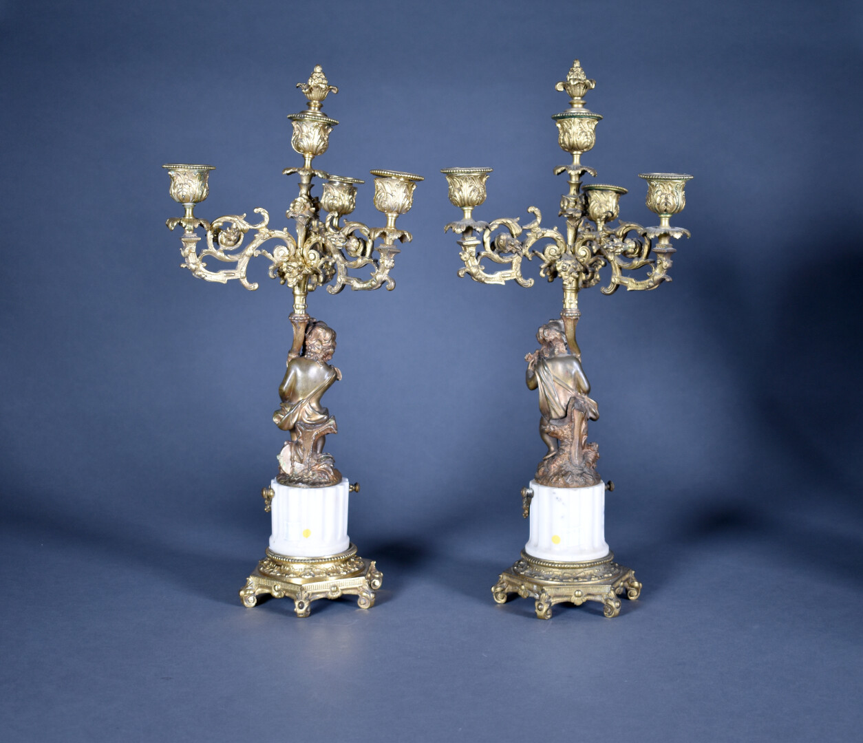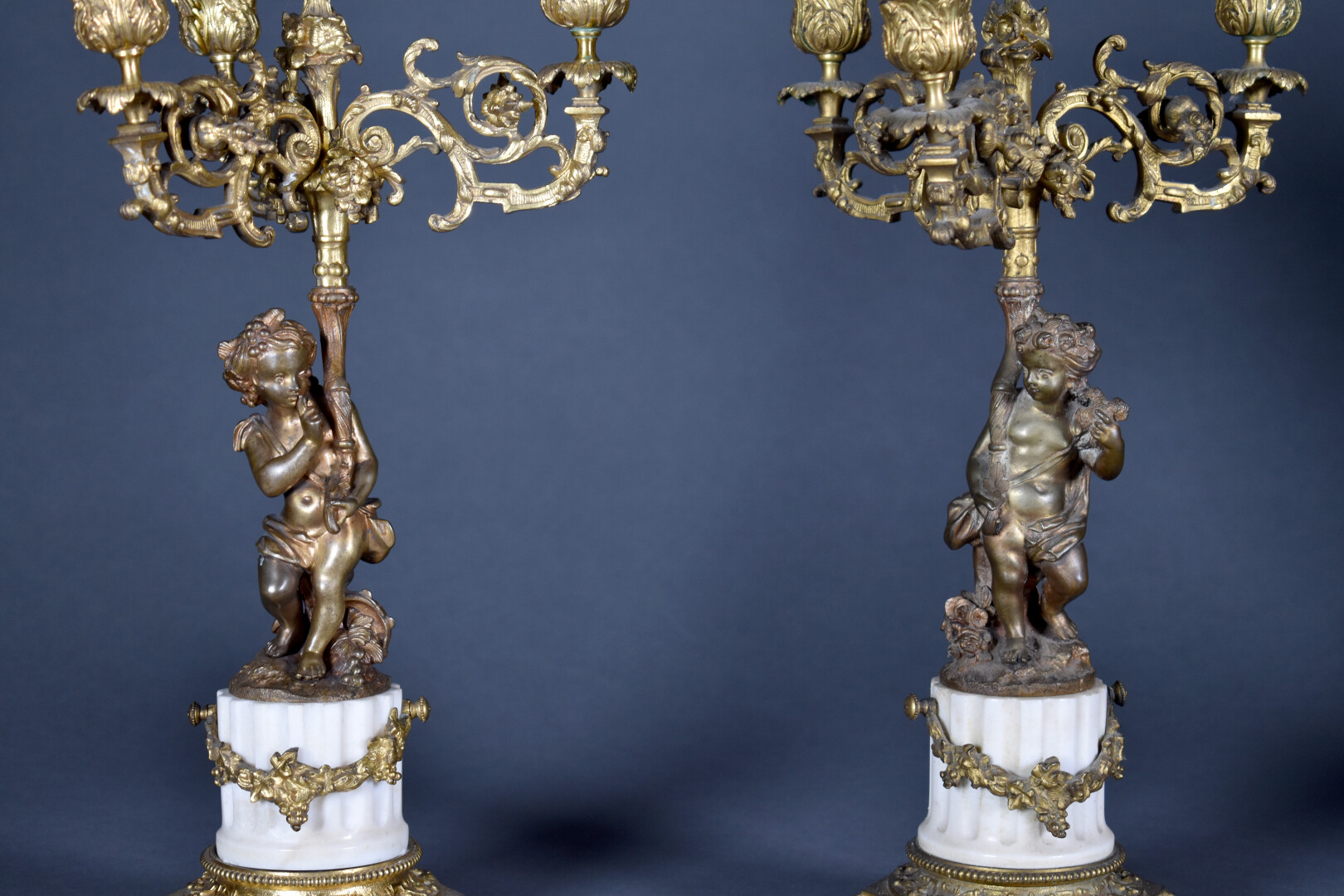 Paire de flambeaux en bronze ciselé doré à 3 bras et quatre lumières. Le fût ornée de putti sur une colonne cannelée en pierre dure blanche (un avec enfoncement). Style Louis XVI, Fin du XIXe siècle. Haut. : 49 cm.