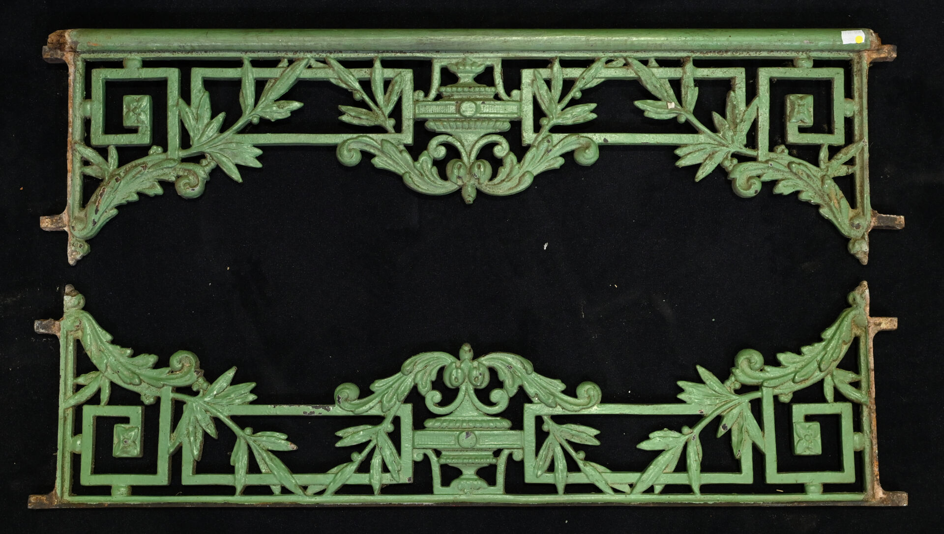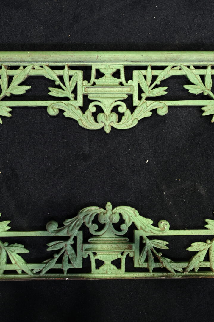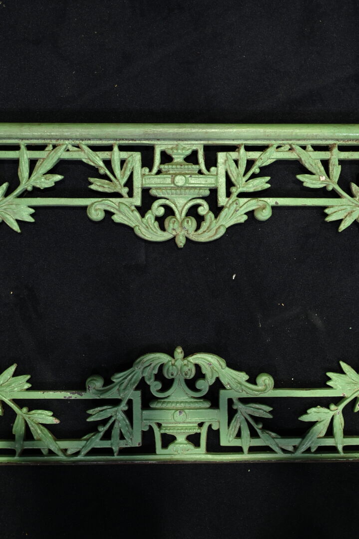 Paire de garde-corps en fonte et bois laqués vert (quelques piqures). Haut. : 27 cm – Long. : 97 cm.