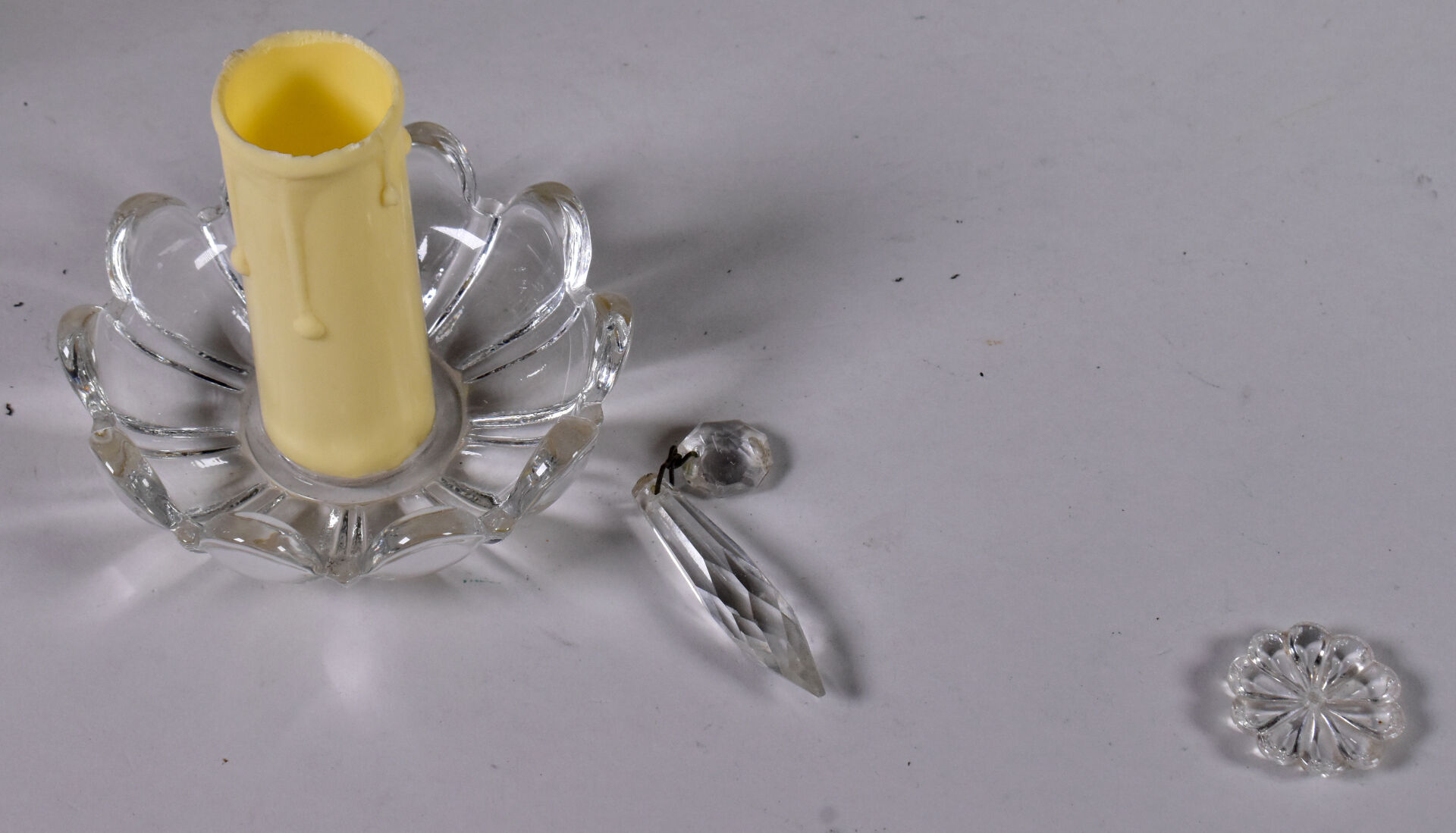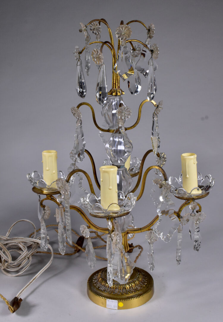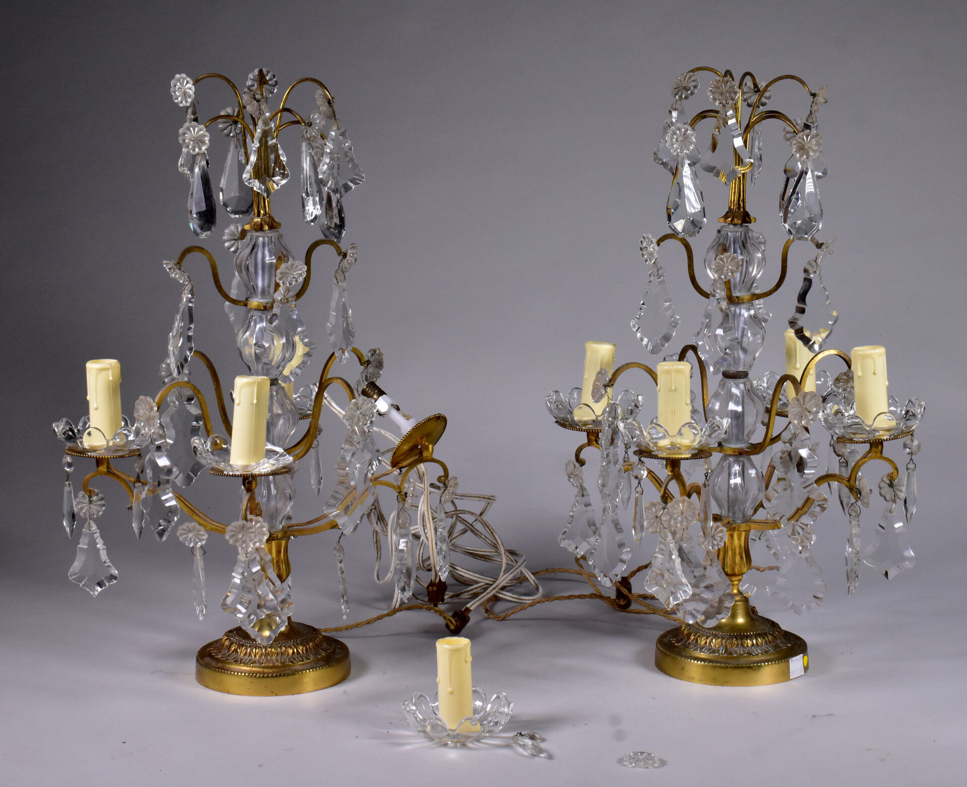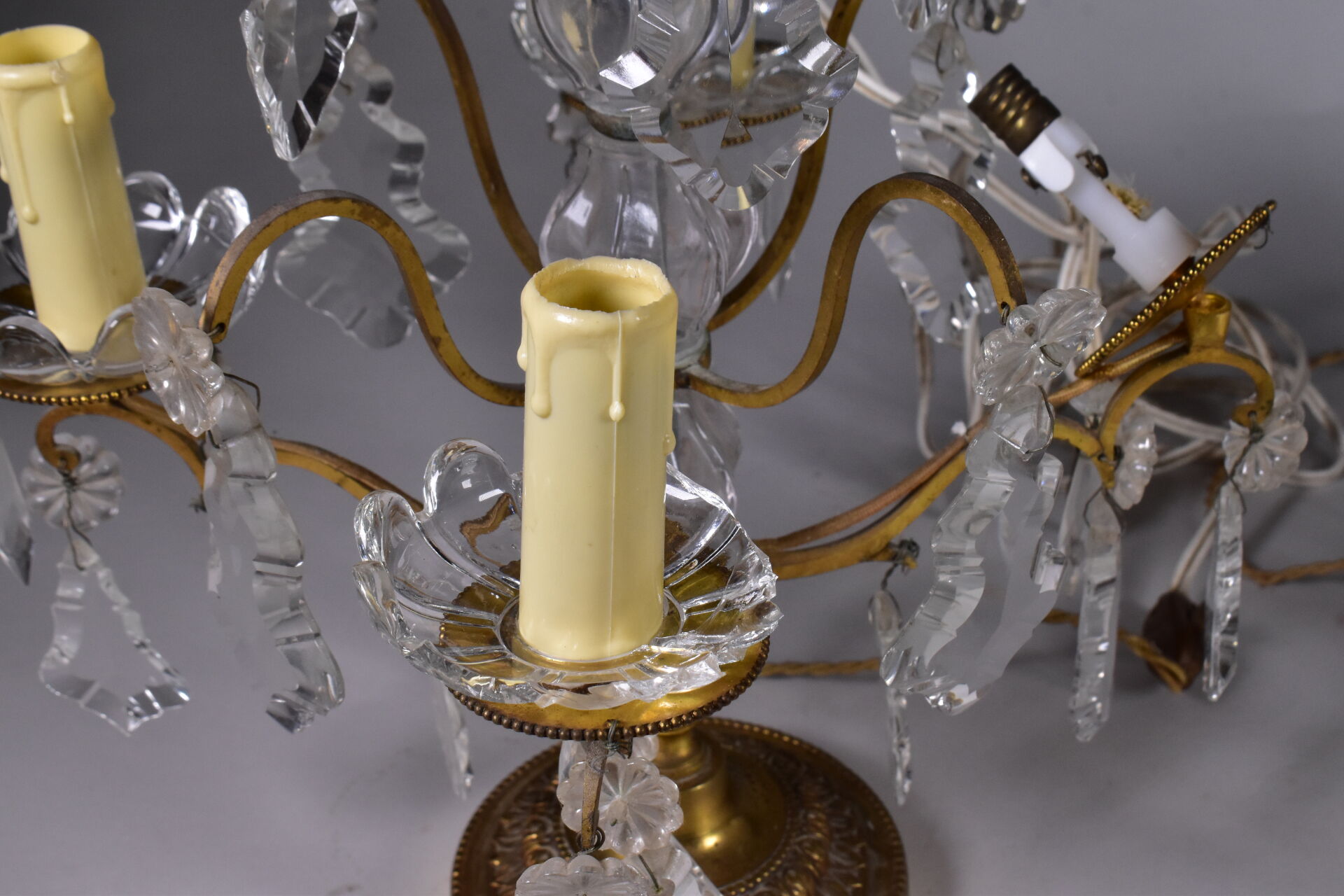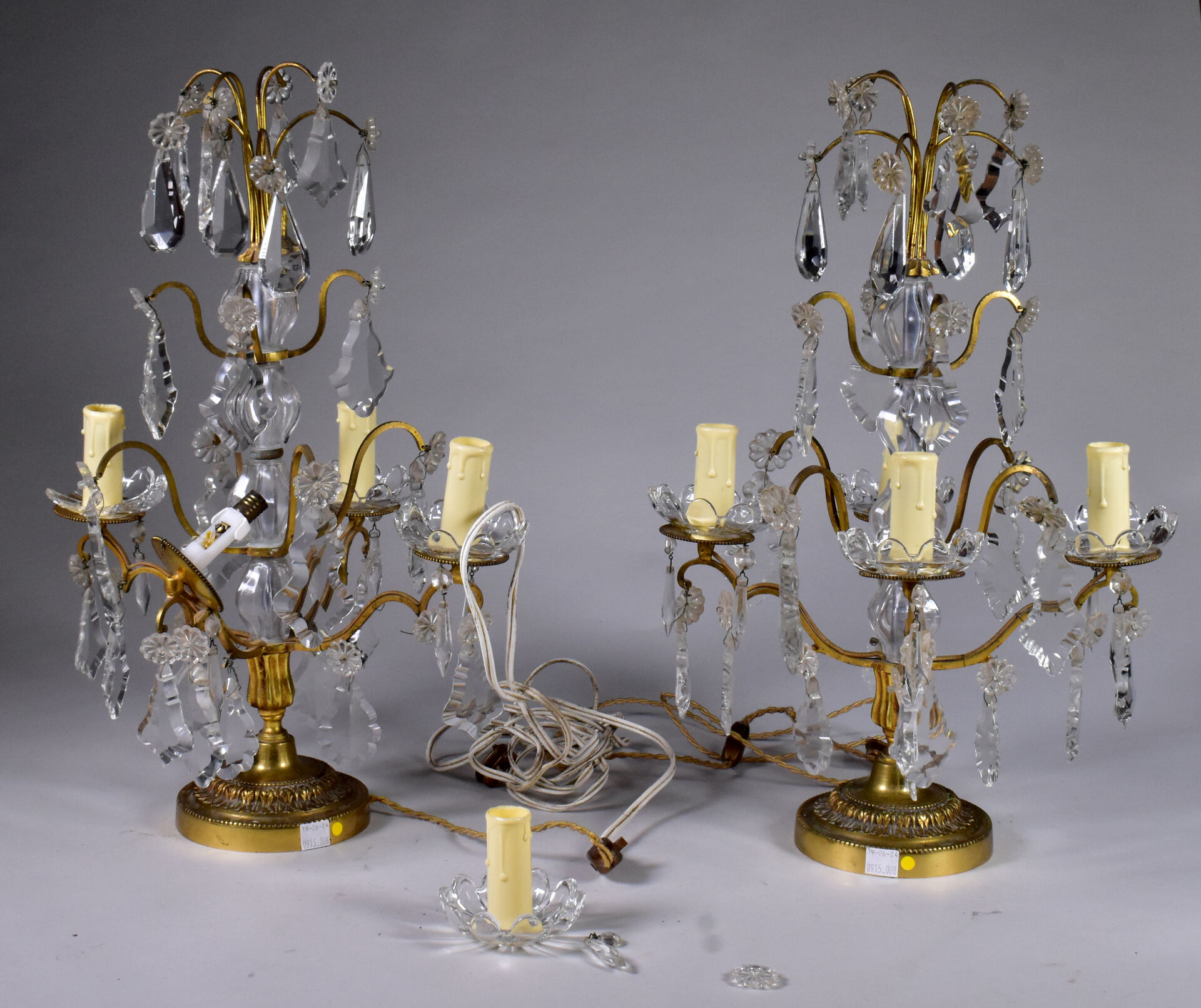 Paire de girandoles en bronze et cristal moulé à 4 bras de lumière (accidents à une coupelle). Style Louis XV. Electrifiées. Haut. : 49 cm.