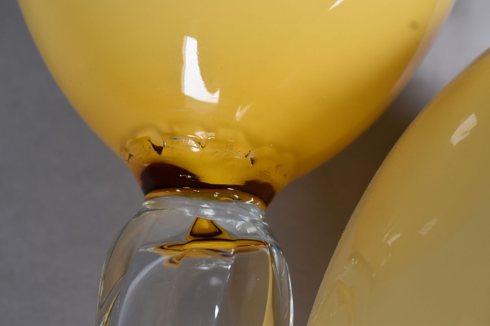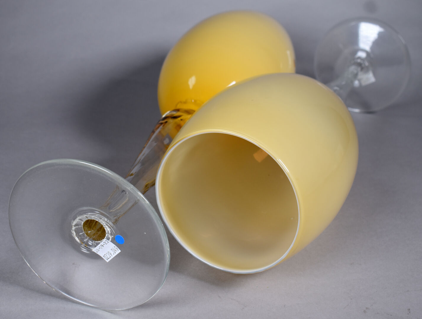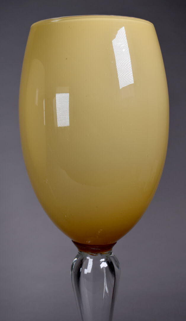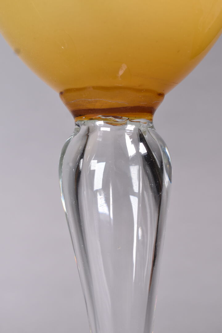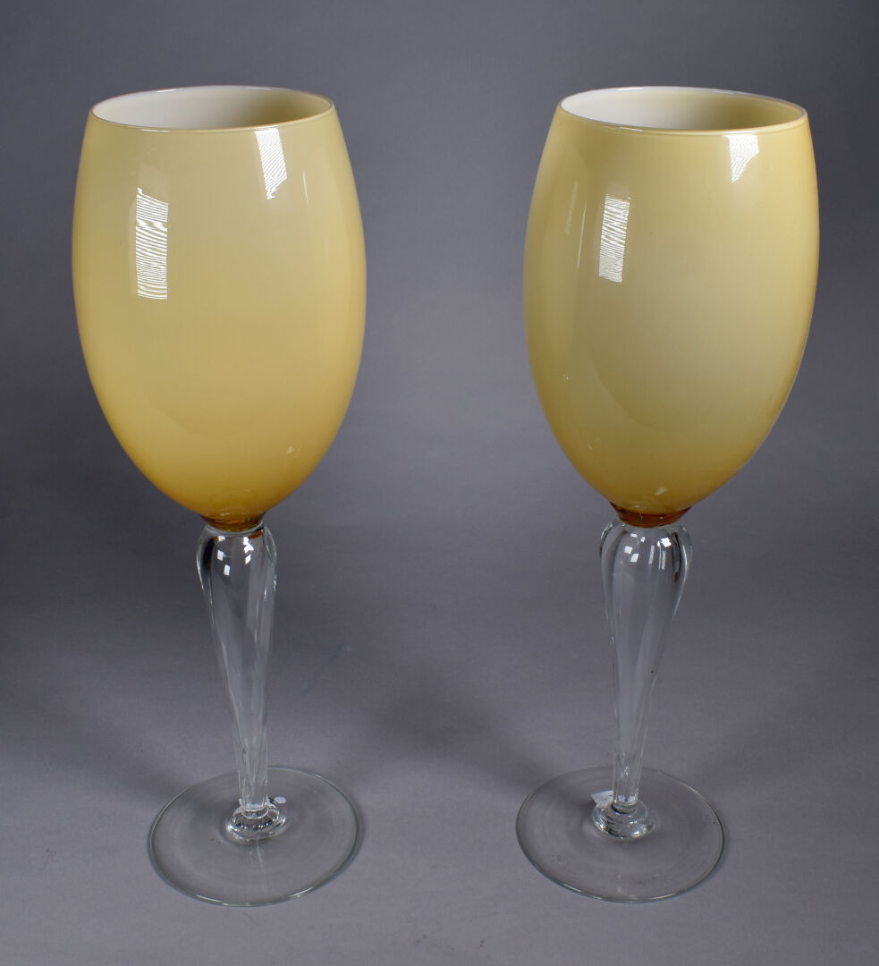 Paire de grandes coupes sur pied en verre clair et verre ambré. Murano, XXe siècle. Haut. : 50 cm.