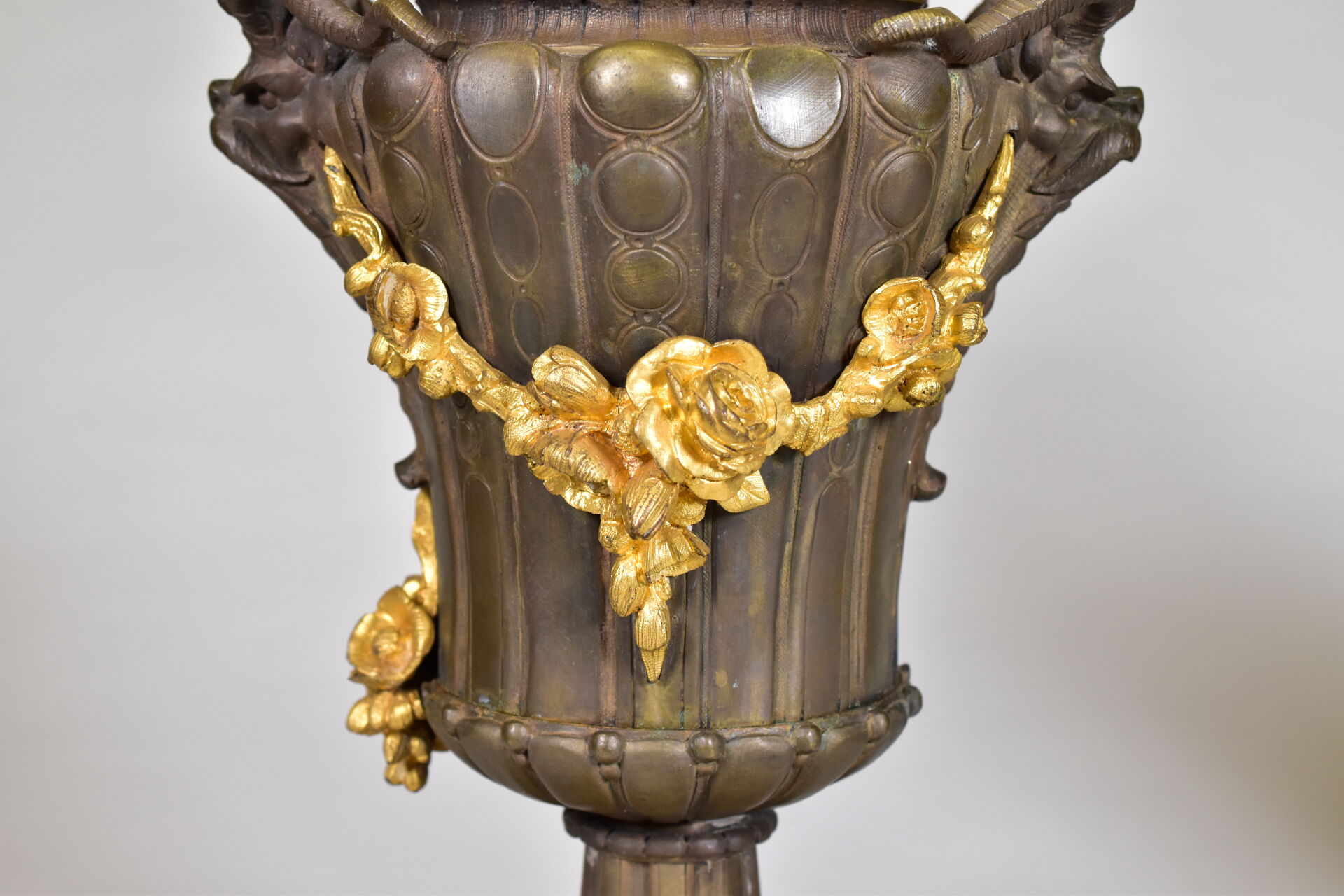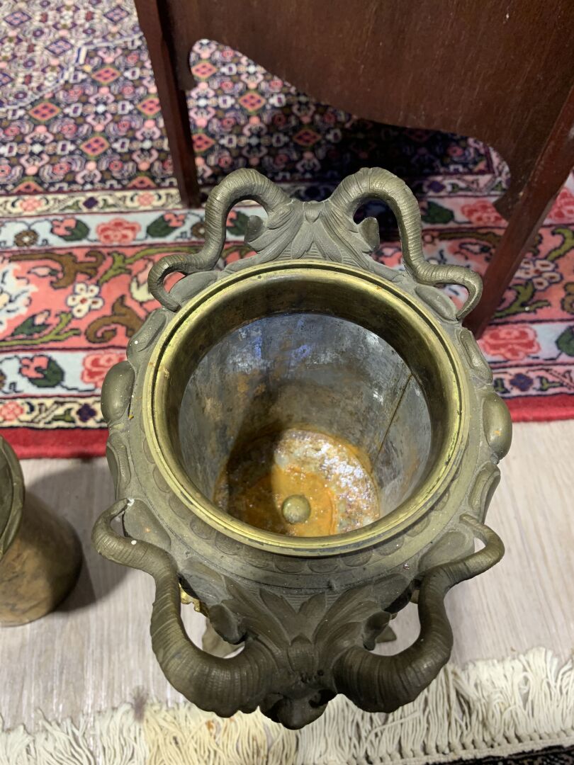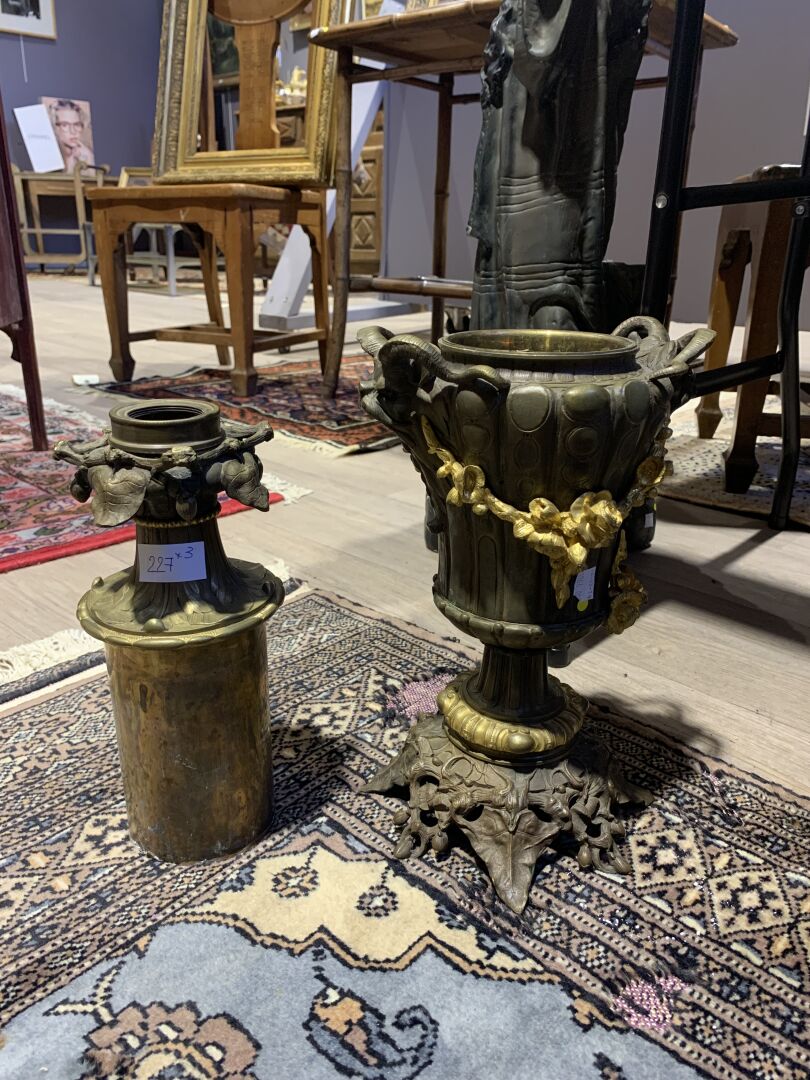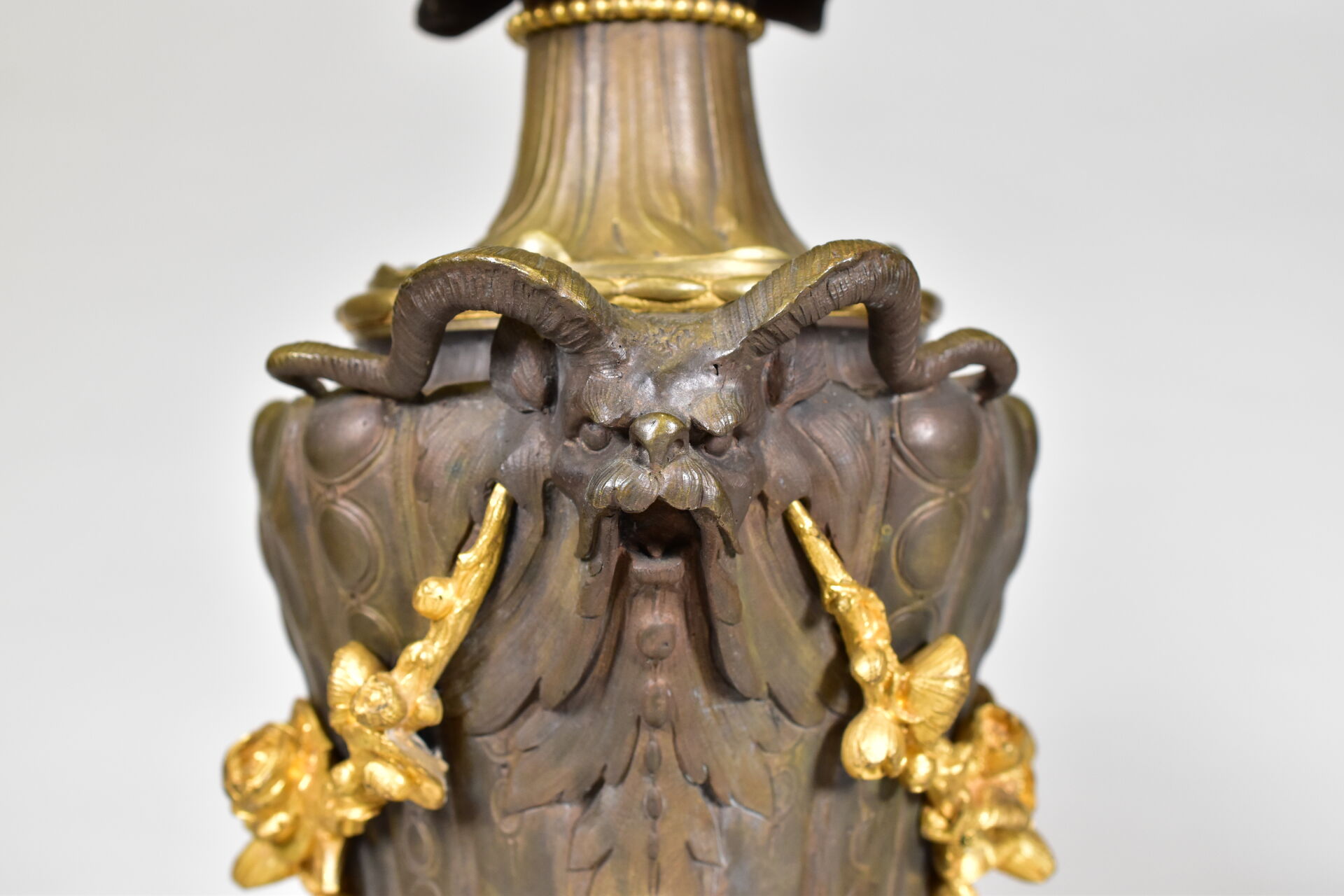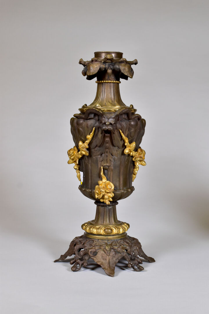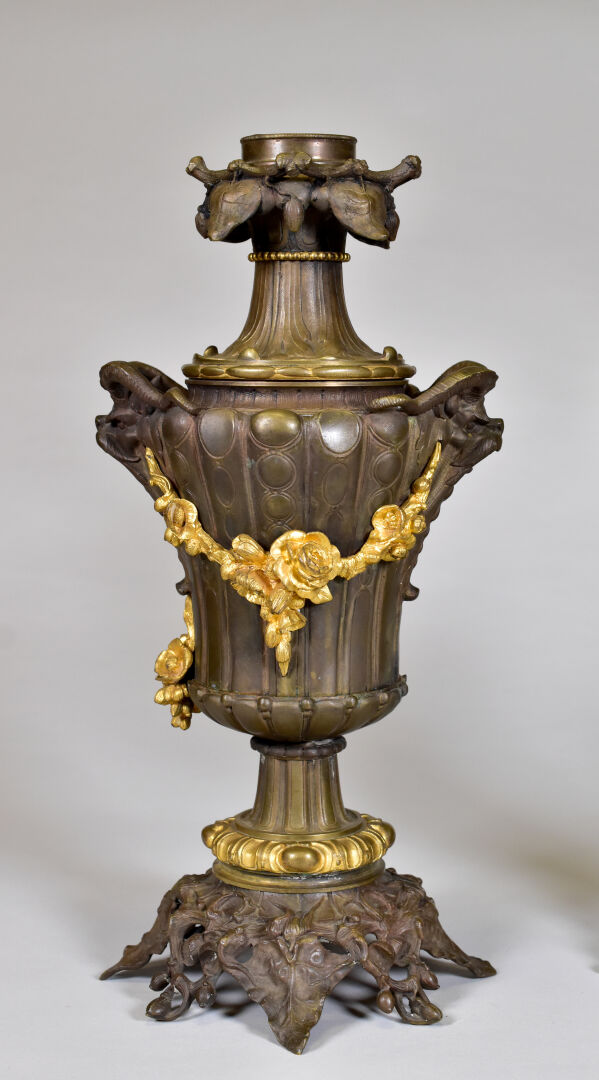 Paire de lampes à huile en bronze patiné brun et doré à décor de mascarons de bélier, lierre, guirlandes de fleurs en chute (un élément à refixer). Fin du XIXe siècle. Haut. : 43 cm.