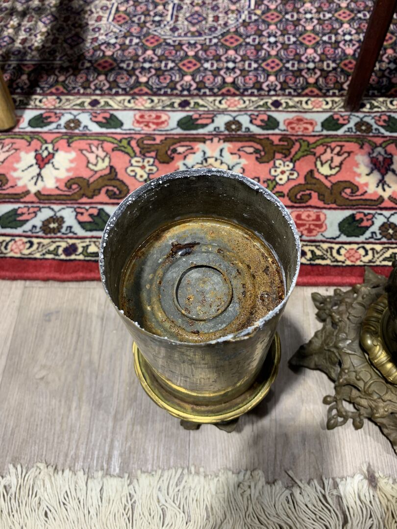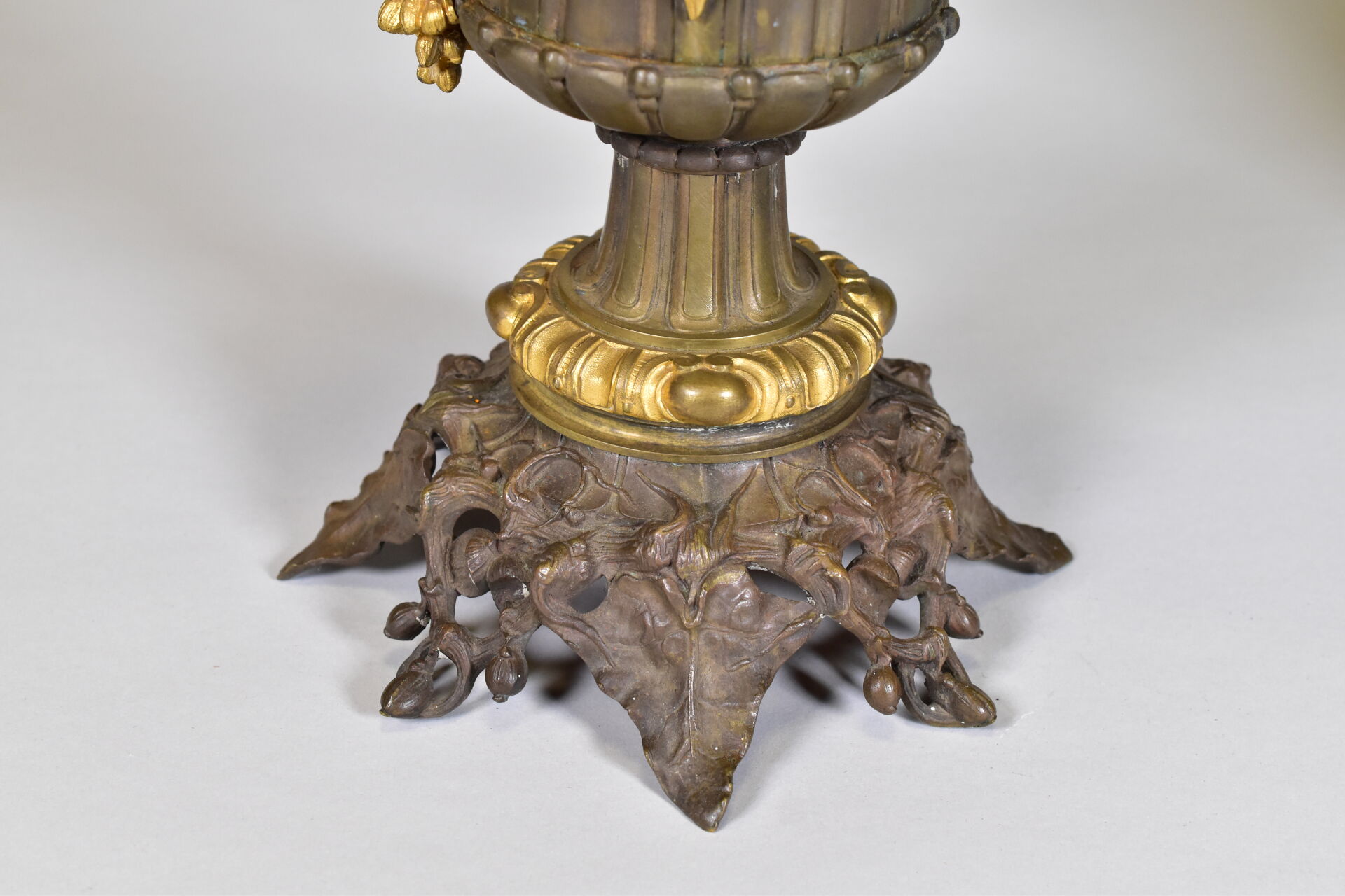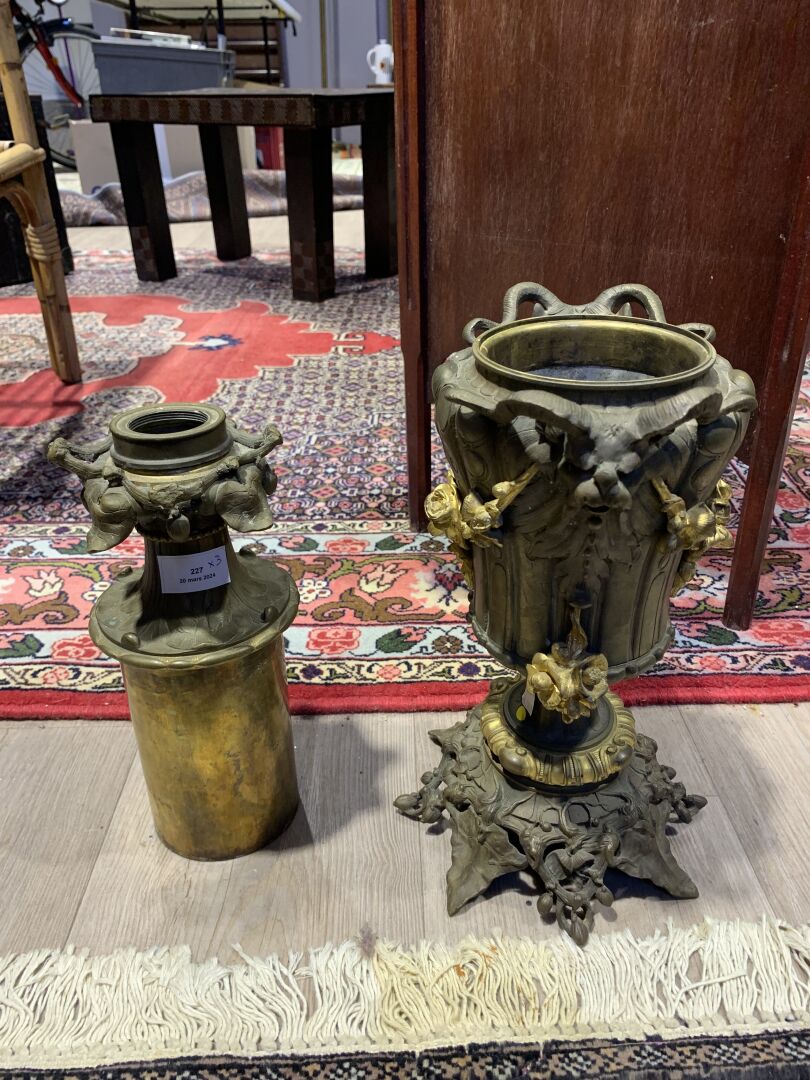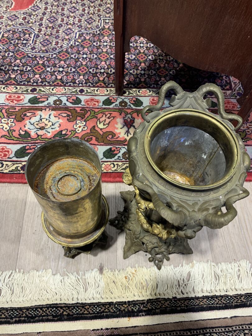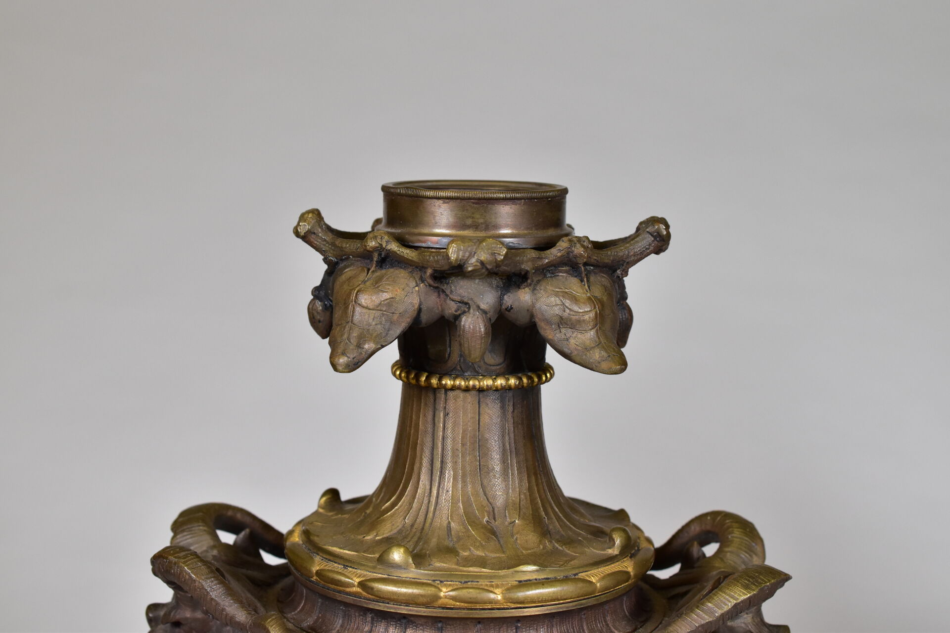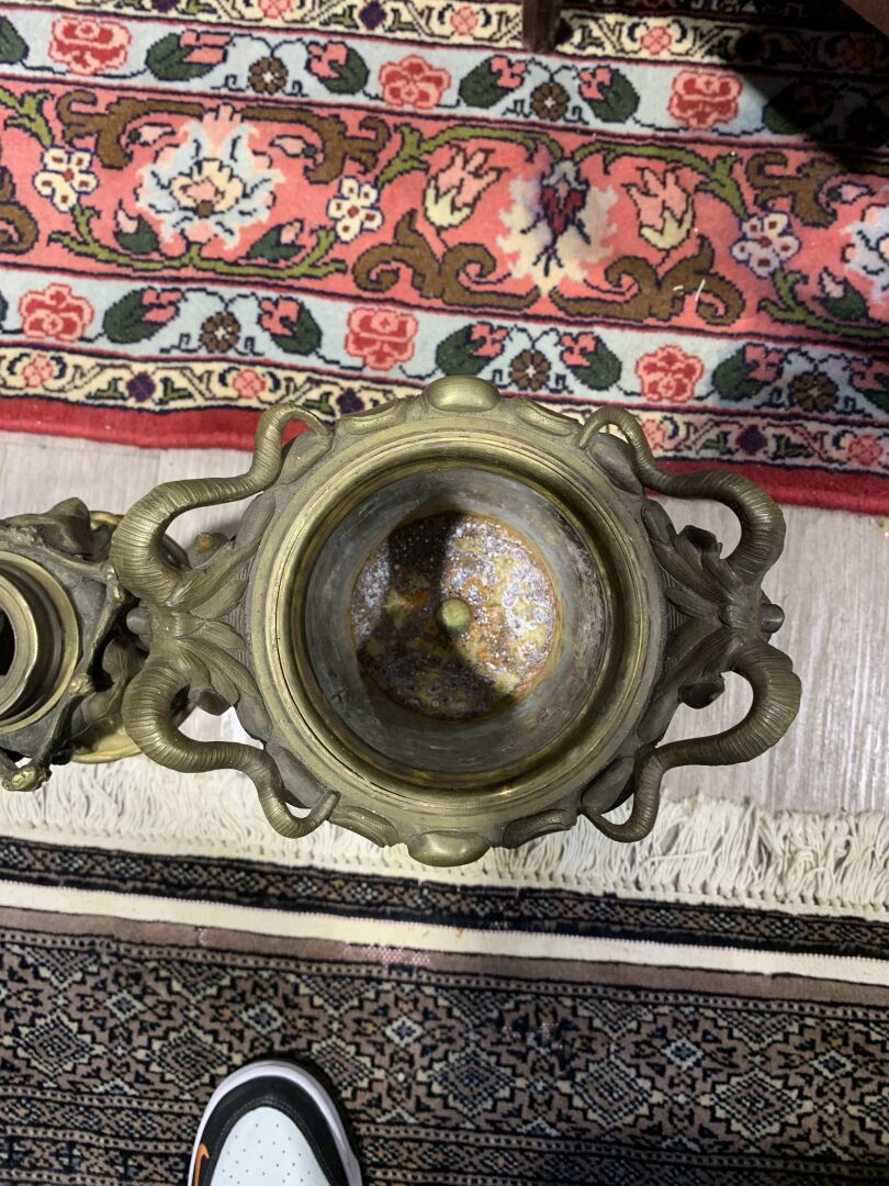 Paire de lampes à huile en bronze patiné brun et doré à décor de mascarons de bélier, lierre, guirlandes de fleurs en chute (un élément à refixer). Fin du XIXe siècle. Haut. : 43 cm.