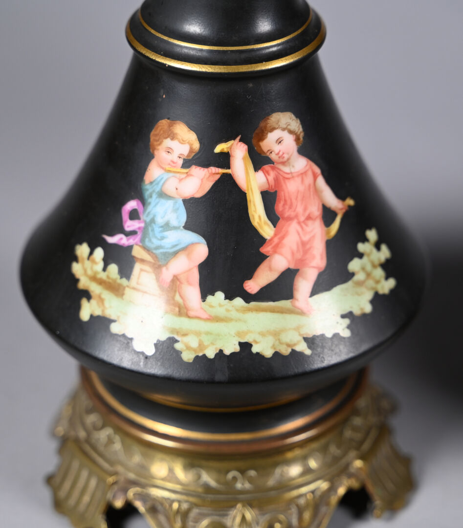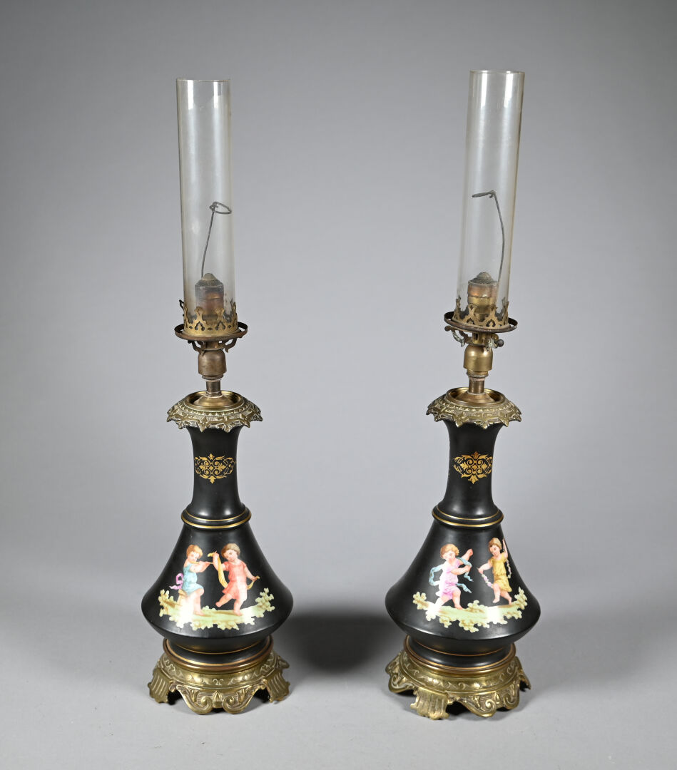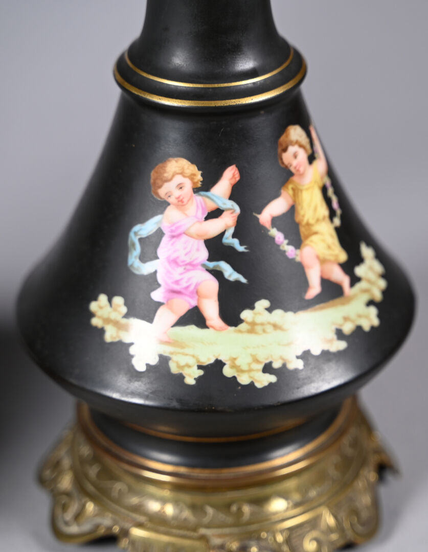 Paire de lampes à huile en porcelaine à décor peint en polychromie de putti sur fond noir. Avec deux cheminées dont une accidentée Fin du XIXe siècle. Haut. : 43,5 cm sans les cheminées.