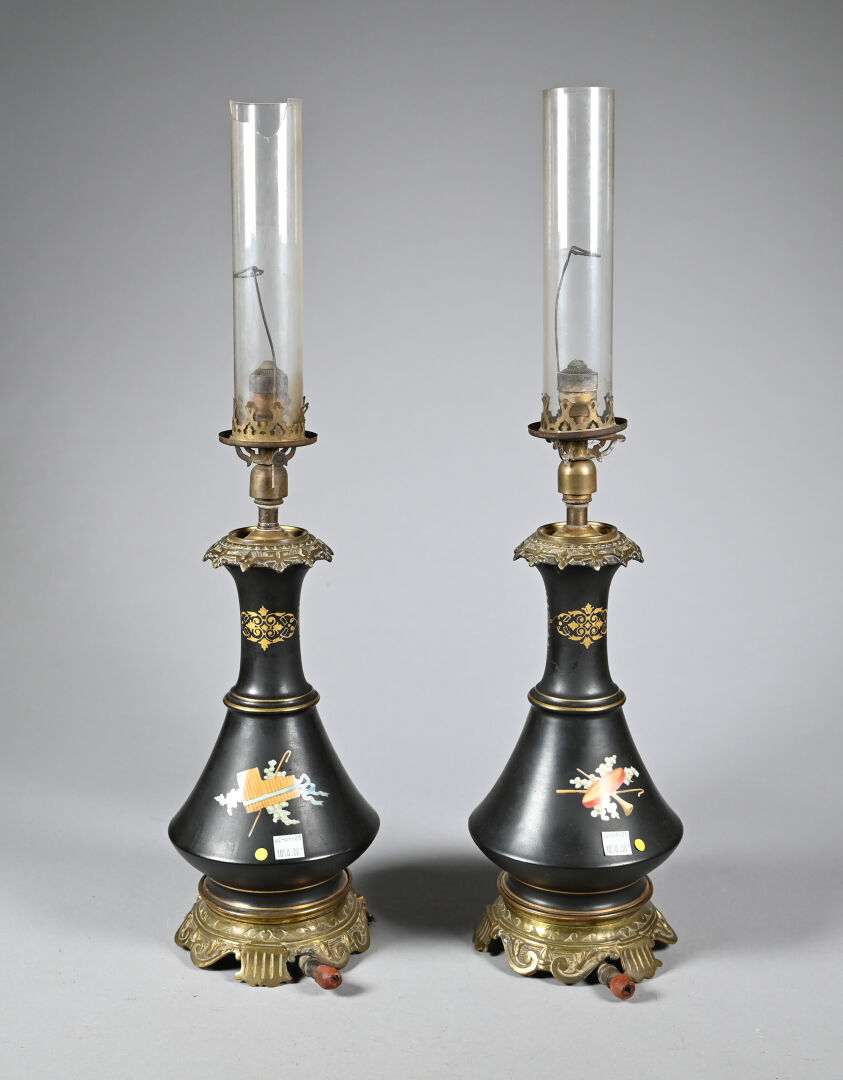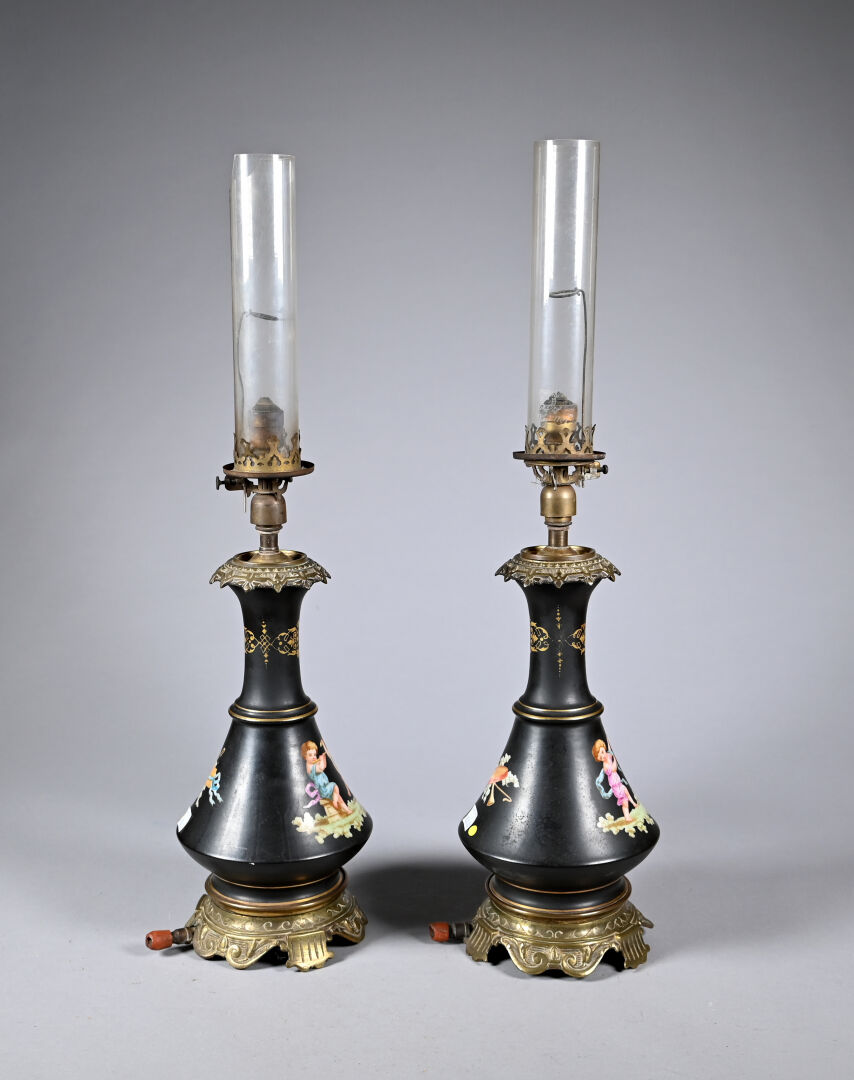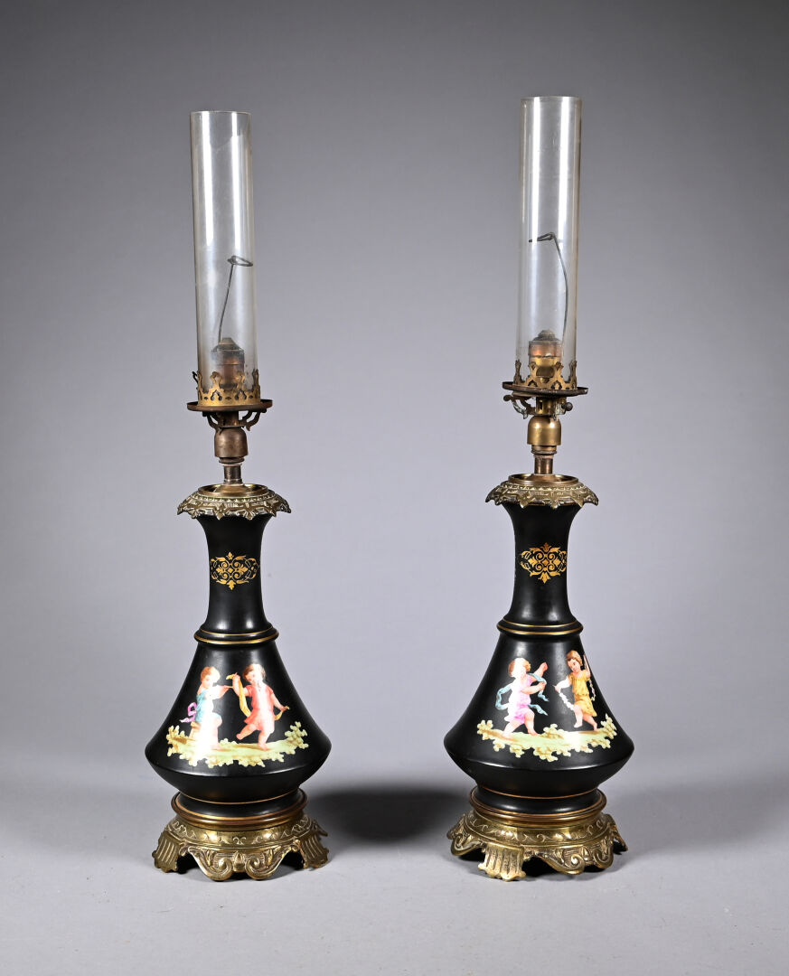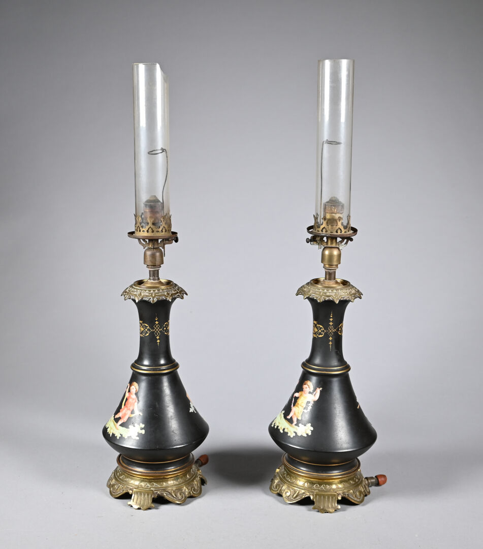 Paire de lampes à huile en porcelaine à décor peint en polychromie de putti sur fond noir. Avec deux cheminées dont une accidentée Fin du XIXe siècle. Haut. : 43,5 cm sans les cheminées.