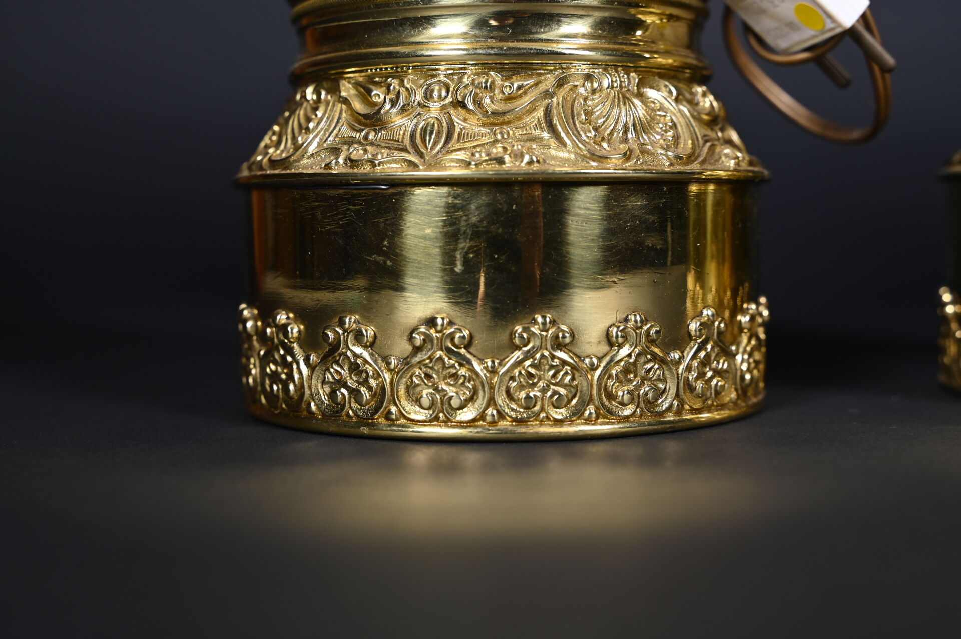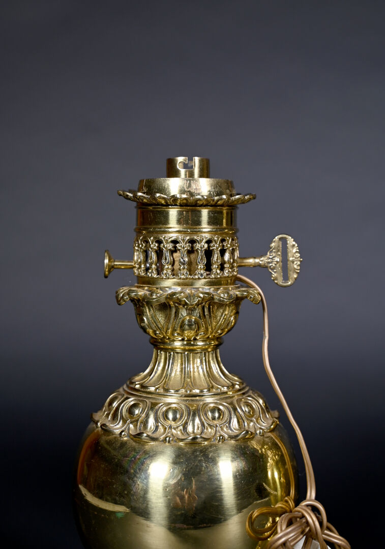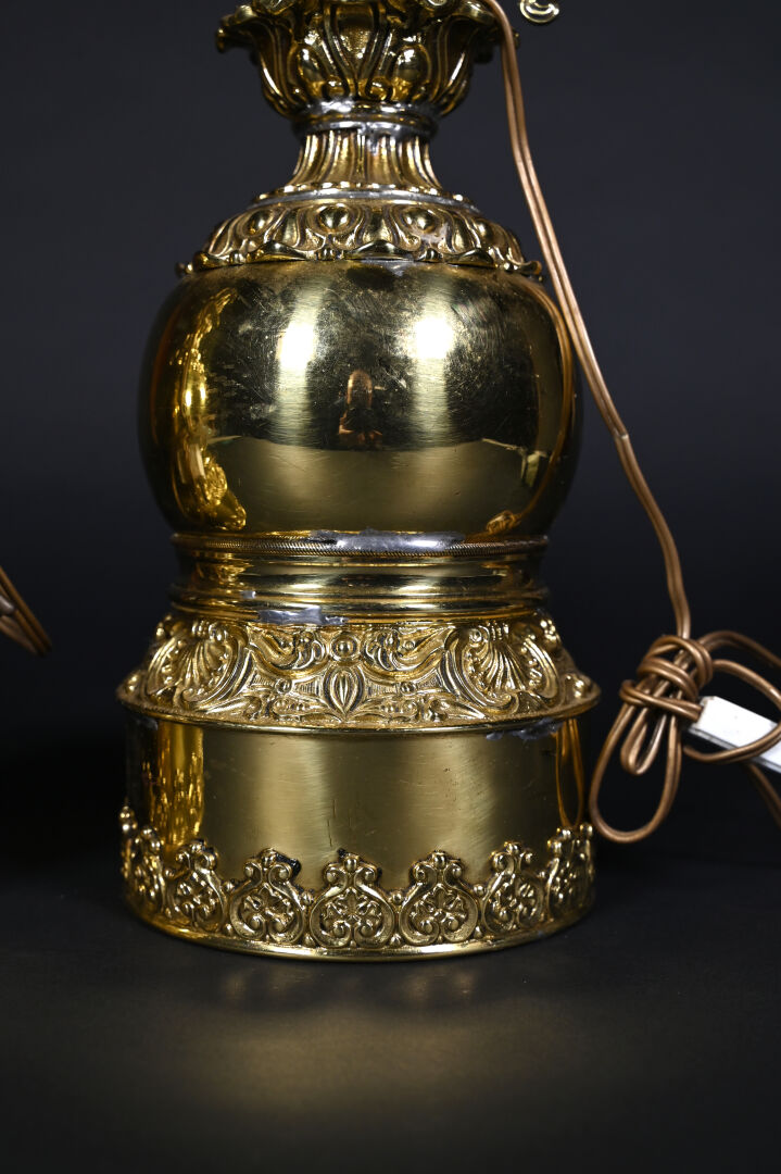 Paire de lampes à pétrole en cuivre (accident, soudures). Début du XXe siècle. Haut. : 32,5 cm.