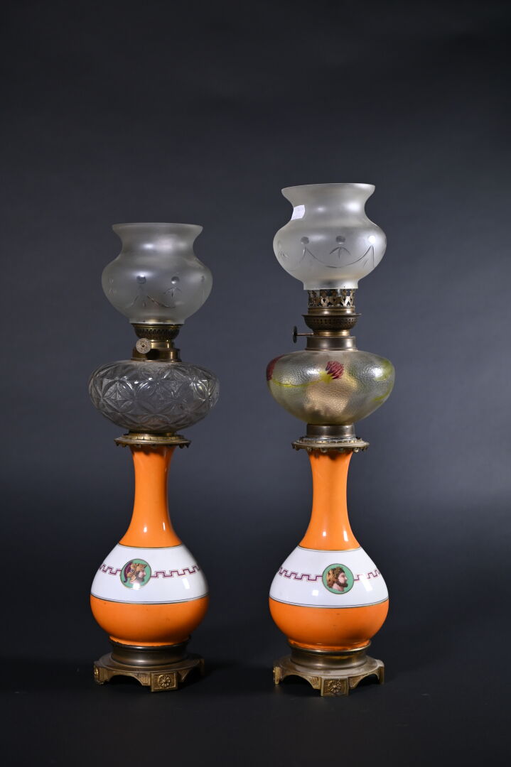Paire de lampes à pétrole en porcelaine à décor à l’antique de profil, frises de grecques sur fond orange. Fin du XIXe siècle. Les réservoirs rapportés.Haut; : 55 cm.