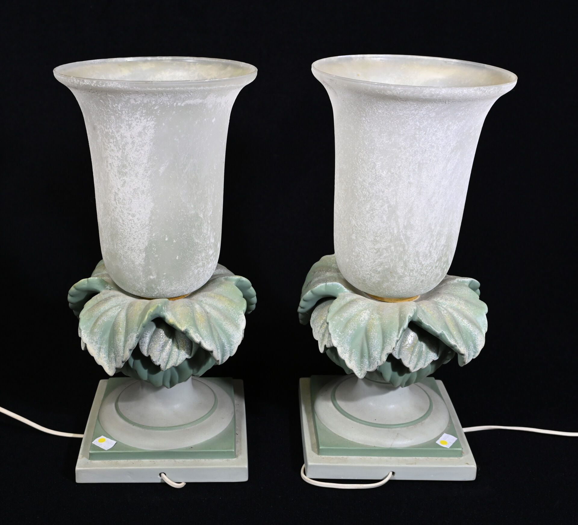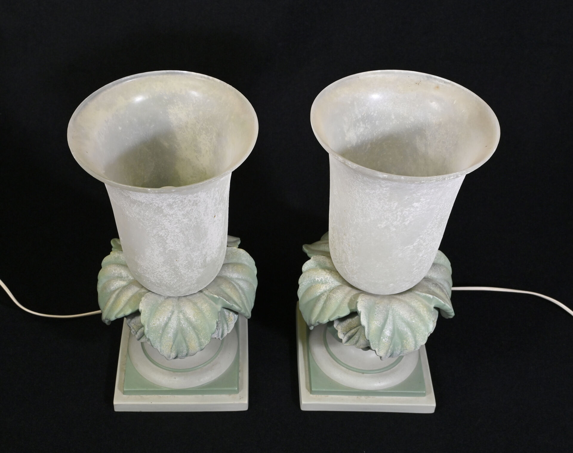 Paire de lampes cornet en céramique à motif végétal en vert et gris métallisé. Les cônes en verre marmoréen crème. Vers 1980. Haut. : 44 cm.