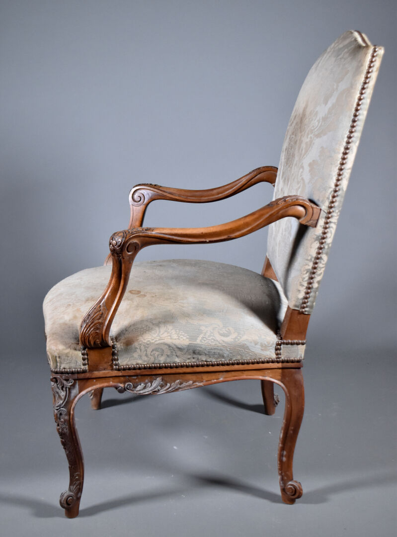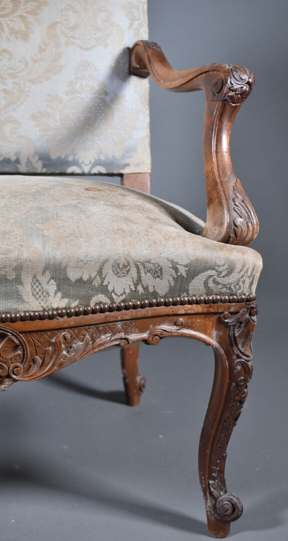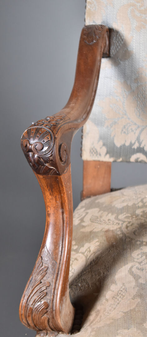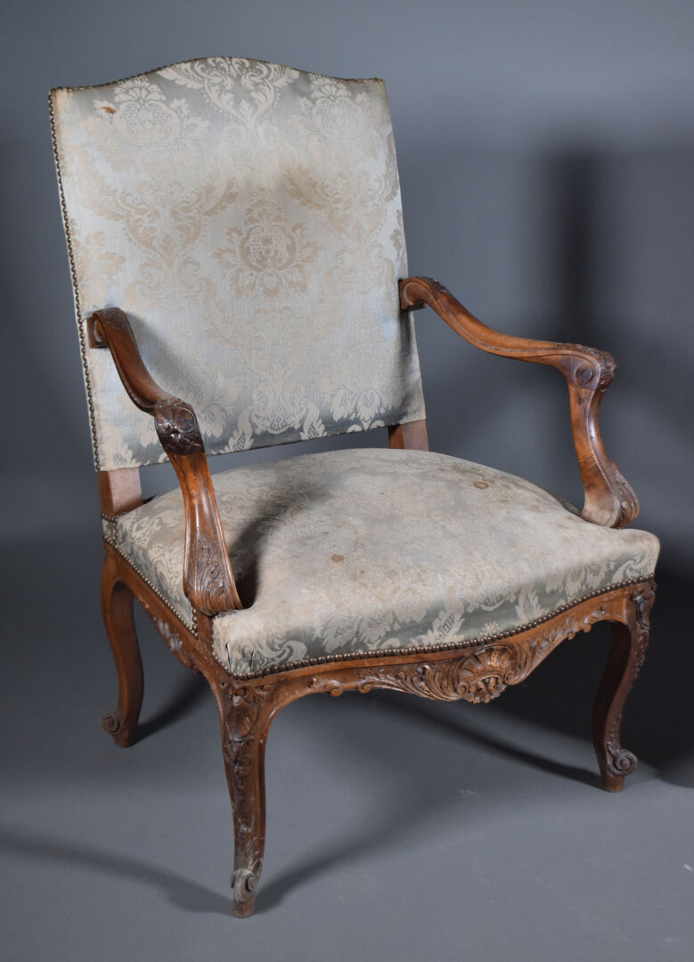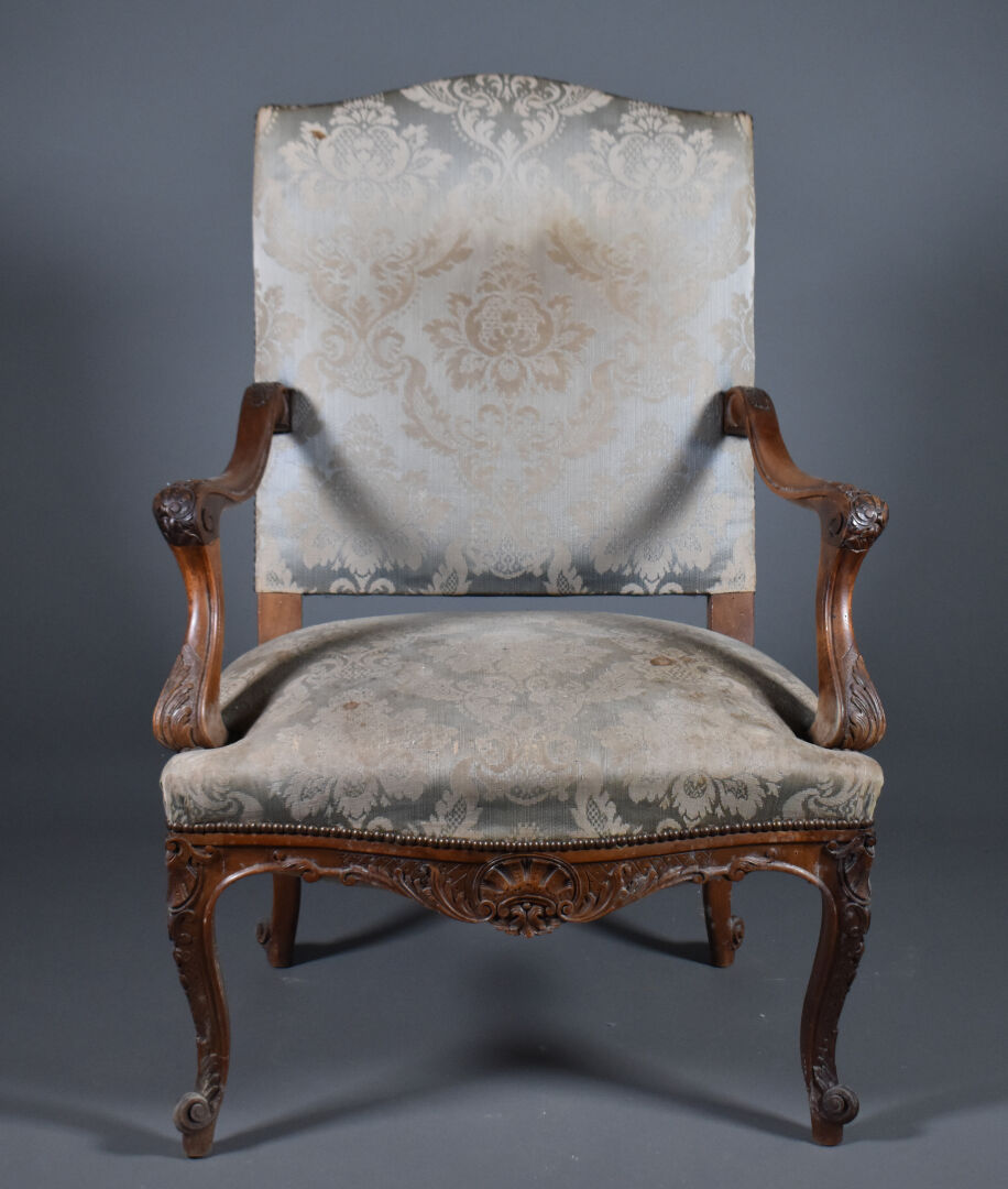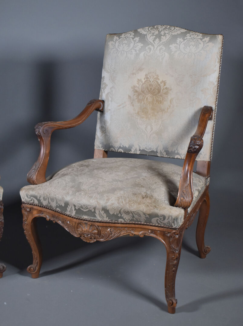 Paire de larges fauteuils en noyer mouluré sculpté, les accotoirs à supports en coup de fouet. Les pieds cambrés terminés par des enroulements. Décor sculpté de coquilles et fleurettes. Les dossiers en chapeau de gendarme. Garniture de satin bleu vert et ocre (usures et taches). Style Régence, XIXe siècle. Haut. : 100 cm.
