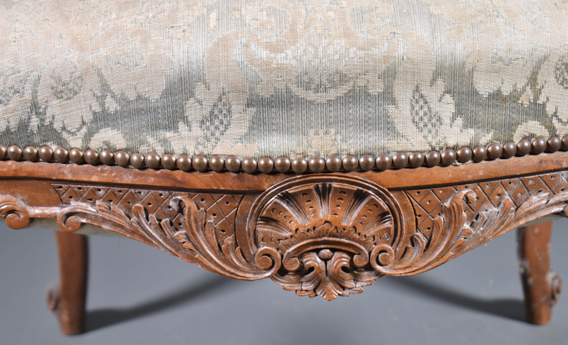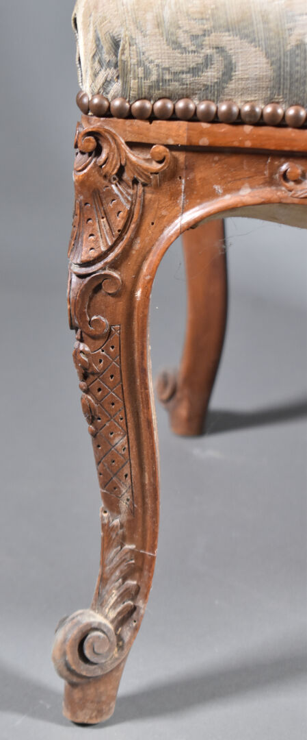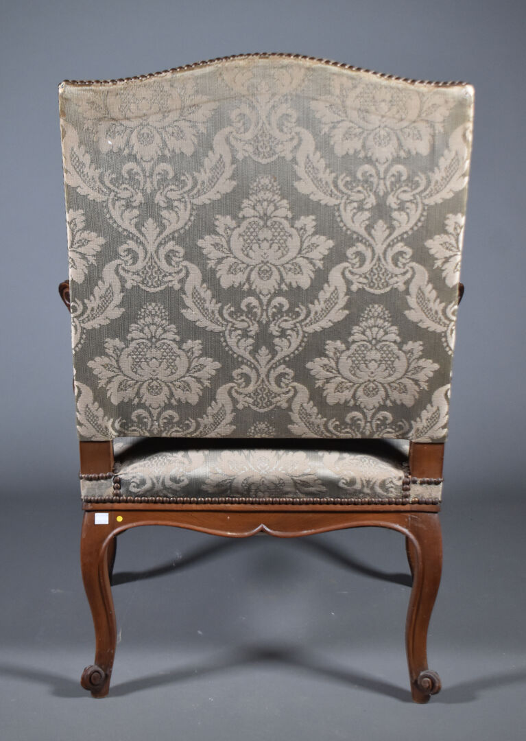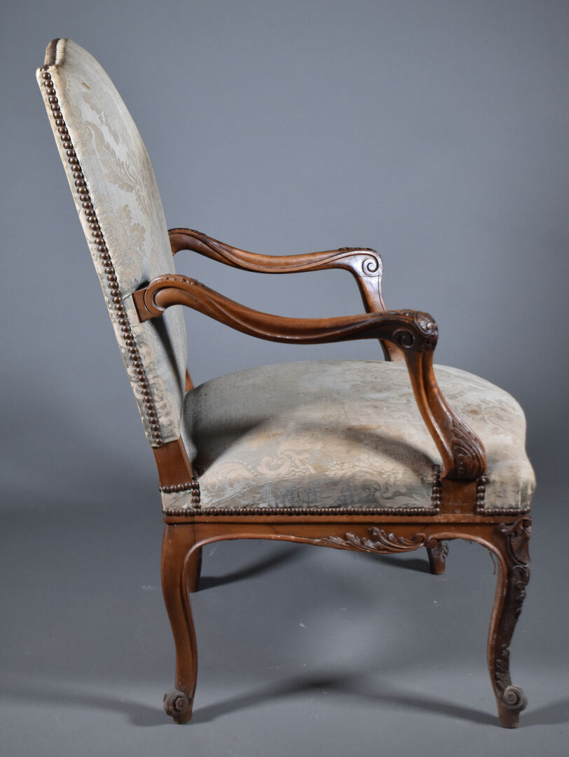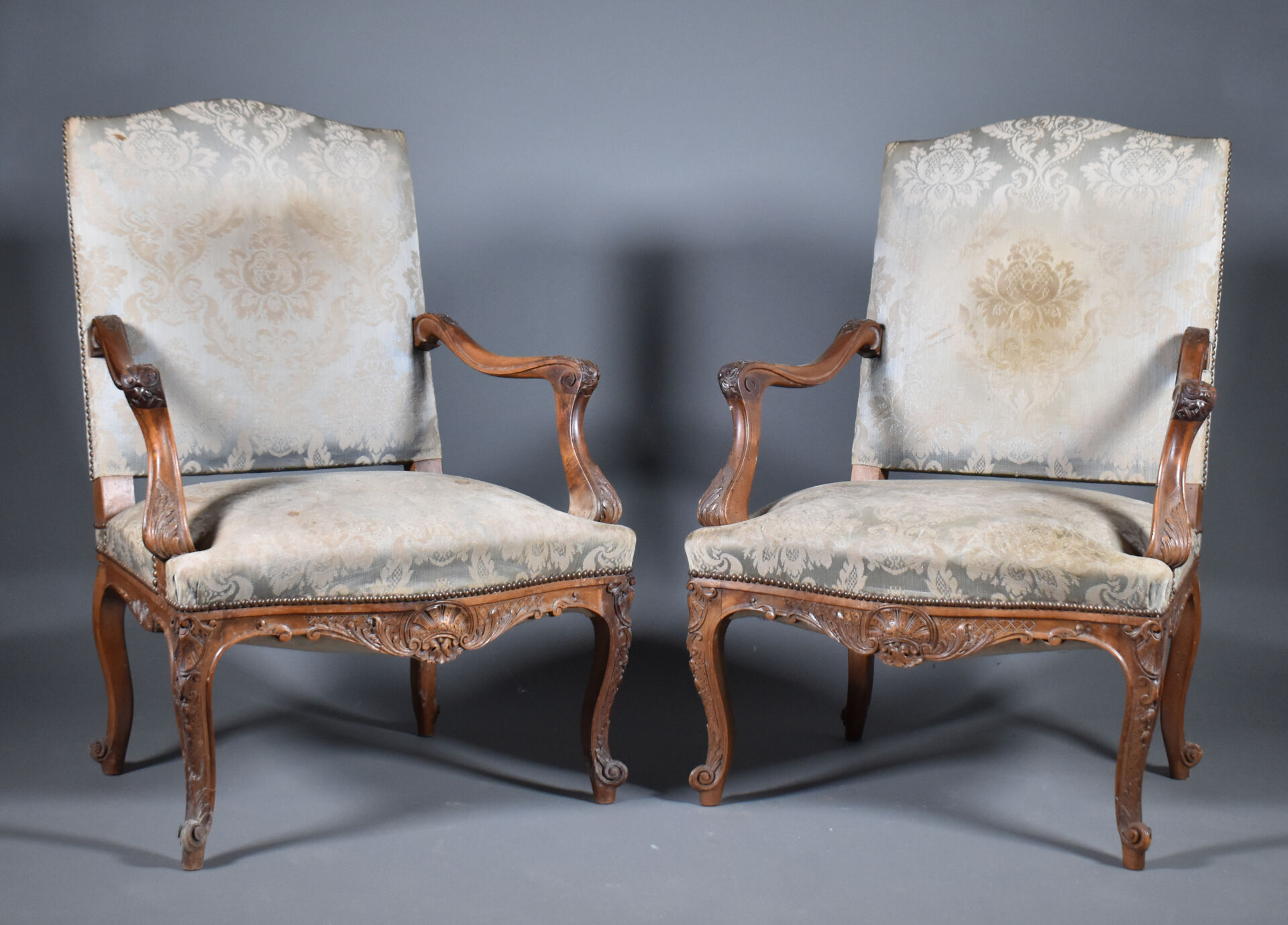 Paire de larges fauteuils en noyer mouluré sculpté, les accotoirs à supports en coup de fouet. Les pieds cambrés terminés par des enroulements. Décor sculpté de coquilles et fleurettes. Les dossiers en chapeau de gendarme. Garniture de satin bleu vert et ocre (usures et taches). Style Régence, XIXe siècle. Haut. : 100 cm.