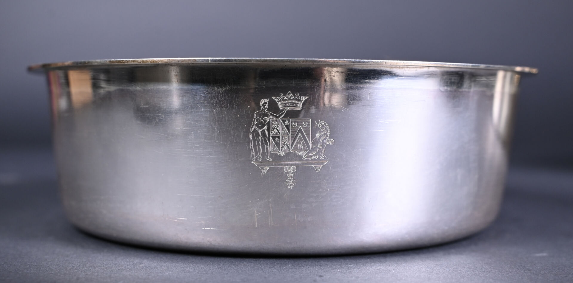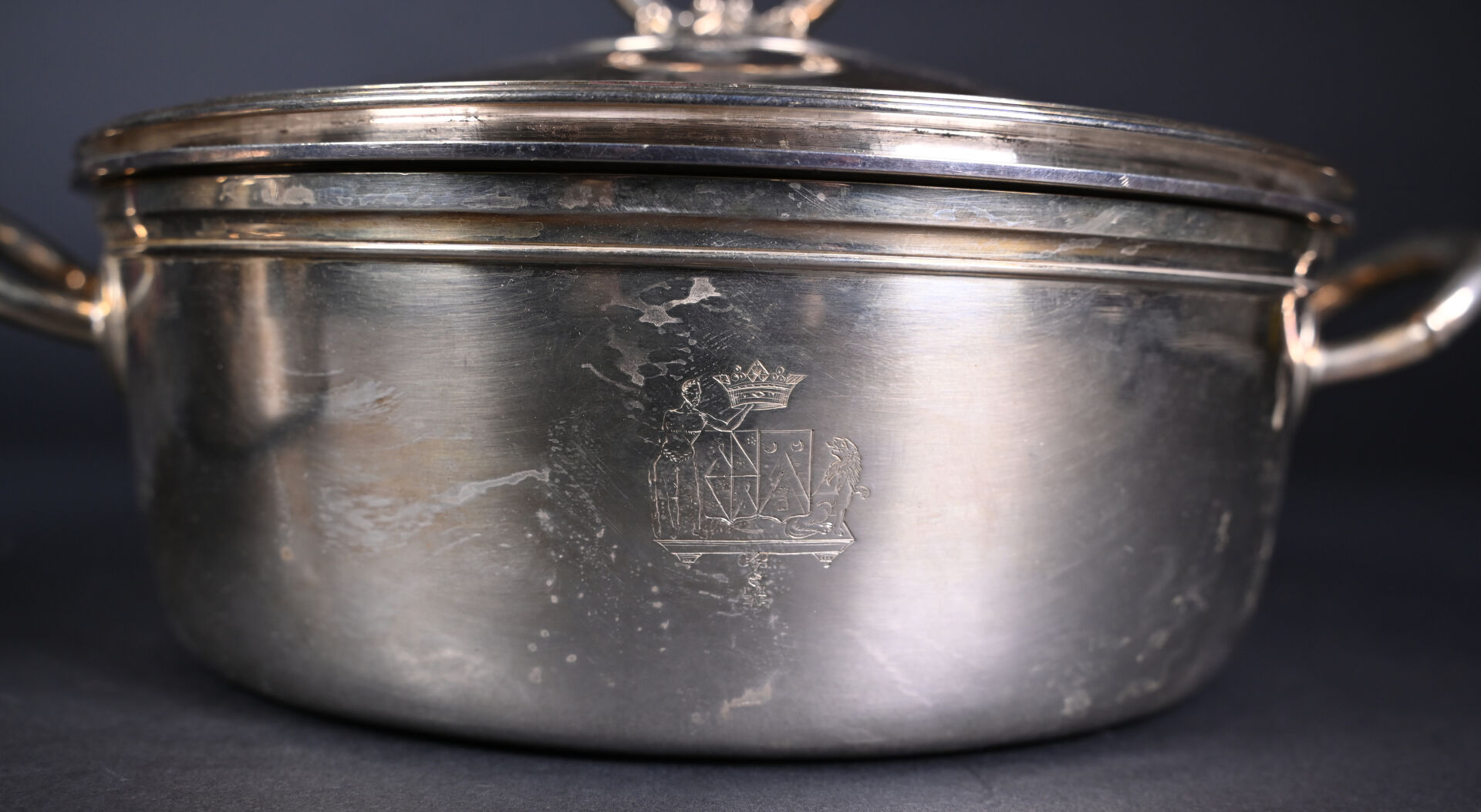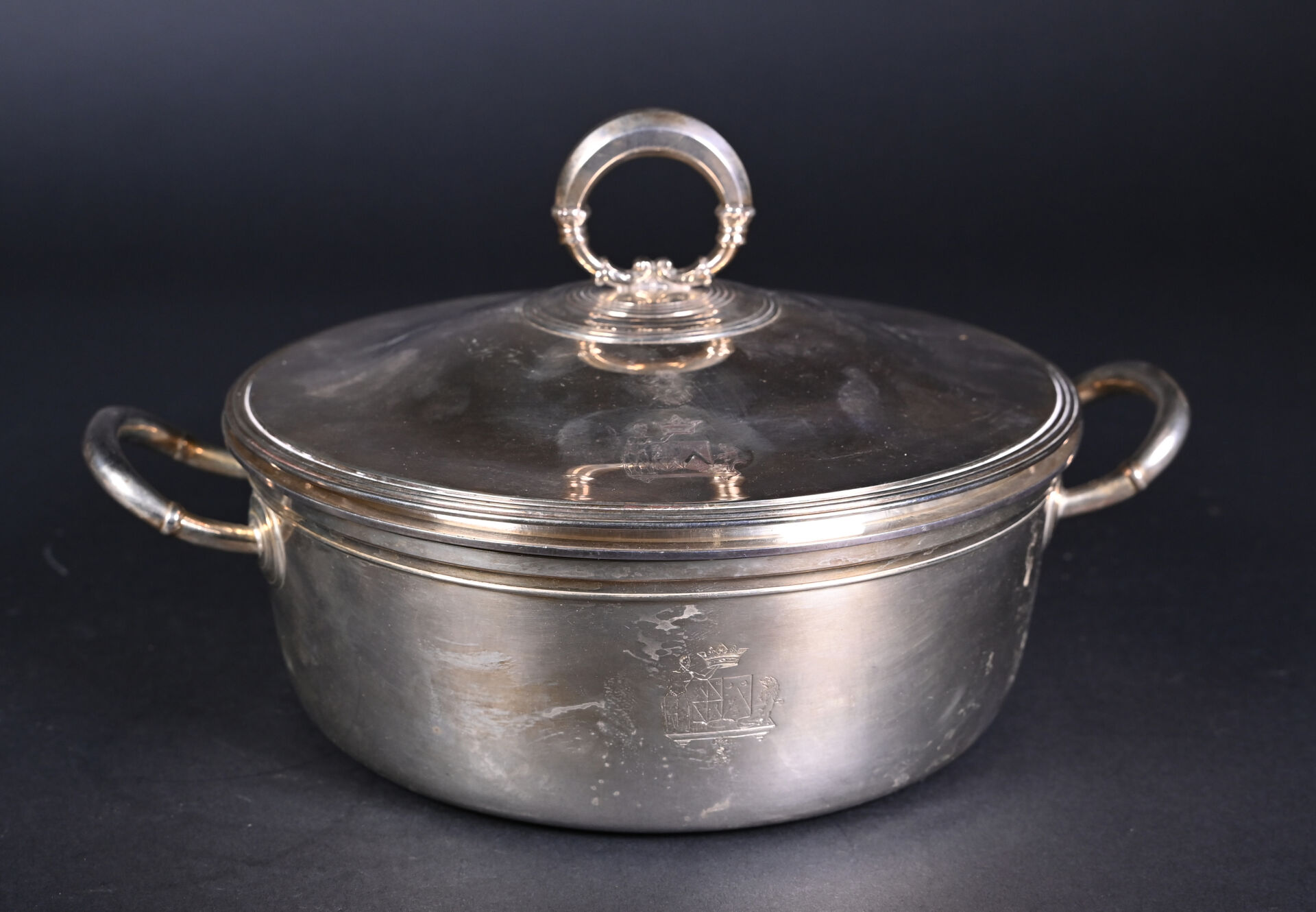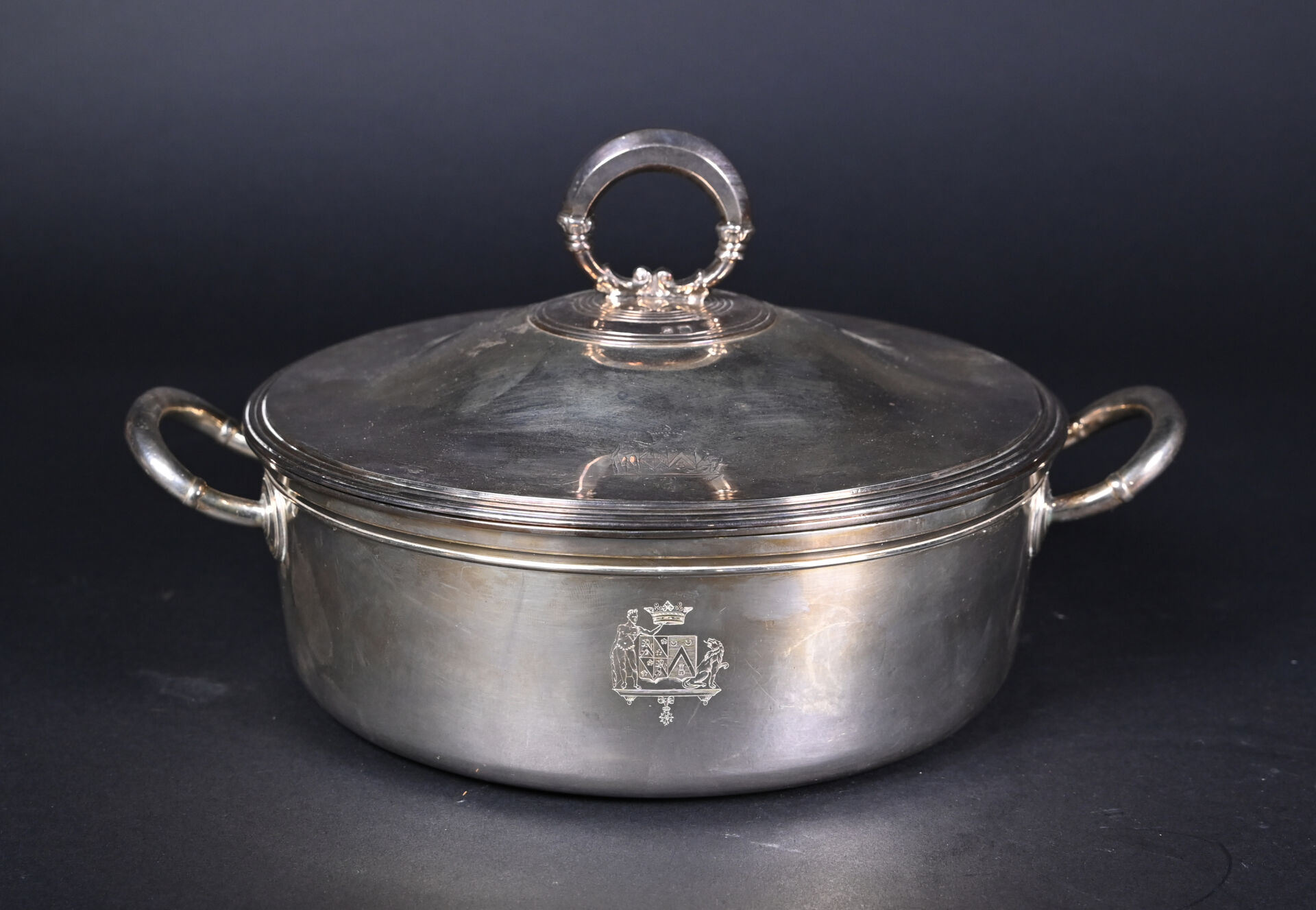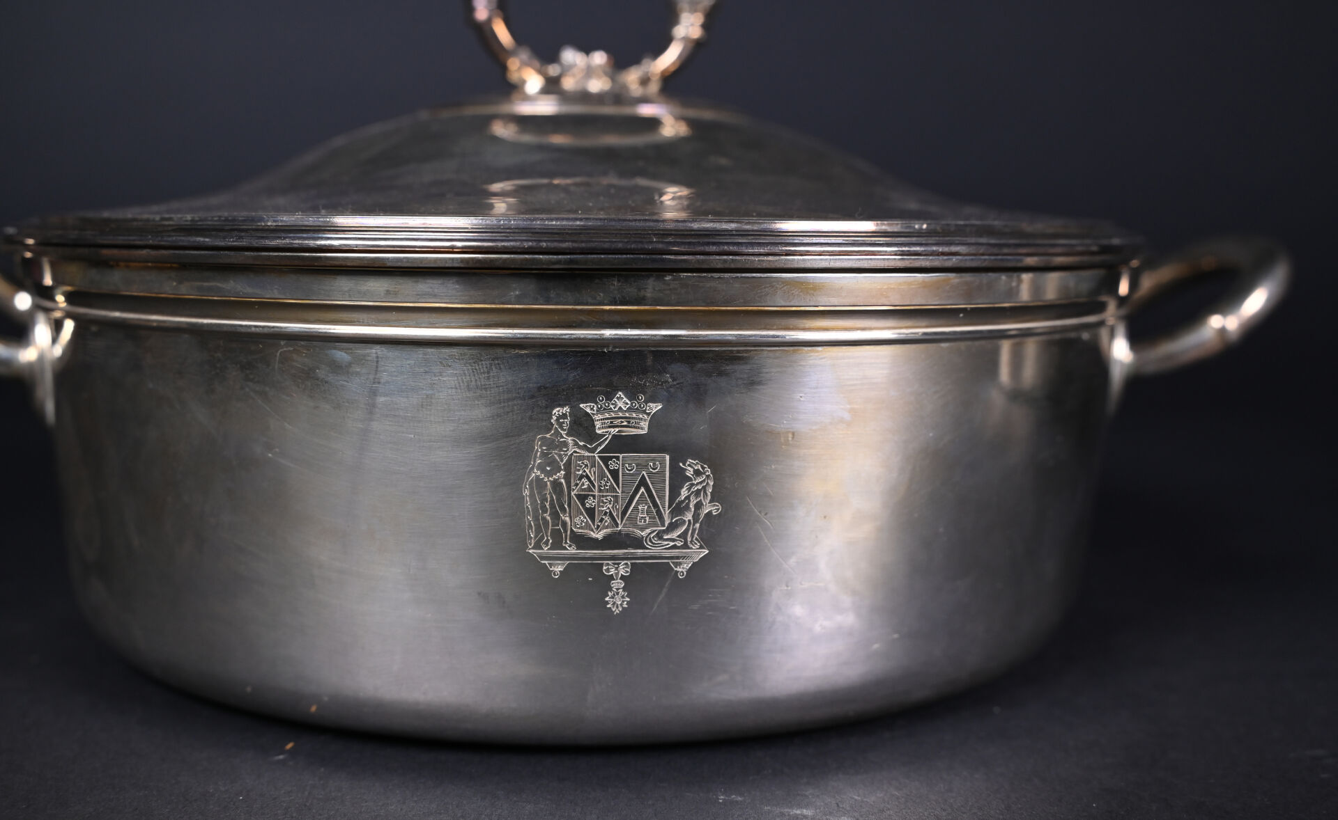 Paire de légumiers en argent 925/1000e (poinçon vieillard) à décor ciselé d’armoiries de Louis Thomas RICHARD d’AUBIGNY avec Hercules et le Lion de Némée sous une couronne de marquis. Les intérieurs amovibles en argent. Orfèvre DL, Fleuron et étoile. Poids total : 3 257 g.