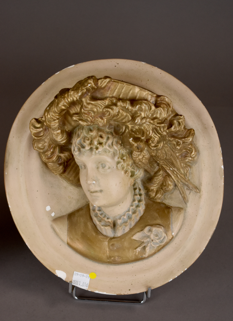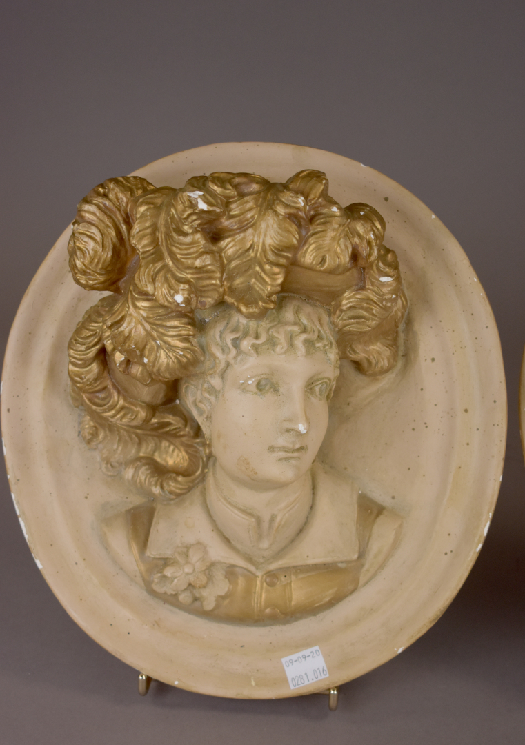 Paire de médaillons en plâtre partiellement doré figurant des élégantes coiffées de châpeaux (éclats). Vers 1900. Diam. : 26,5 cm.