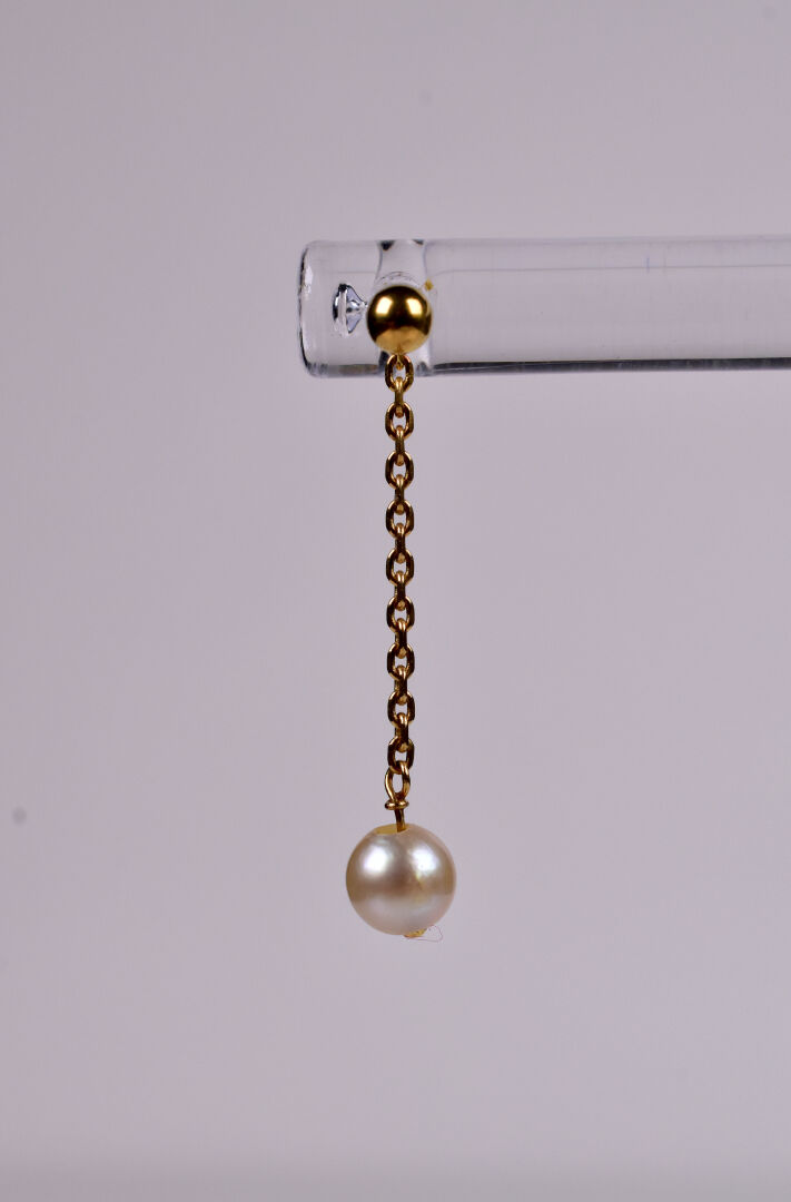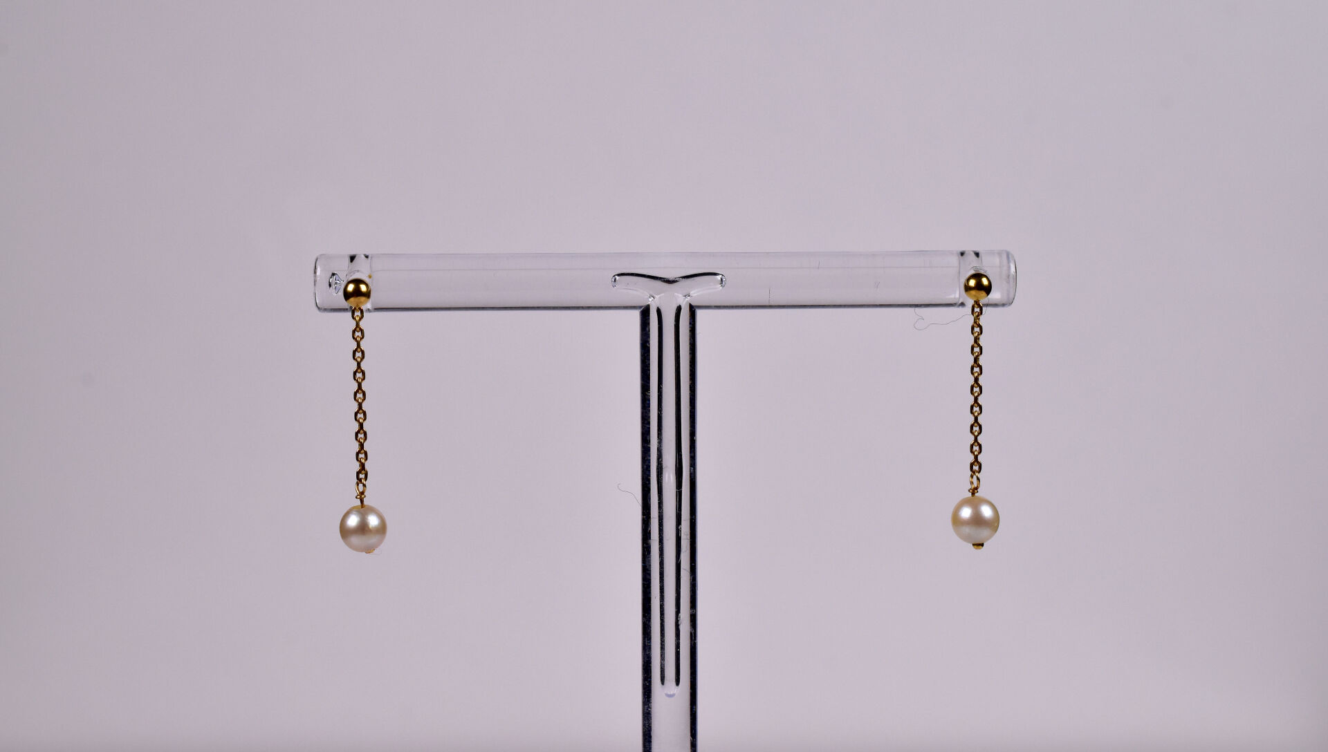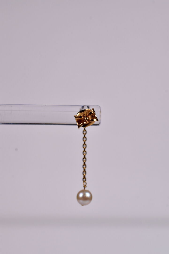 Paire de pendants d’oreilles en or 750/1000e et petites perles. Haut : 2 cm. Poids brut : 1 g.