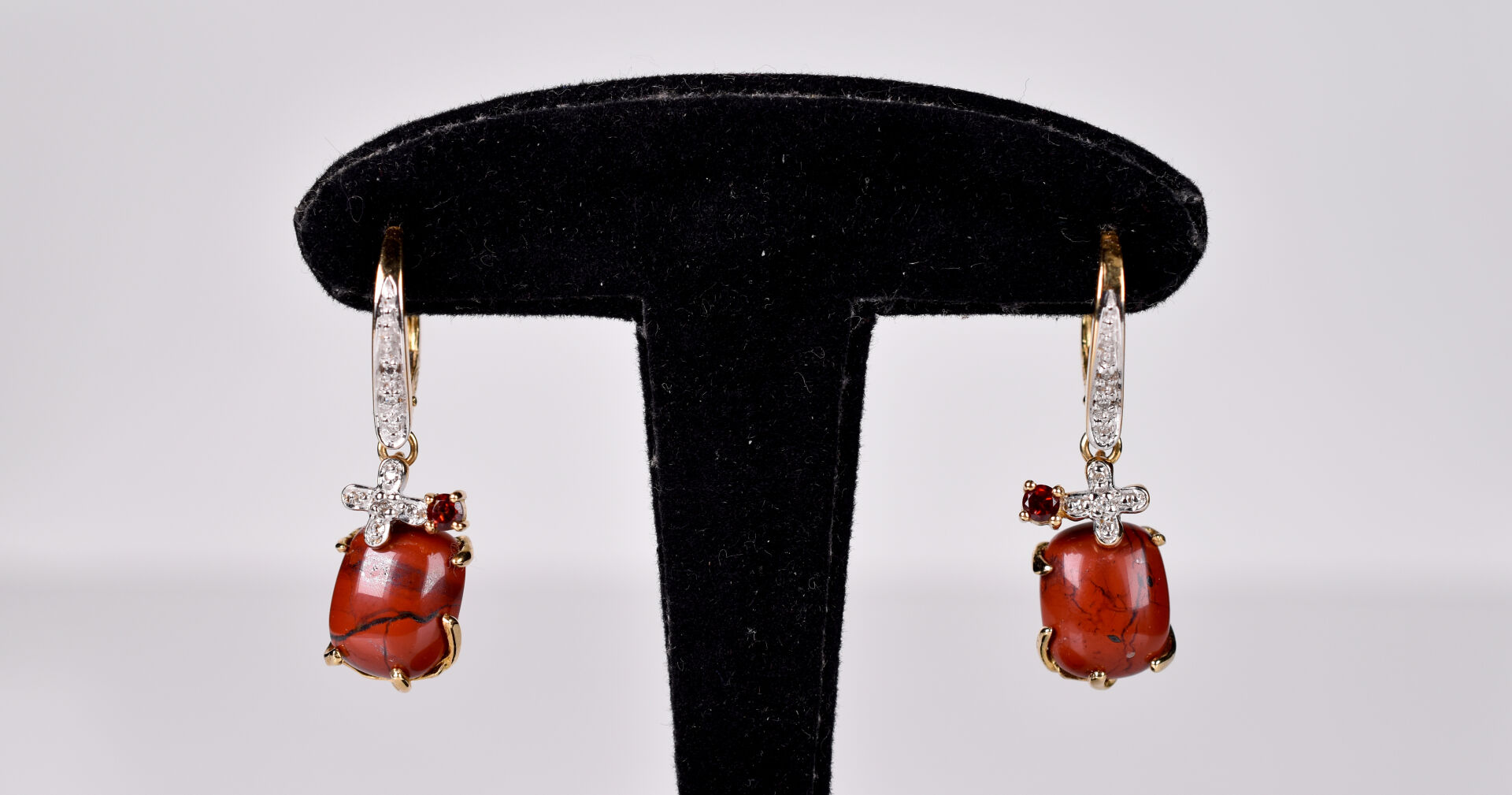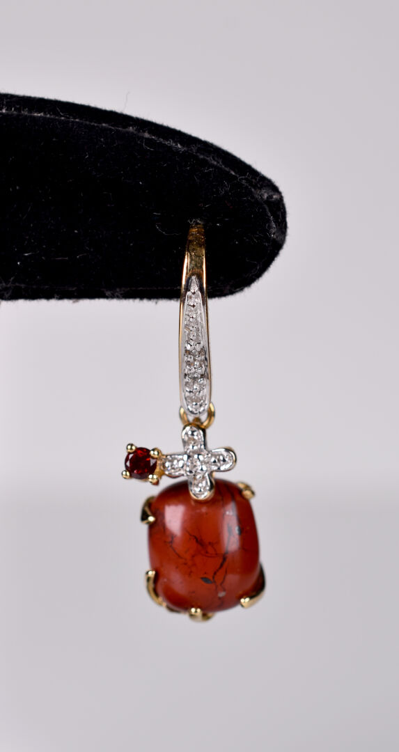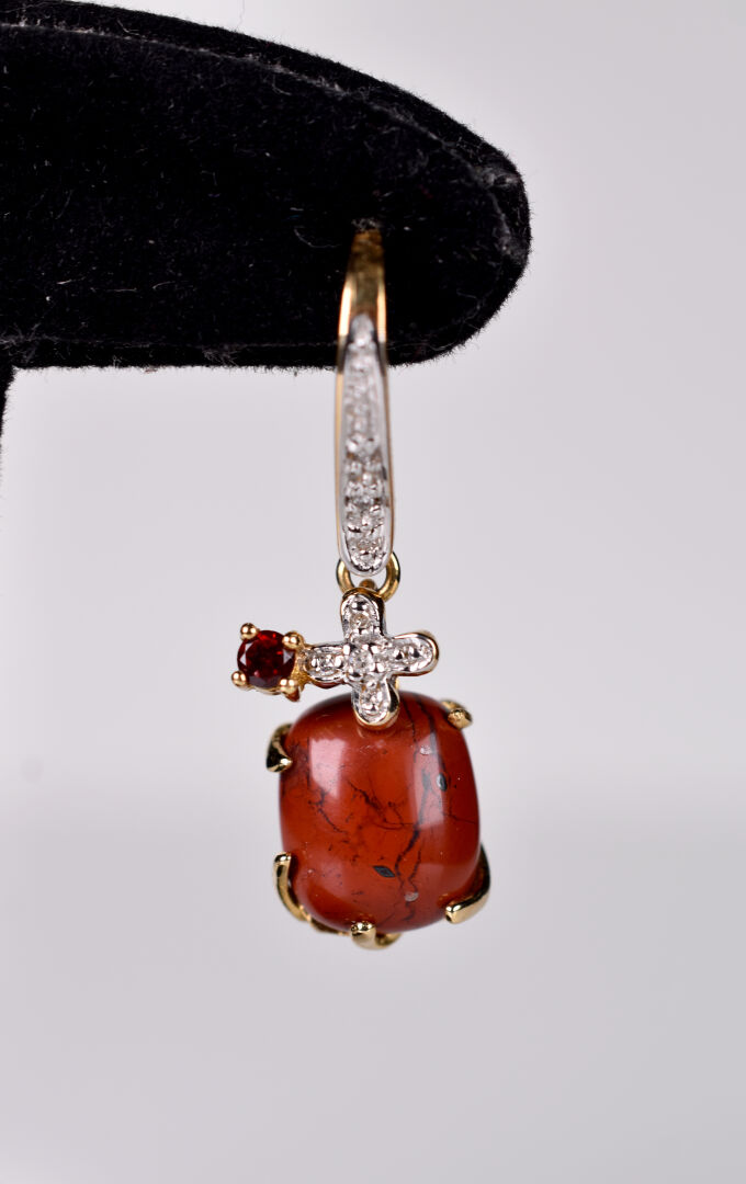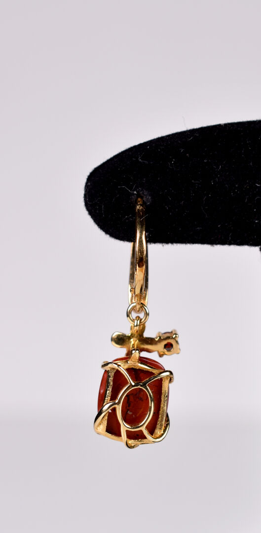 Paire de pendants d’oreilles en or jaune 18K 750/1000e orné de jaspe orange, petits diamants et grenats oranges. Haut. : 3 cm. Poids brut. : 5,8 g.