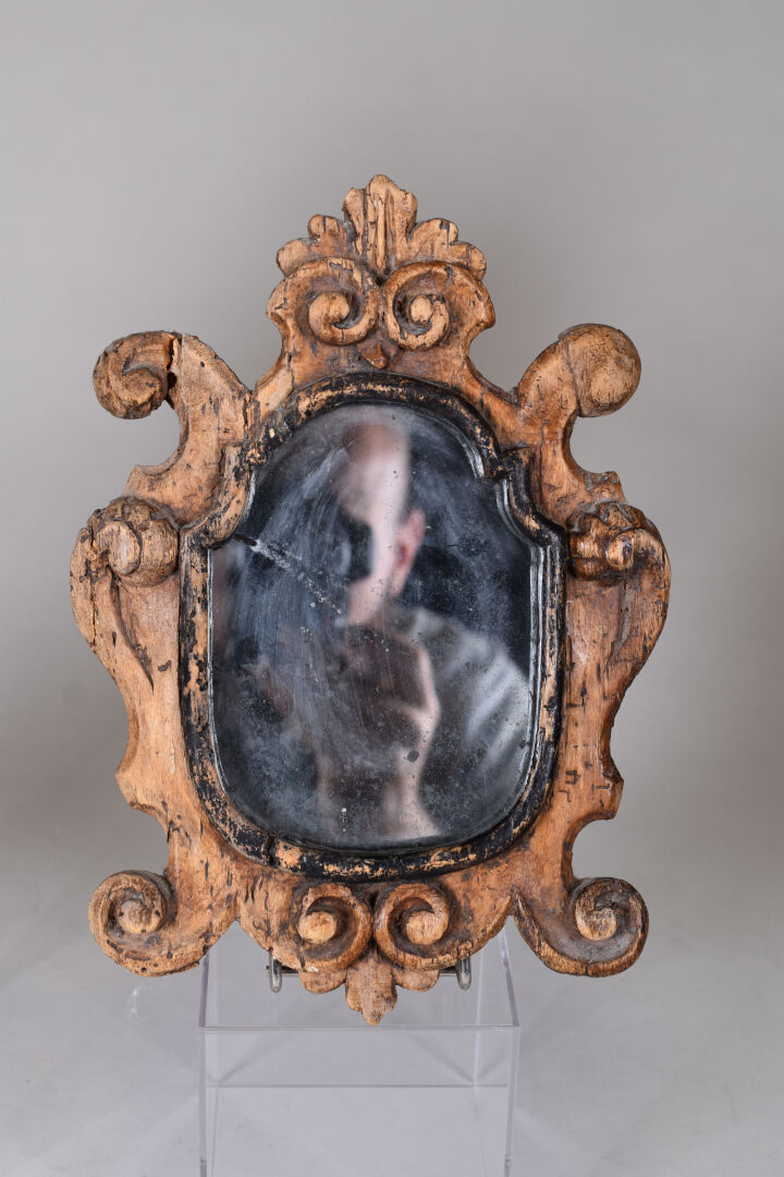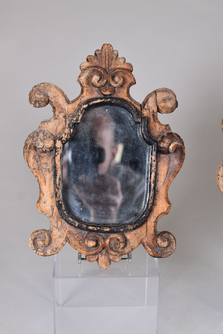 Paire de petits miroirs en bois sculpté de motifs en consoles (usures, traces d’insectes xylophages, restaurations). Travail italien du XVIIIe siècle. 26,5 x 19 cm.