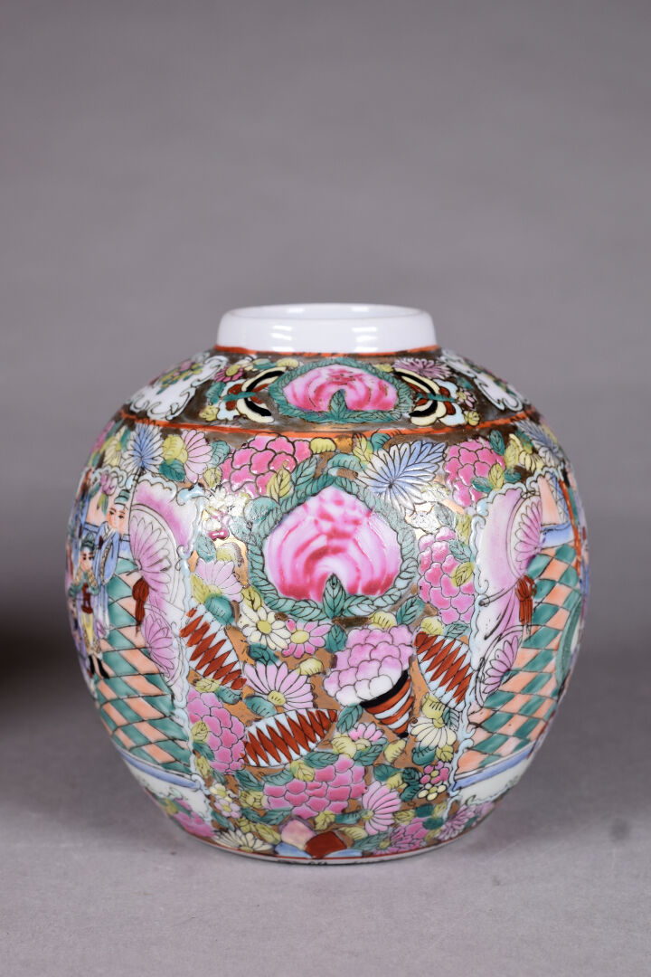 Paire de petits pots couverts ou pots à gingembre en porcelaine émaillée en polychromie et dorure de scènes de Palais, fleurs et papillons. Chine, Canton ? XXe siècle. Haut. : 17 cm.