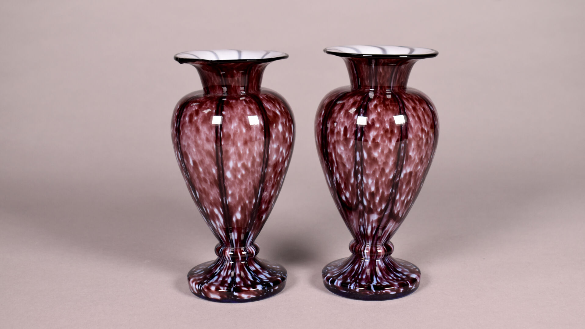 Paire de petits vases balustre en verre marmoréen prune, l’intérieur en blanc. Dans le goût de Clichy ? Haut. : 17 cm.