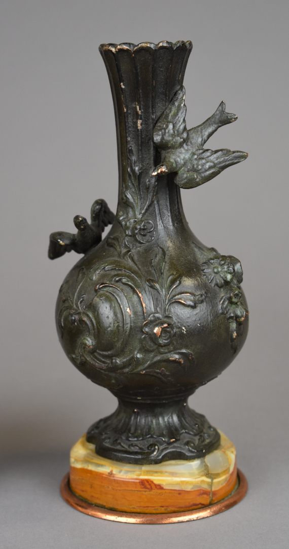 Paire de petits vases en métal (probablement régule) patiné brun vert à décor d’un couple d’oiseaux branchés. Socle de pierre dure rouge. Vers 1900. Haut. : 20,5 cm.