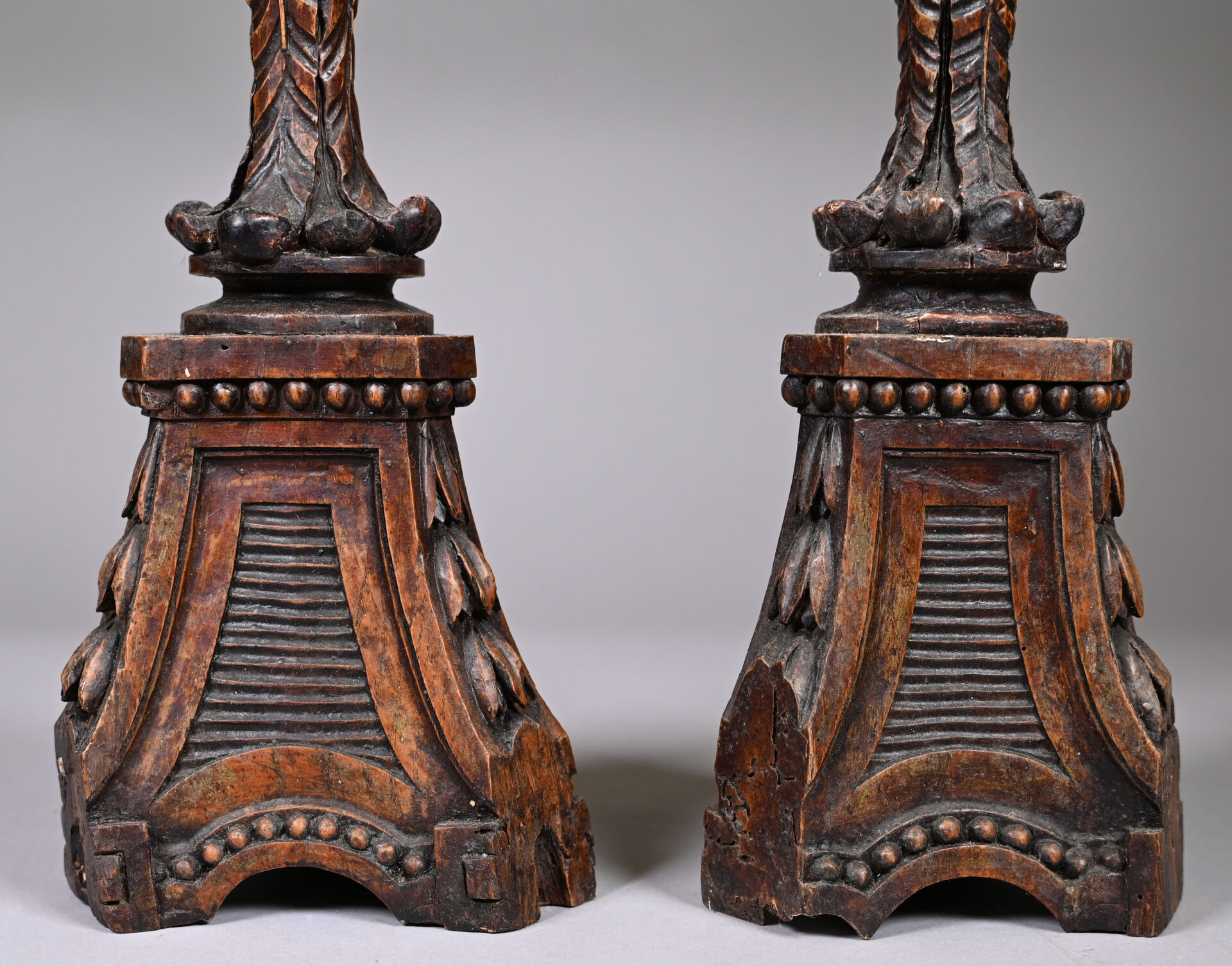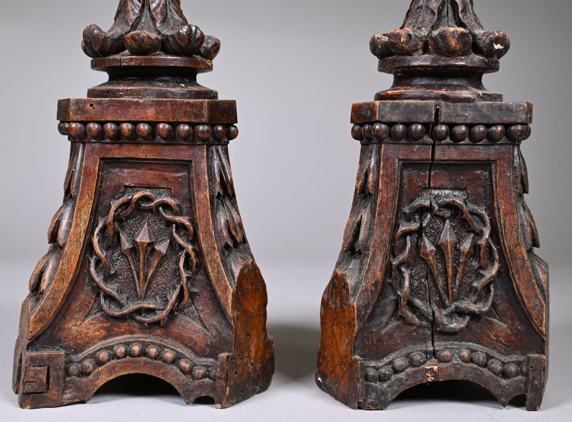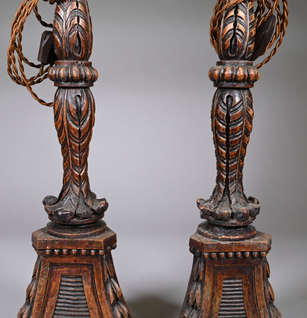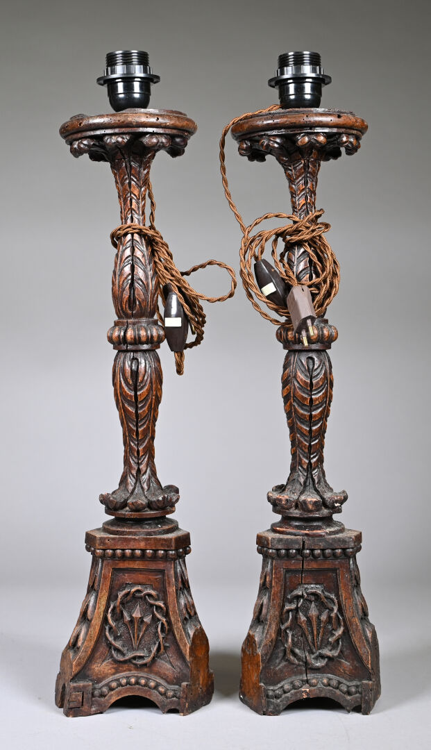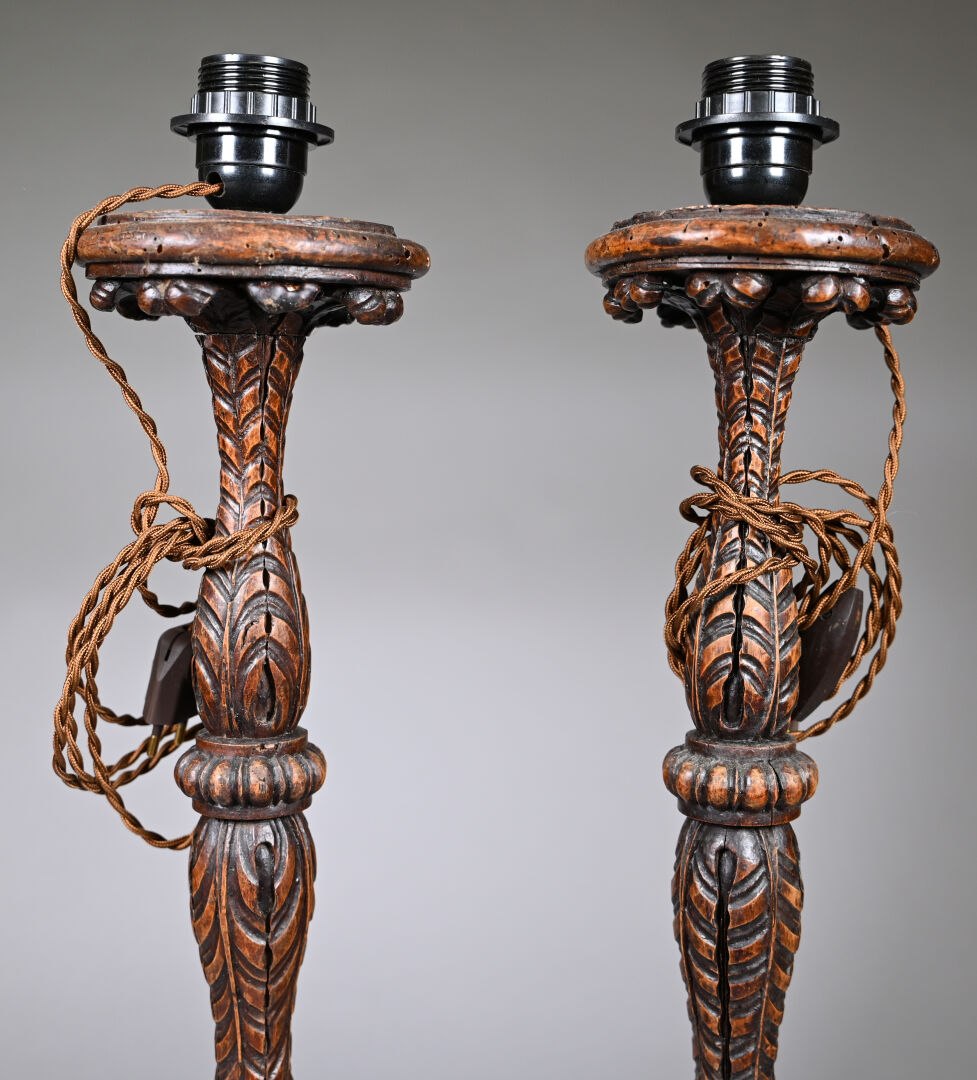 Paire de pique cierges en bois sculpté dans le goût du XVIIe siècle. Montés en lampe. Haut. : 61 cm.