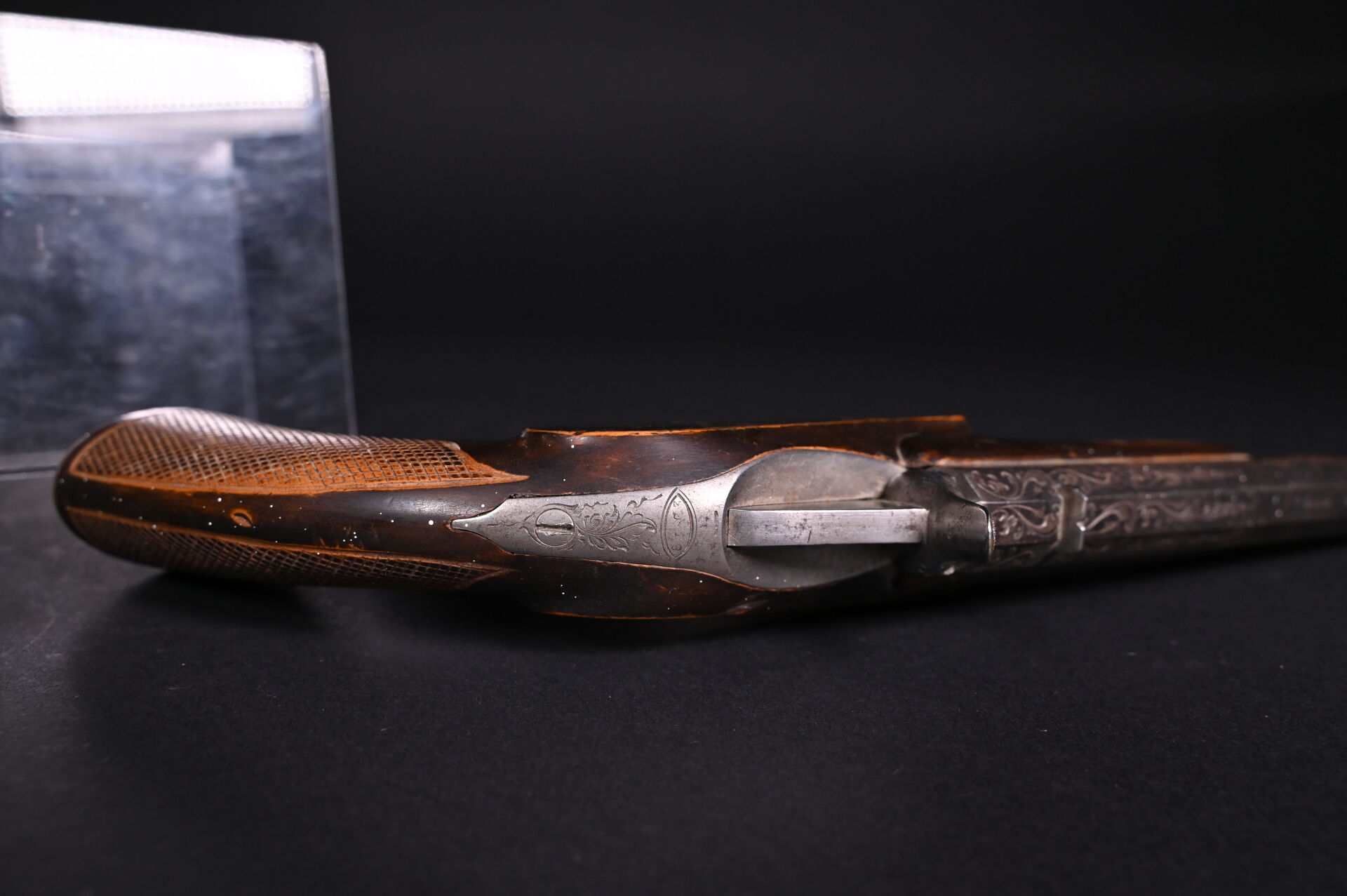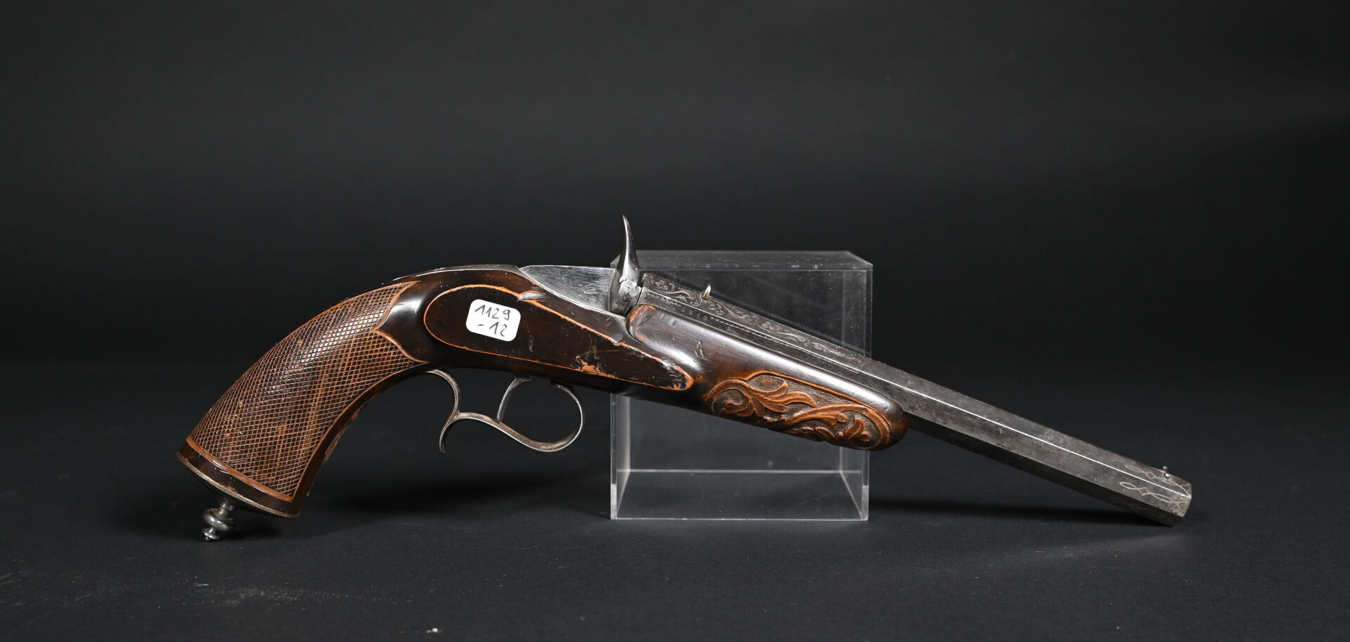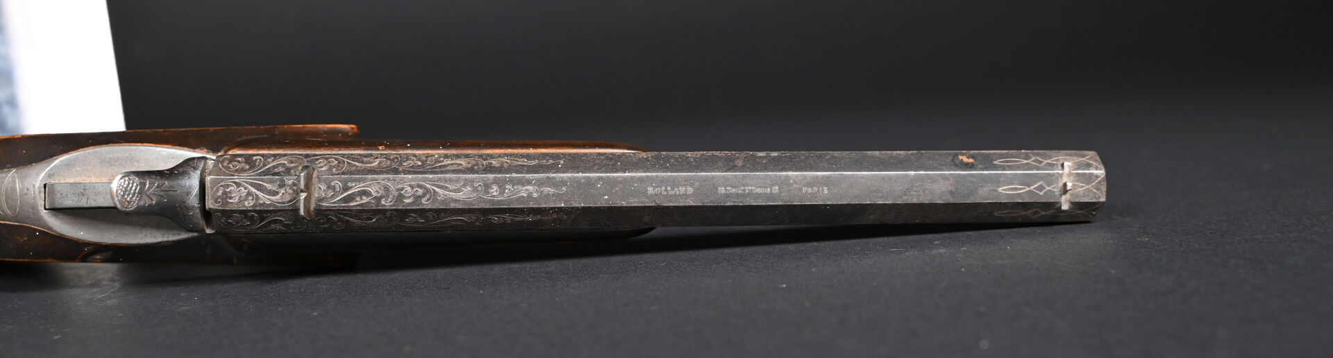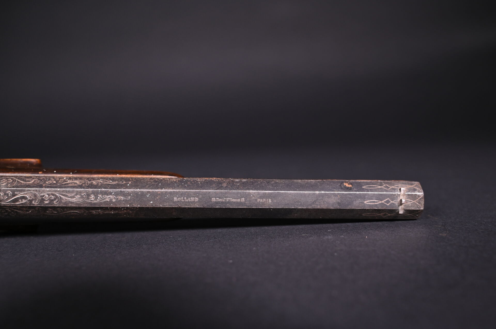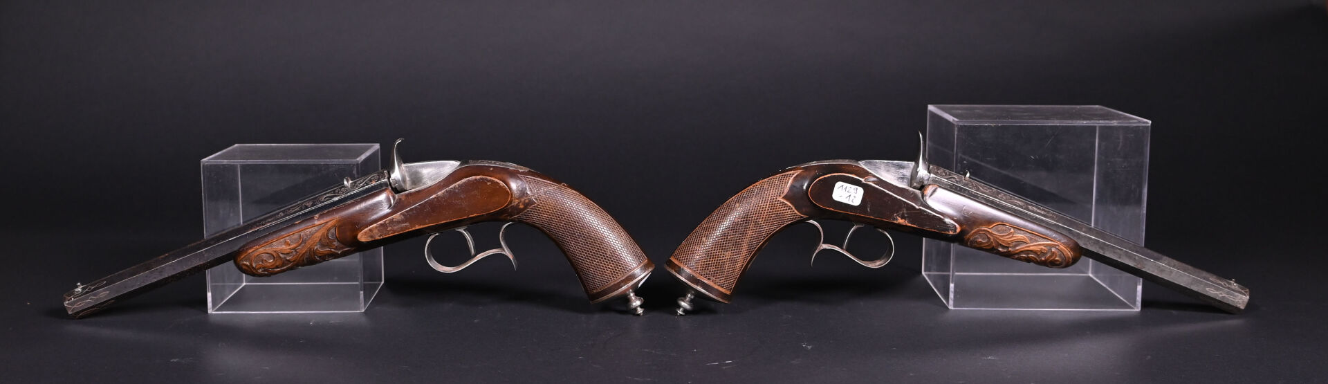 Paire de pistolets de tir, système Flaubert, calibre 6mm par Rolland à Paris. Canon bronzé lisse, gravé de volutes de feuillages, pontet à repose doigts, crosse Renaissance, quadrillé à la poignée. Une crosse recollée. Crête de chien faussé sur un des pistolets. Mécanisme fonctionnel. Catégorie D. État 2.