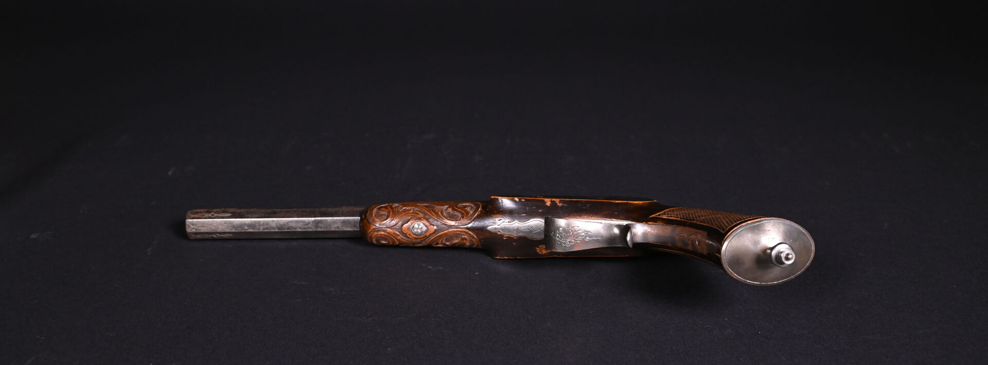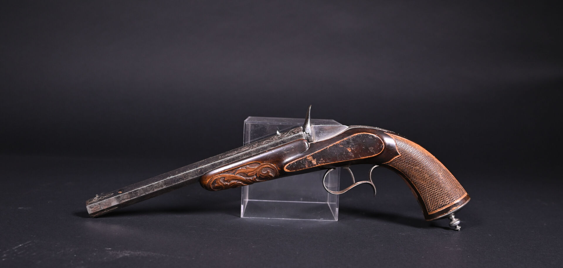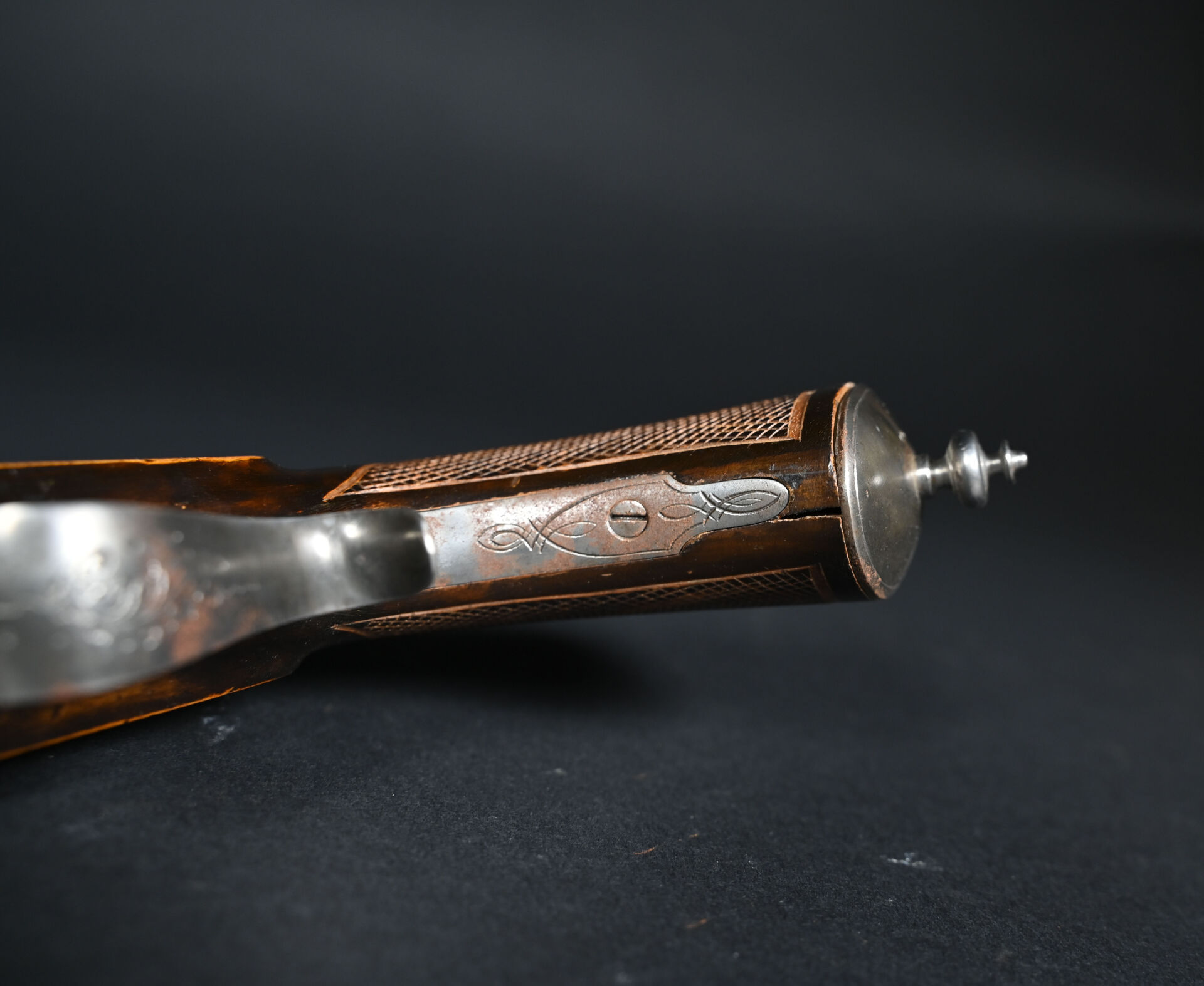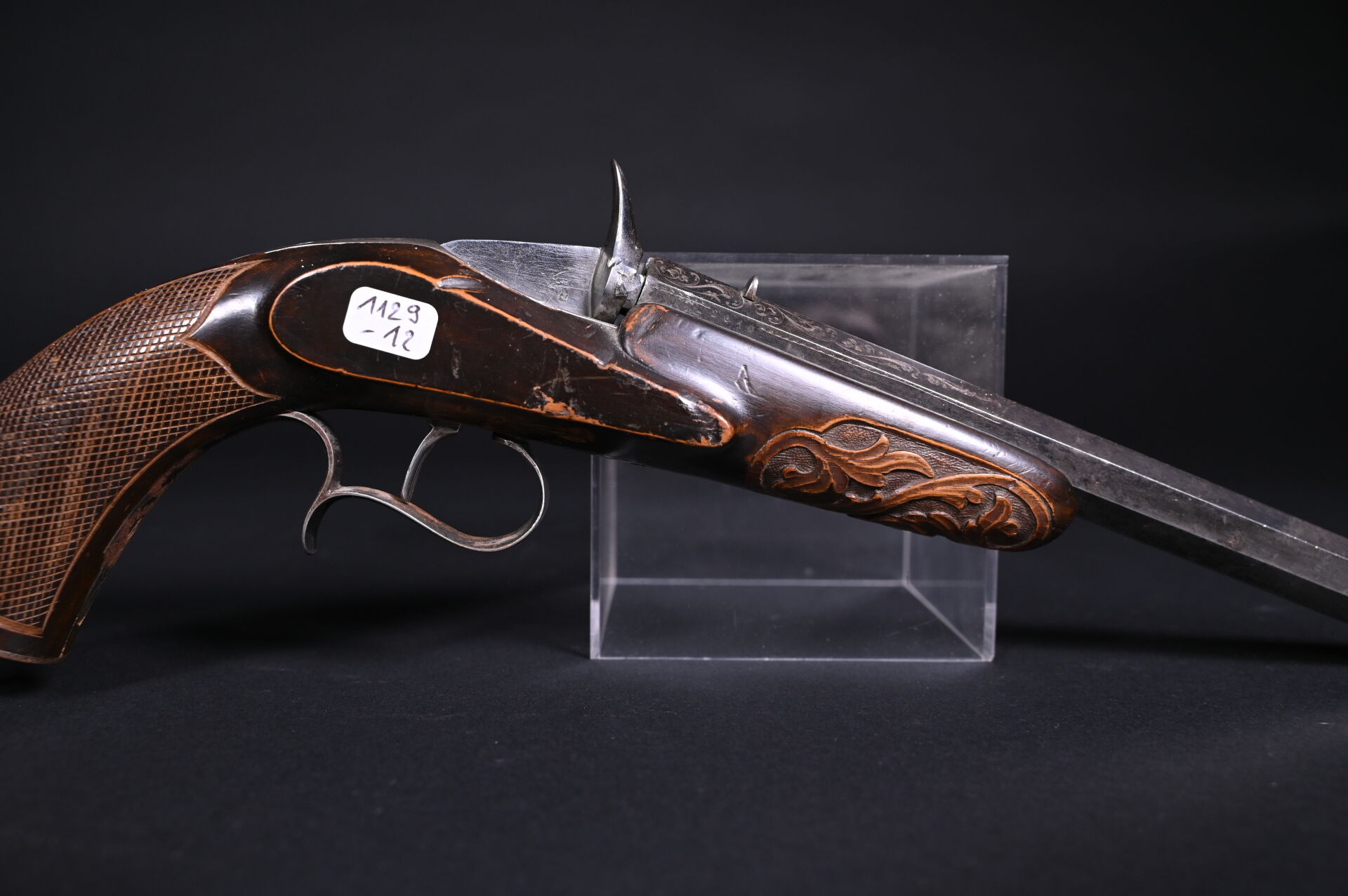 Paire de pistolets de tir, système Flaubert, calibre 6mm par Rolland à Paris. Canon bronzé lisse, gravé de volutes de feuillages, pontet à repose doigts, crosse Renaissance, quadrillé à la poignée. Une crosse recollée. Crête de chien faussé sur un des pistolets. Mécanisme fonctionnel. Catégorie D. État 2.