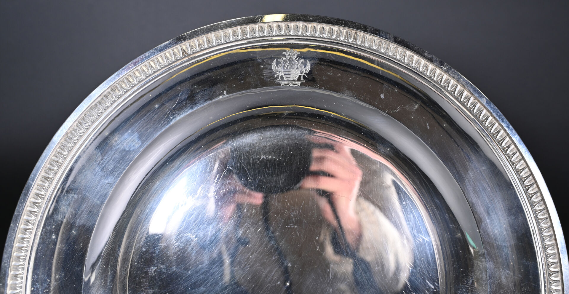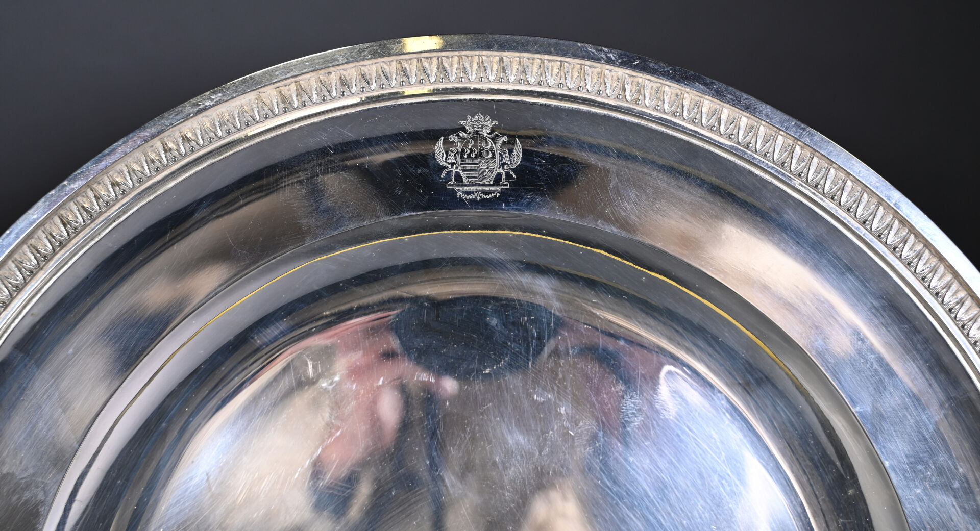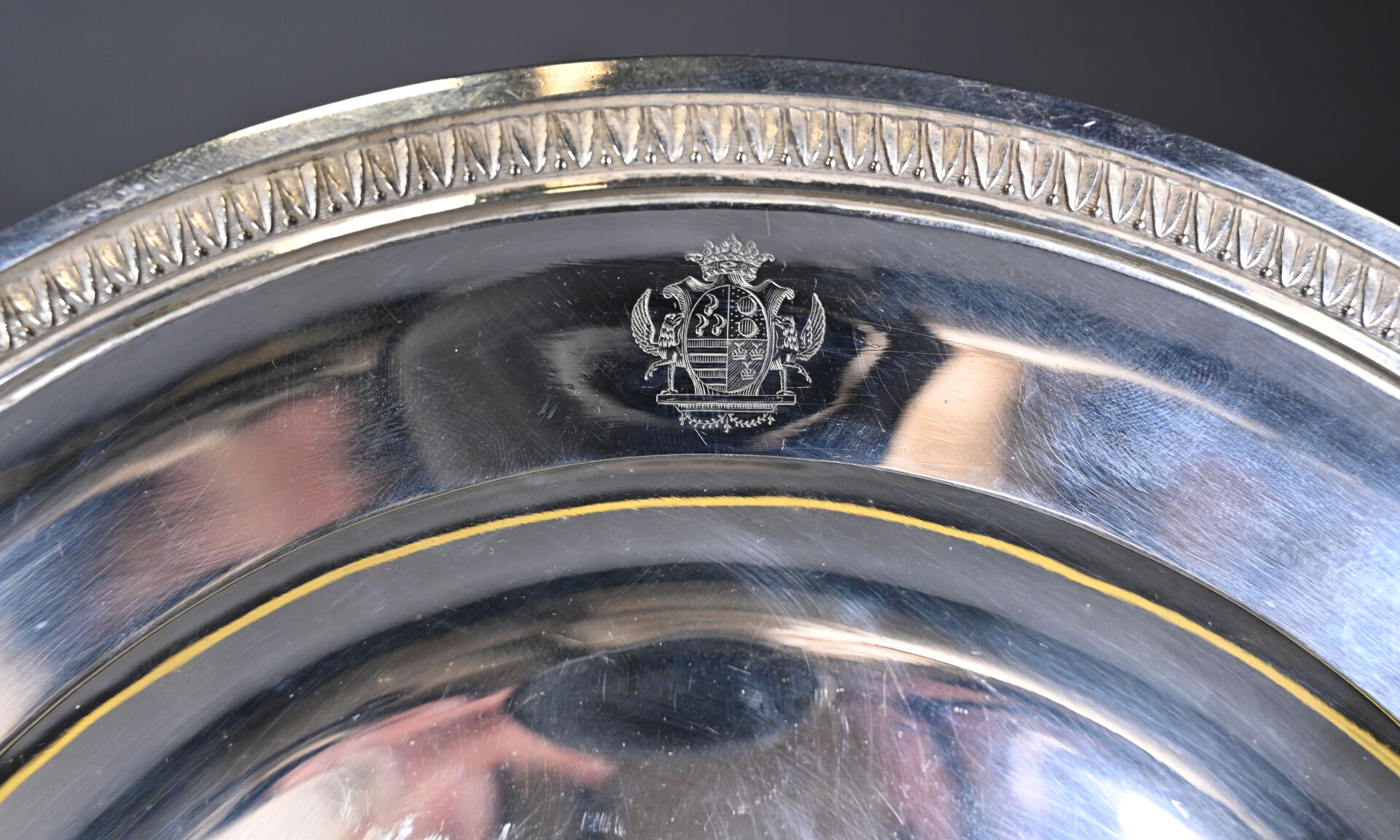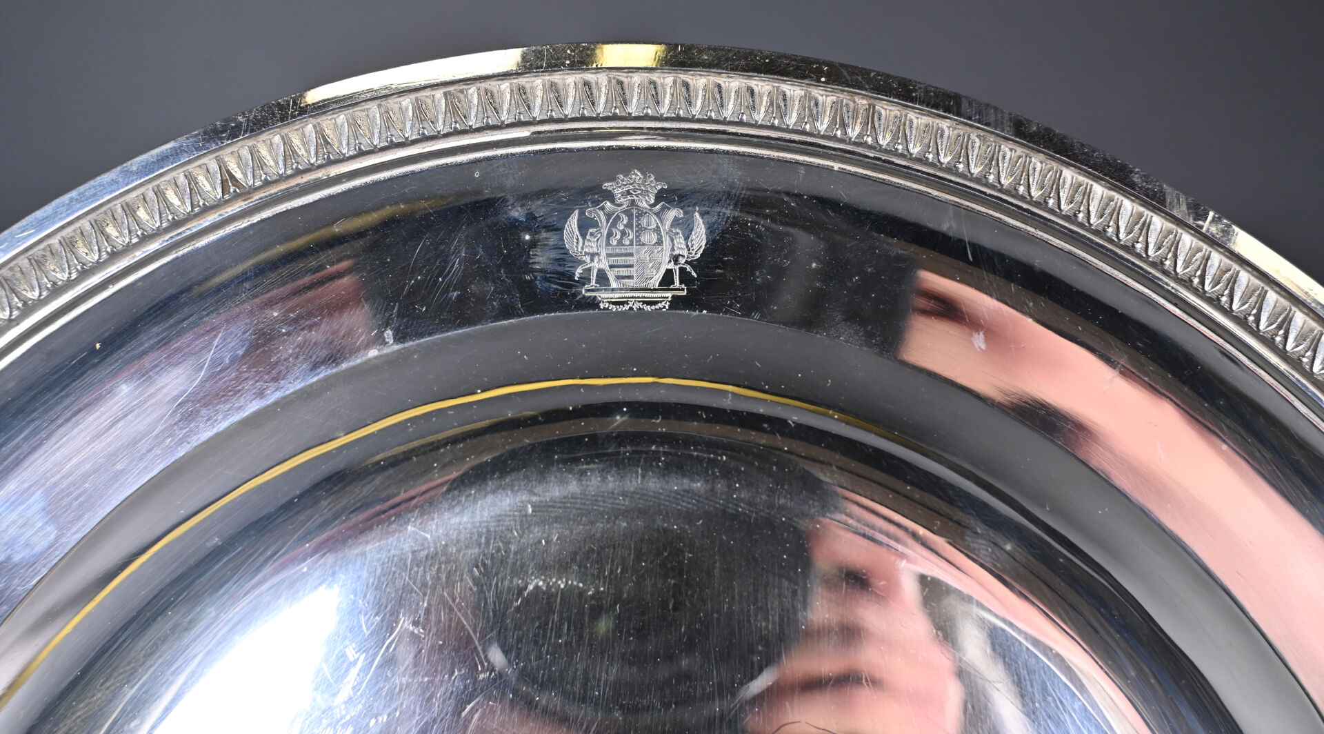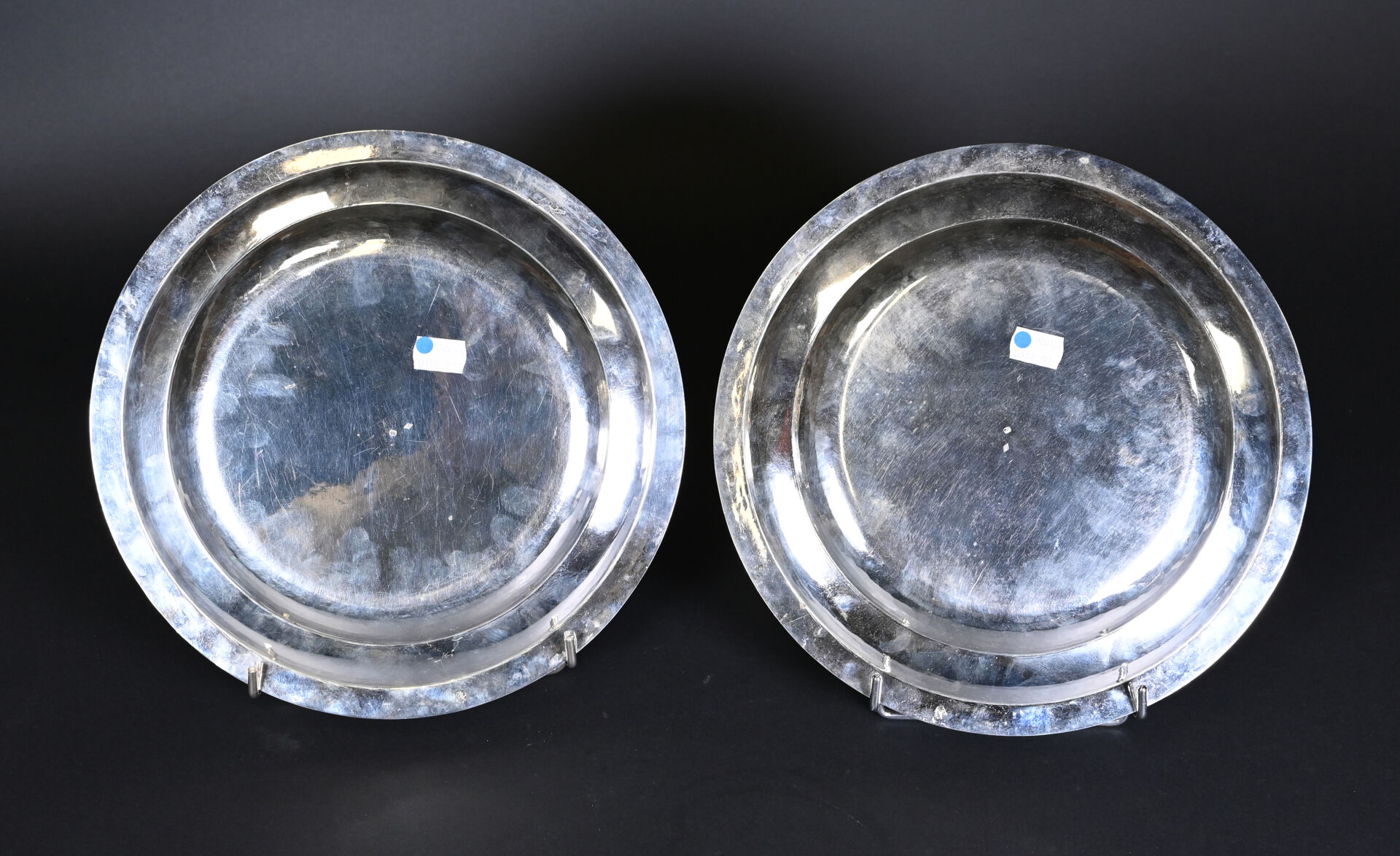 Paire de plats en argent 925/1000e, (poinçon vieillard) l’aile à décor ciselé d’armoiries au griffon sous une couronne de marquis. Orfèvre Charles DENIS NOEL MARTIN ( poinçon N.M et ancre de marine). Diam. : 30 cm – Poids total. : 1 743 g.